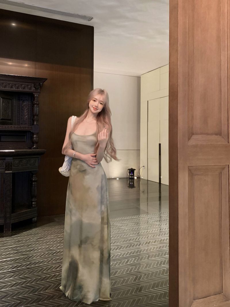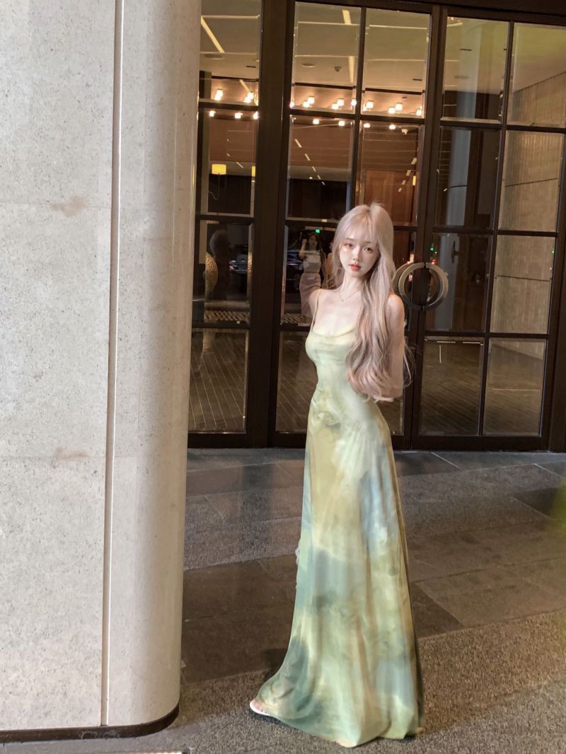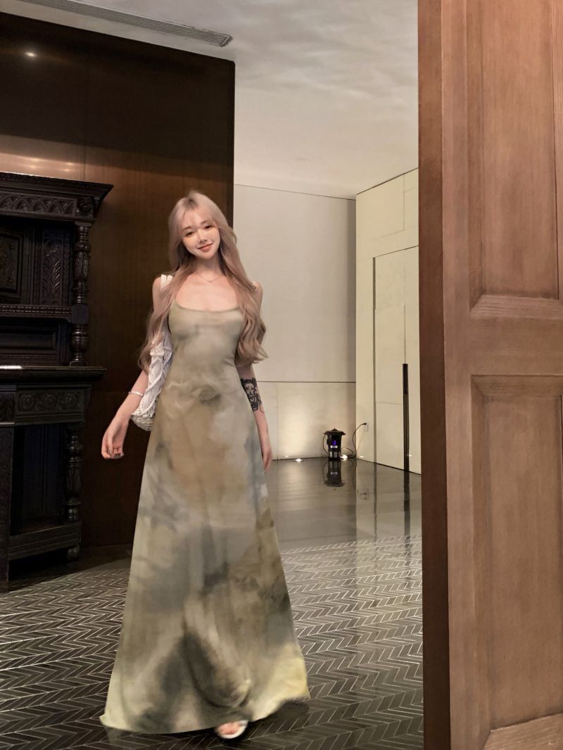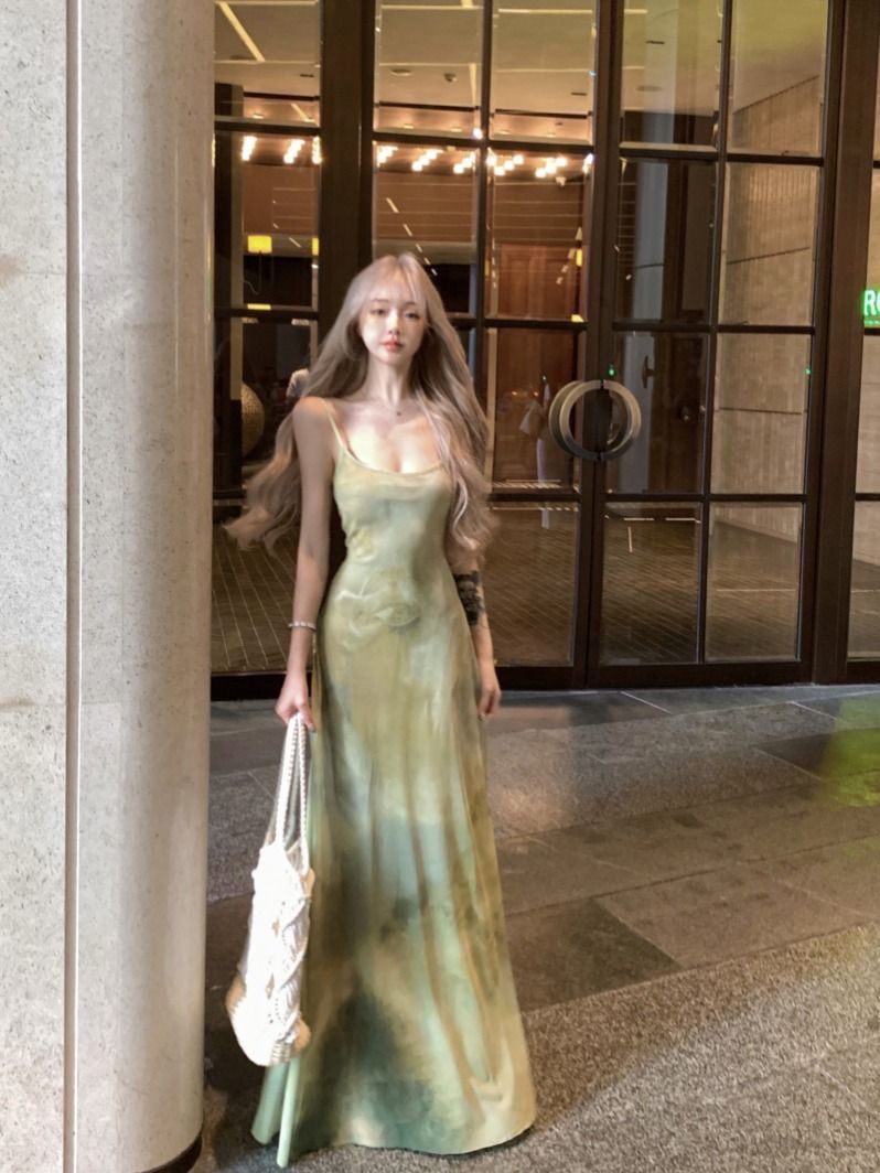 빈티지 멋진 라이트 그린 순수한 슬링 원피스 여름 새로운 인쇄 긴 원피스 우아한 녹색 틈새 슬리밍