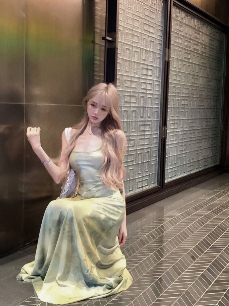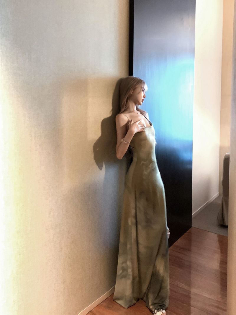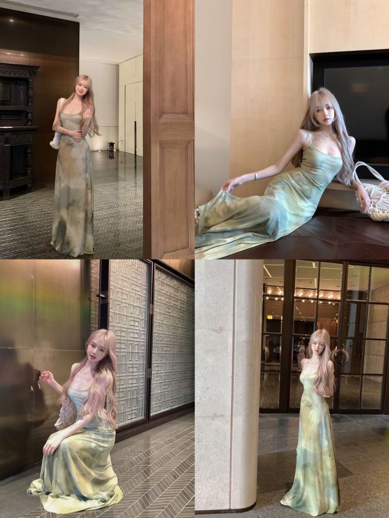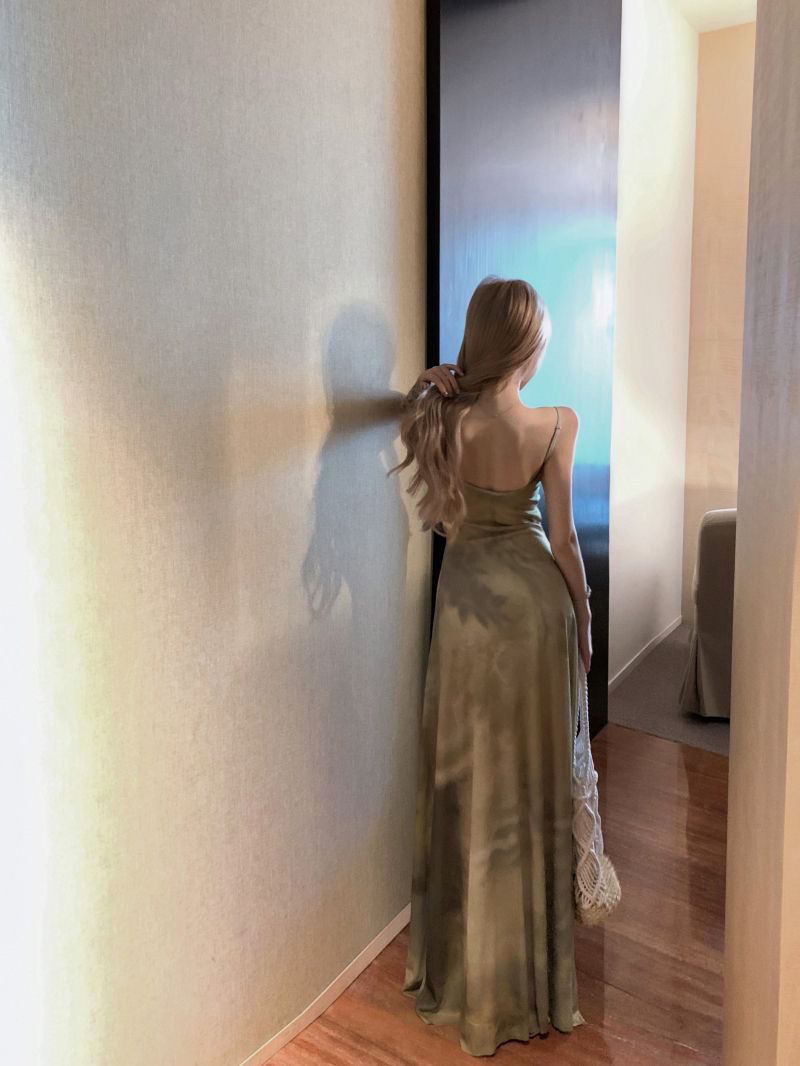 빈티지 멋진 라이트 그린 순수한 슬링 원피스 여름 새로운 인쇄 긴 원피스 우아한 녹색 틈새 슬리밍
