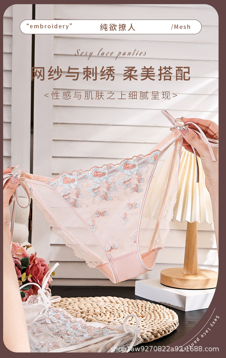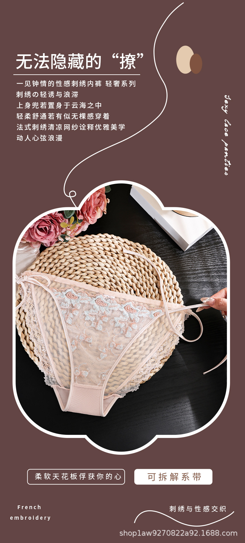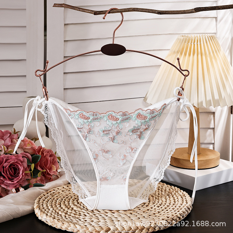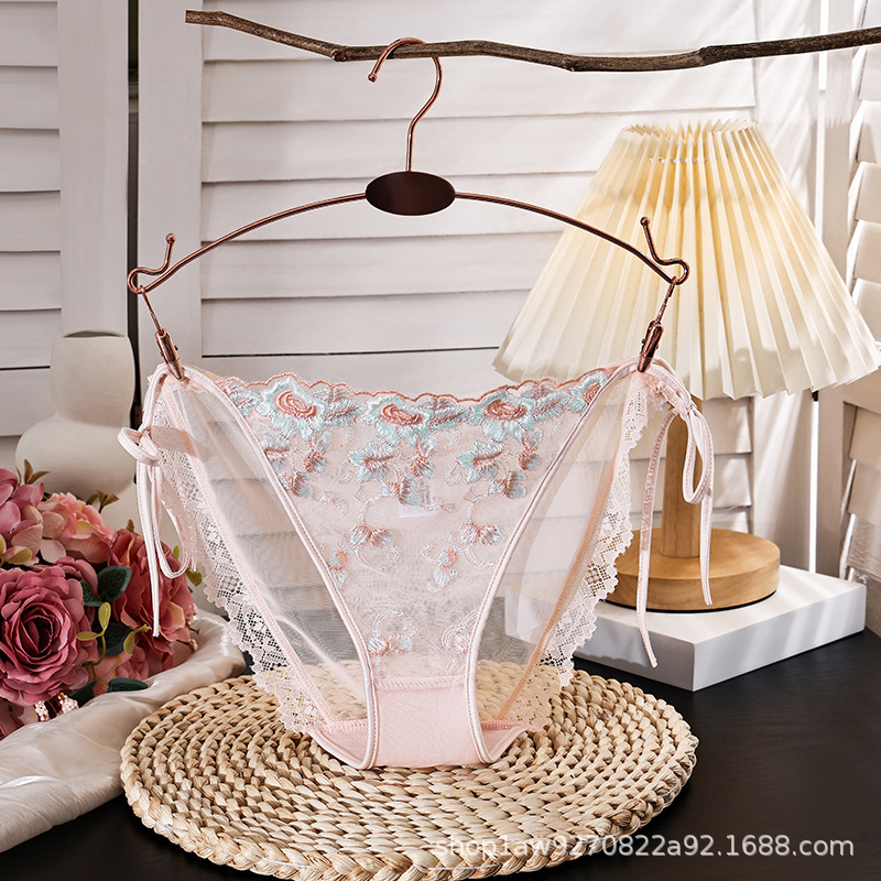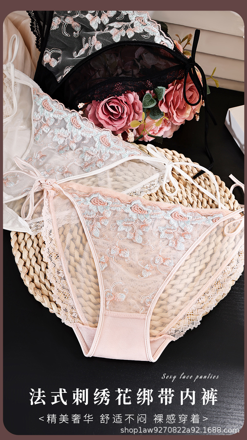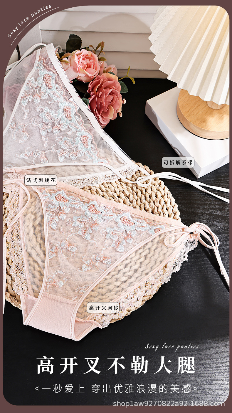 여성용 프렌치 섹시 자수 레이스 팬티, 로우 웨이스트, 하이 슬릿, 타이, 순수한 욕망을 해소할 수 있는 여성용 달콤한 메쉬 팬티