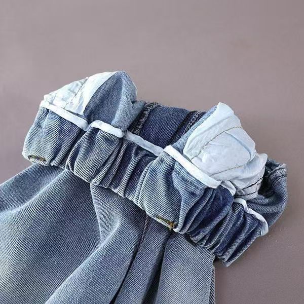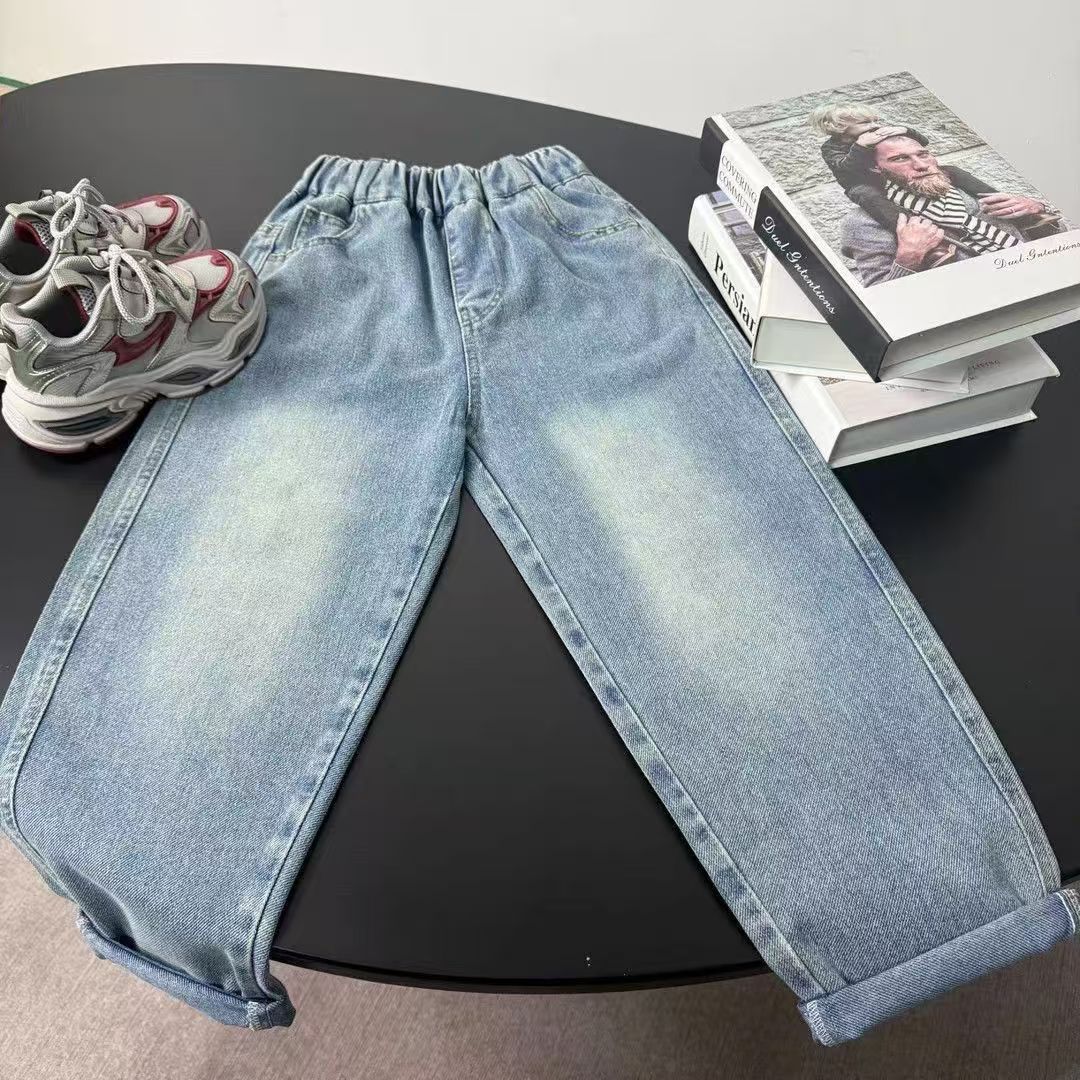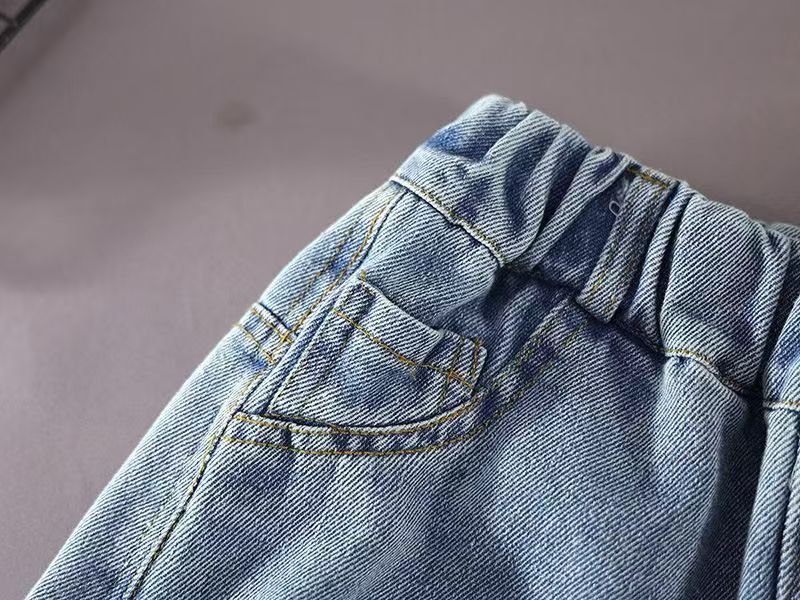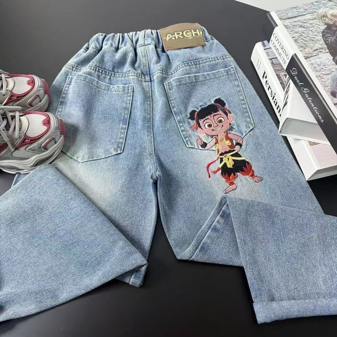 봄과 가을 새로운 스타일의 청바지 소년과 소녀를위한 한국 스타일 맞춤형 스플 라이스 루즈웨어 봄 의류 Nezha 바지 고탄성 유행 어린이
