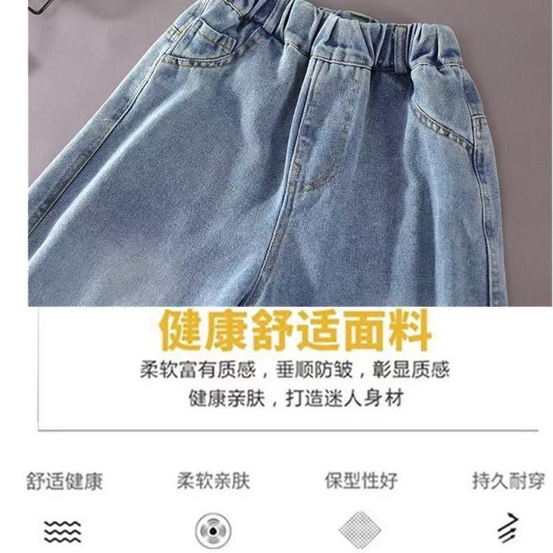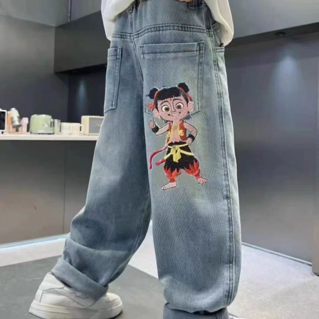 봄과 가을 새로운 스타일의 청바지 소년과 소녀를위한 한국 스타일 맞춤형 스플 라이스 루즈웨어 봄 의류 Nezha 바지 고탄성 유행 어린이스토어 가기