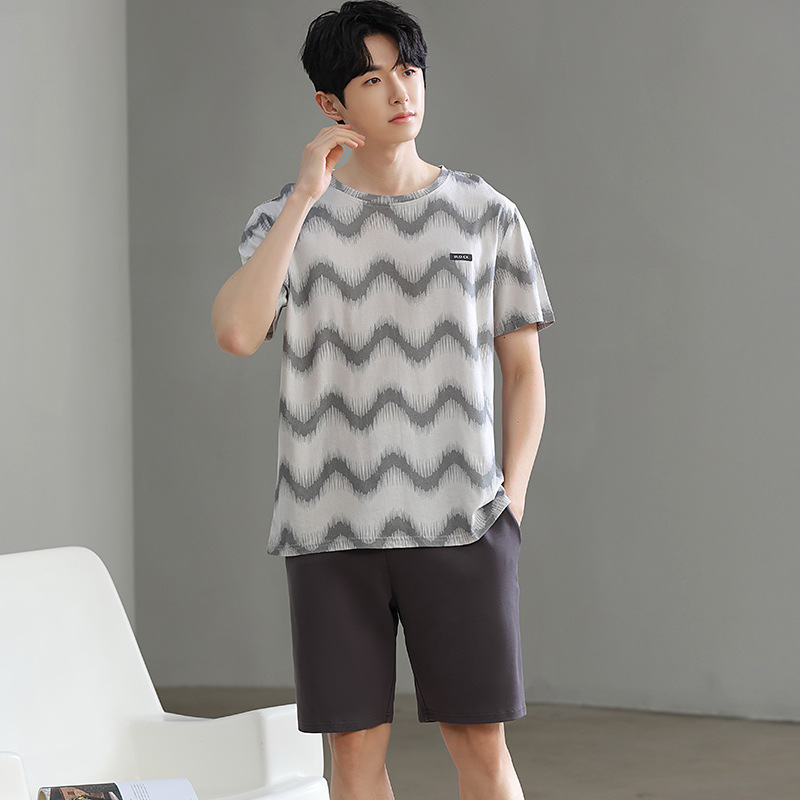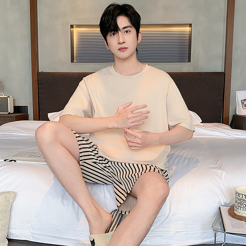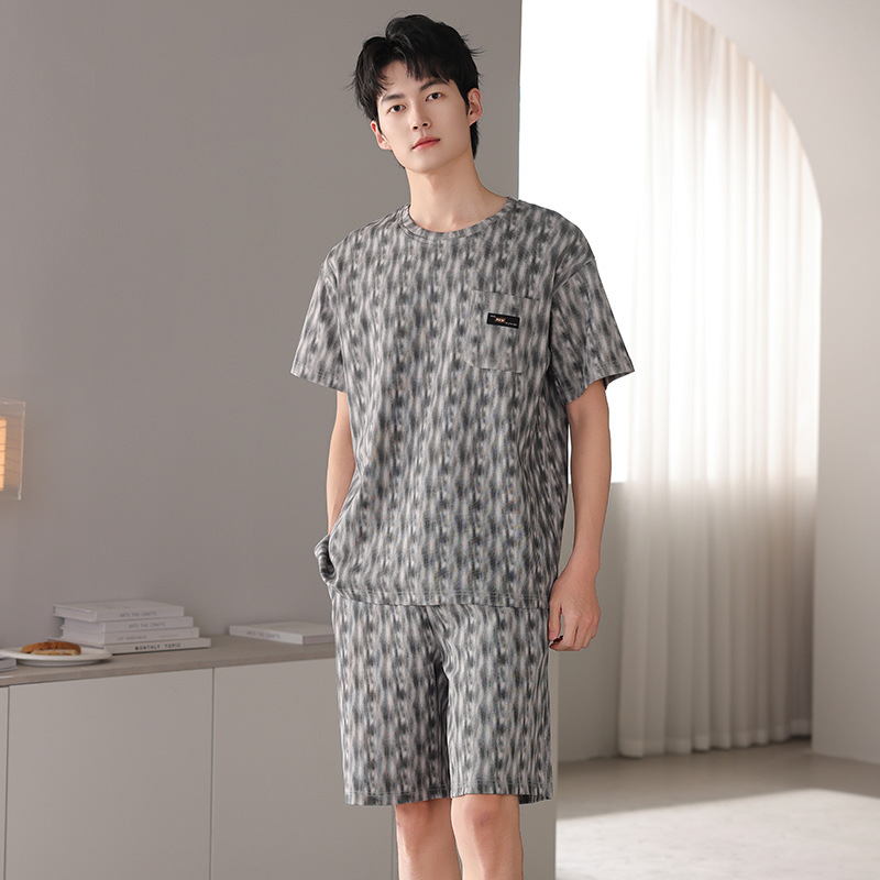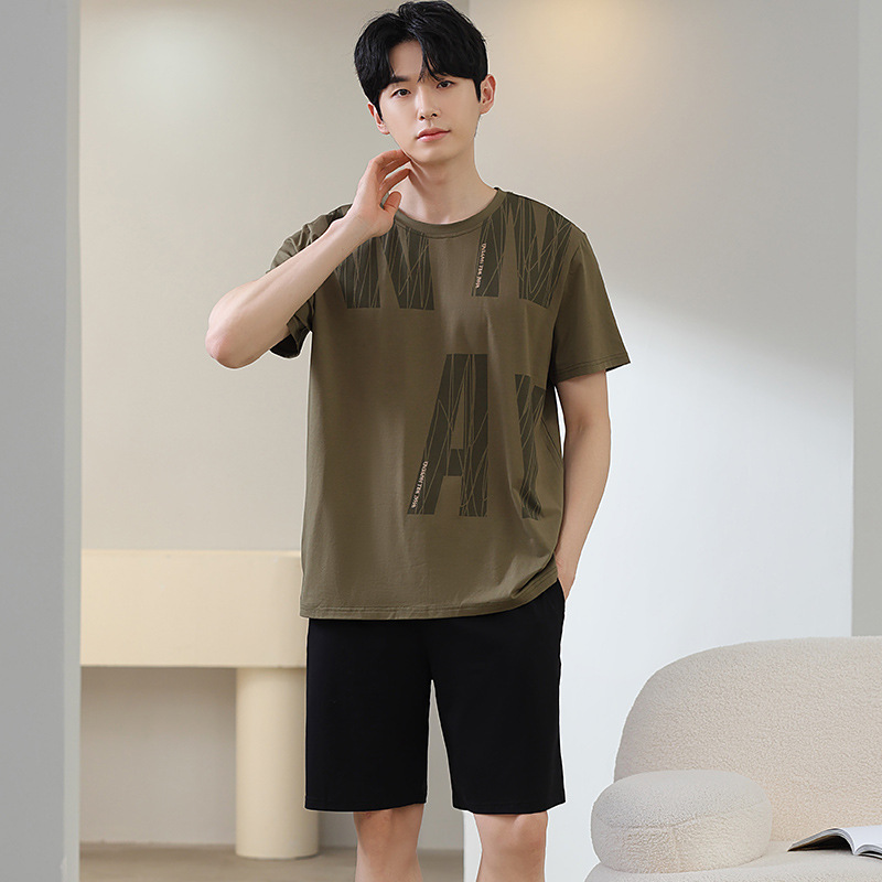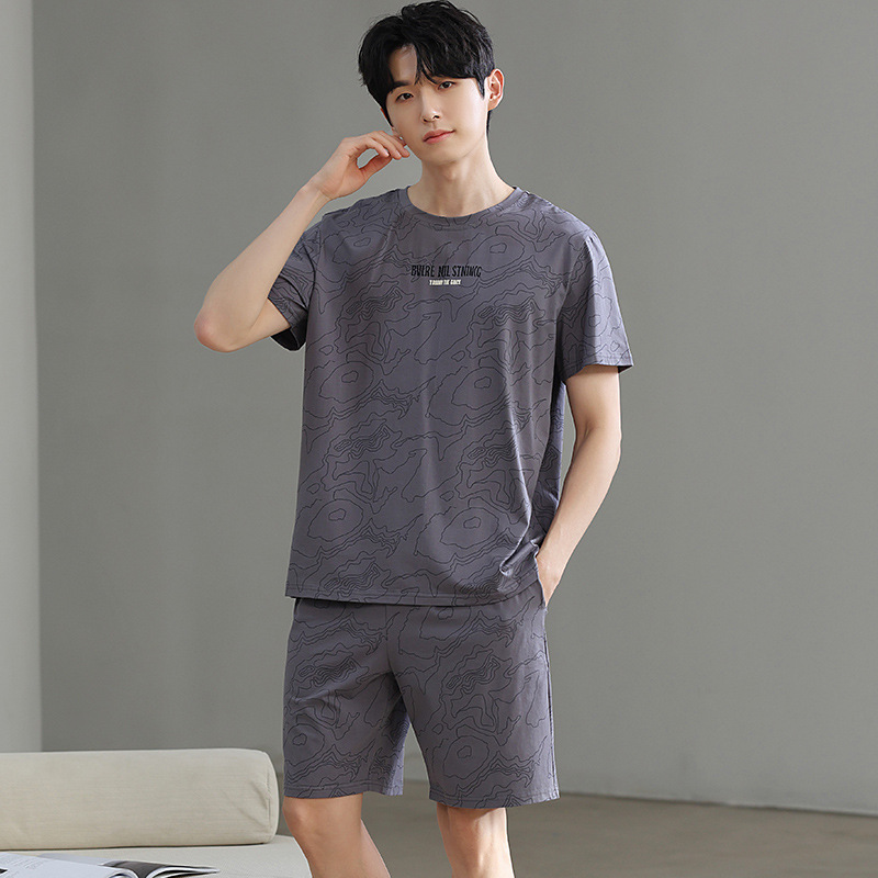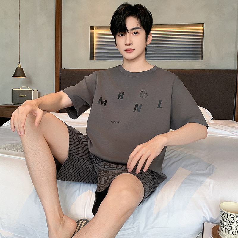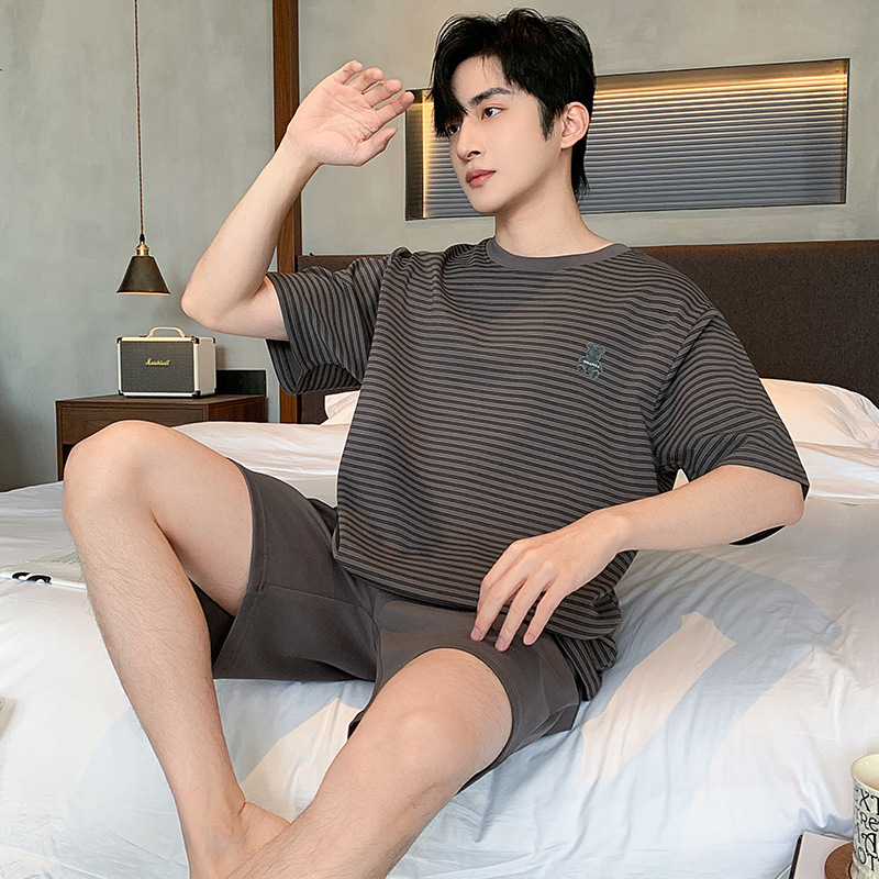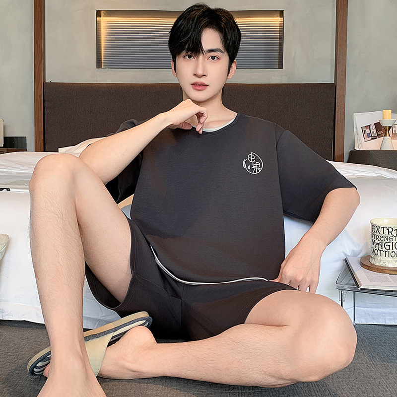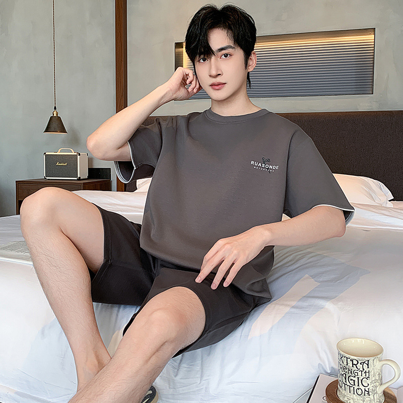 한국식 고급 순면 남성용 여름 잠옷, 라운드넥 반팔 반바지, 루즈핏, 큰 사이즈, 외출복으로도 활용 가능, 청소년 홈웨어스토어 가기