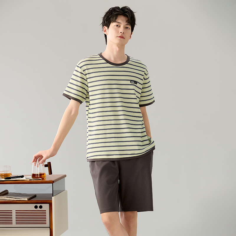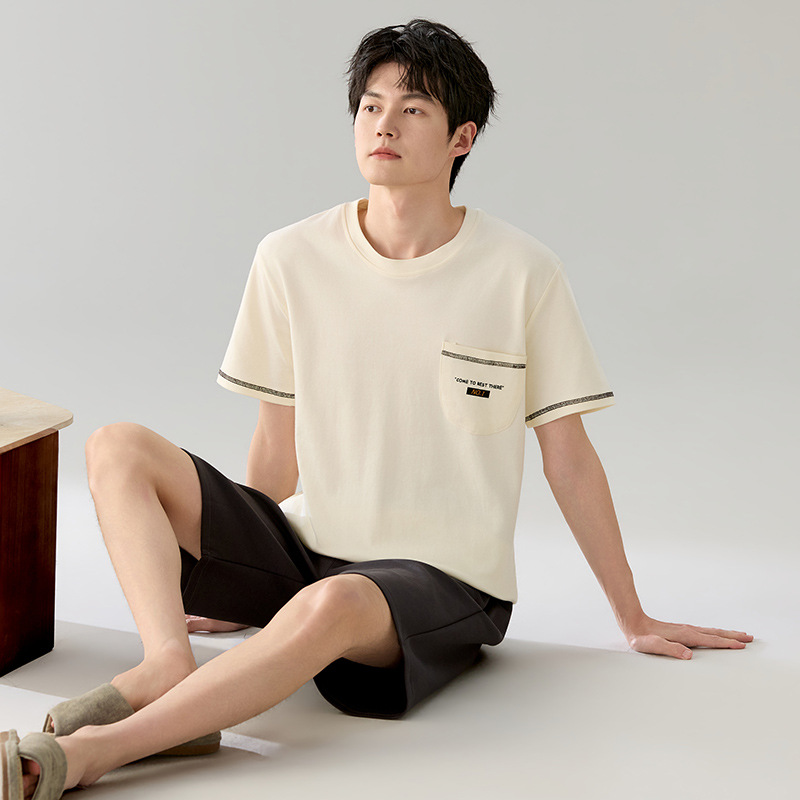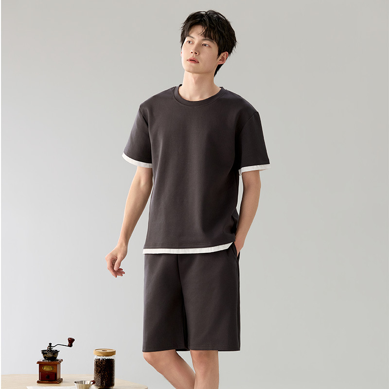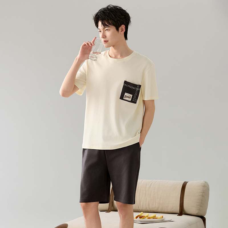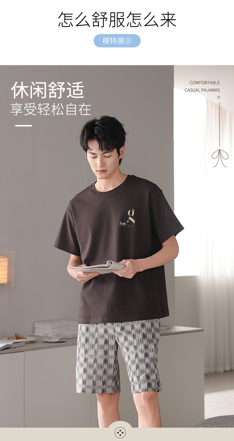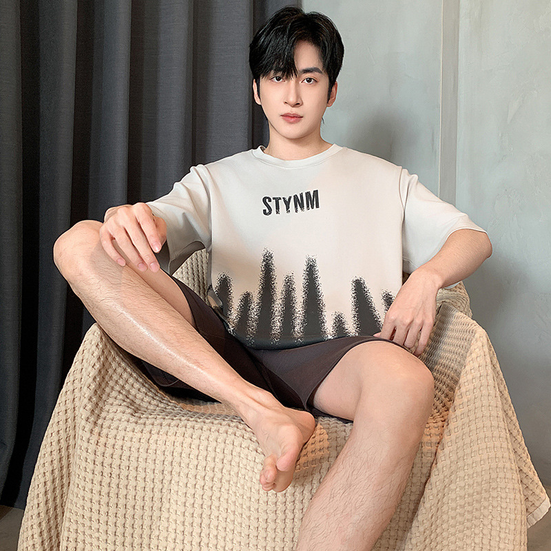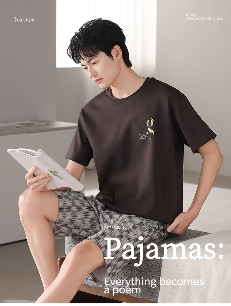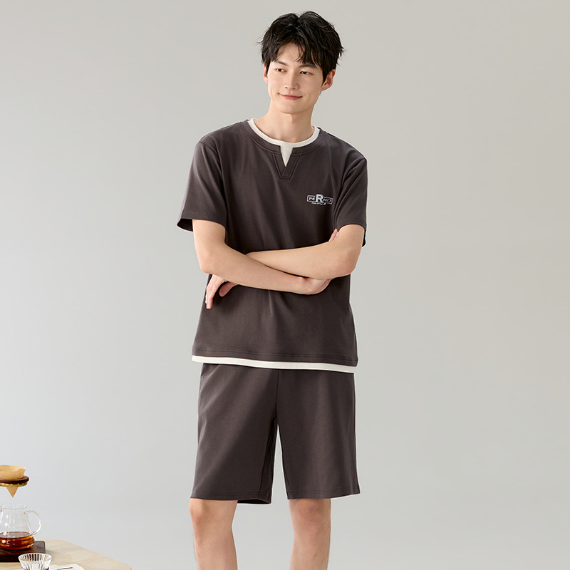 한국식 고급 순면 남성용 여름 잠옷, 라운드넥 반팔 반바지, 루즈핏, 큰 사이즈, 외출복으로도 활용 가능, 청소년 홈웨어스토어 가기