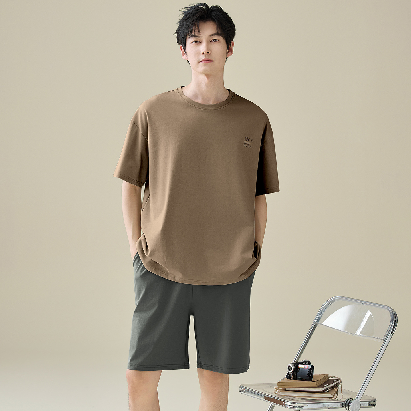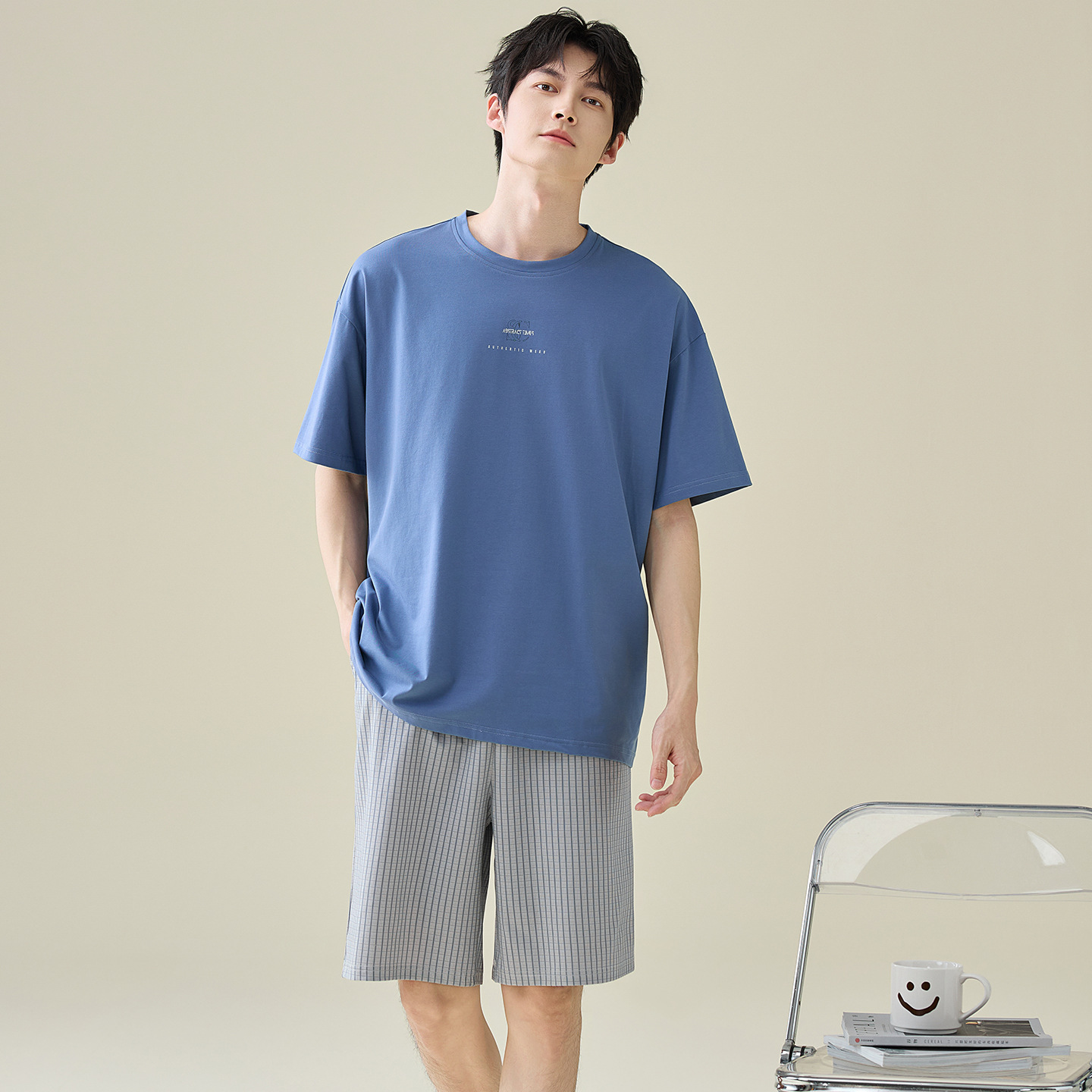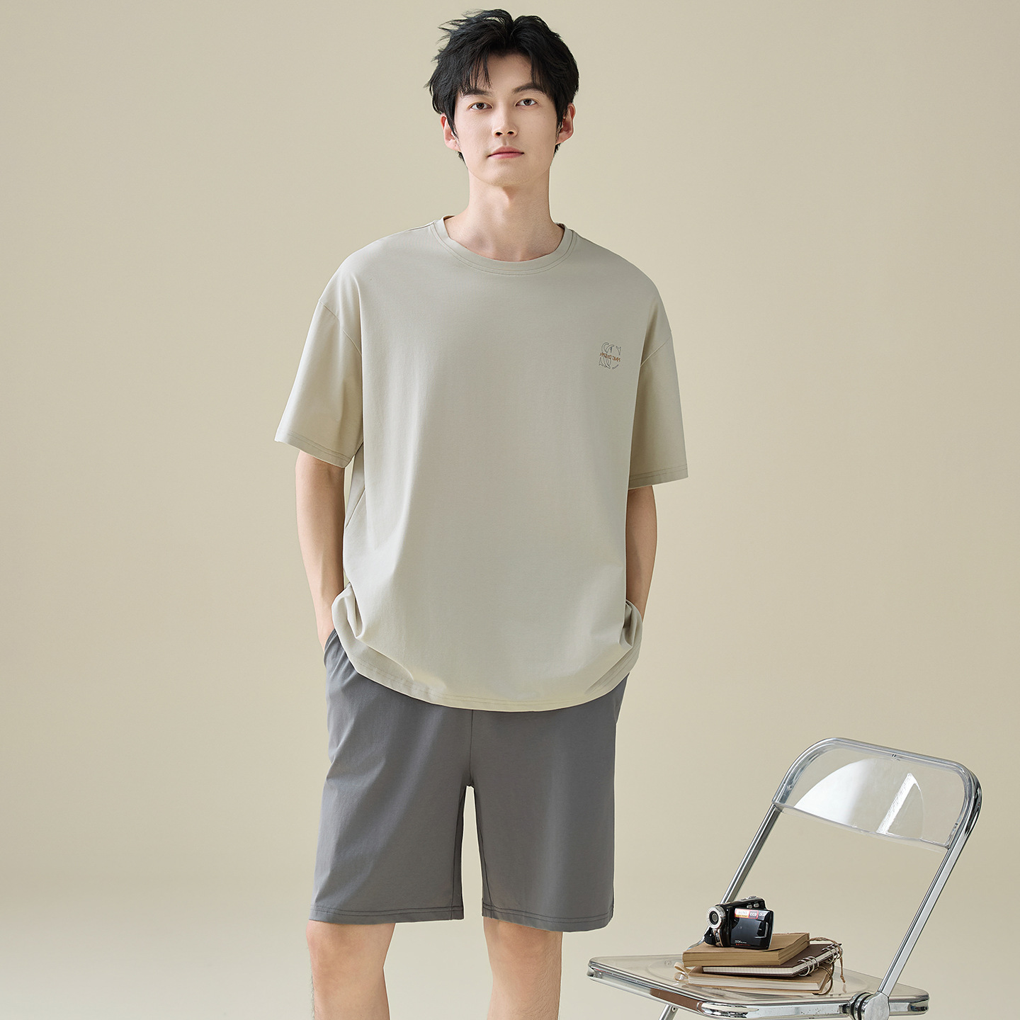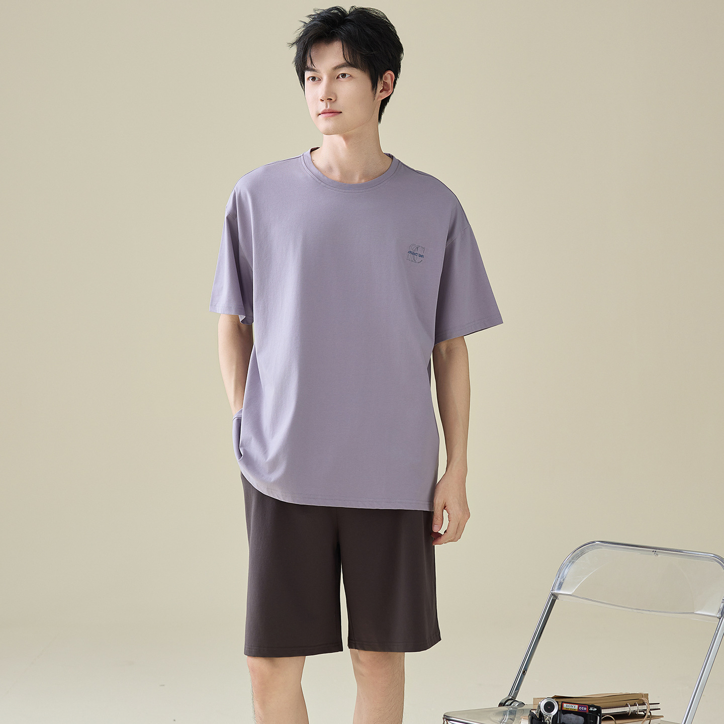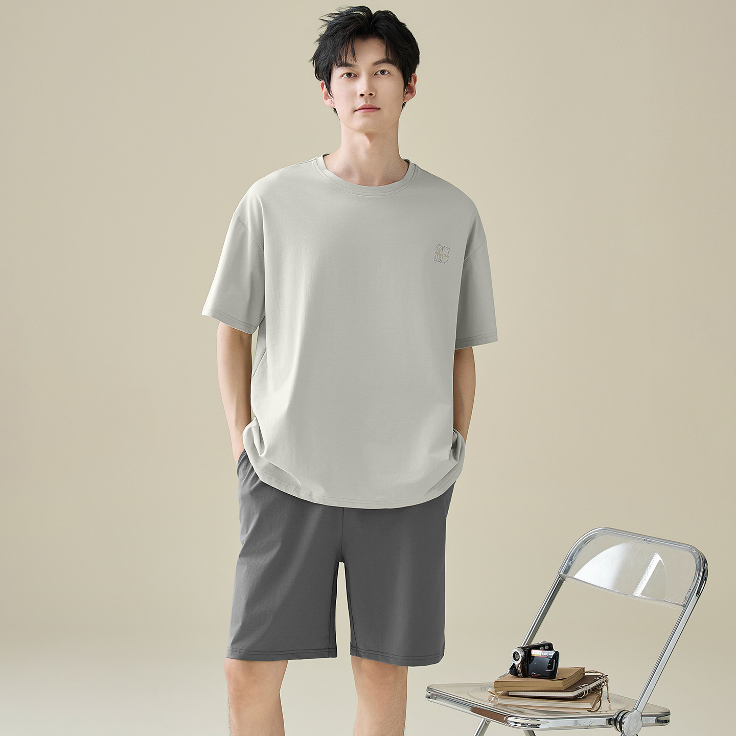 한국식 고급 순면 남성용 여름 잠옷, 라운드넥 반팔 반바지, 루즈핏, 큰 사이즈, 외출복으로도 활용 가능, 청소년 홈웨어스토어 가기