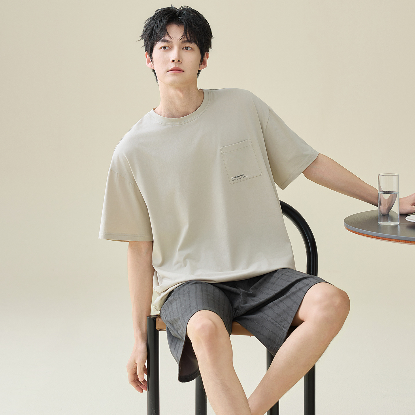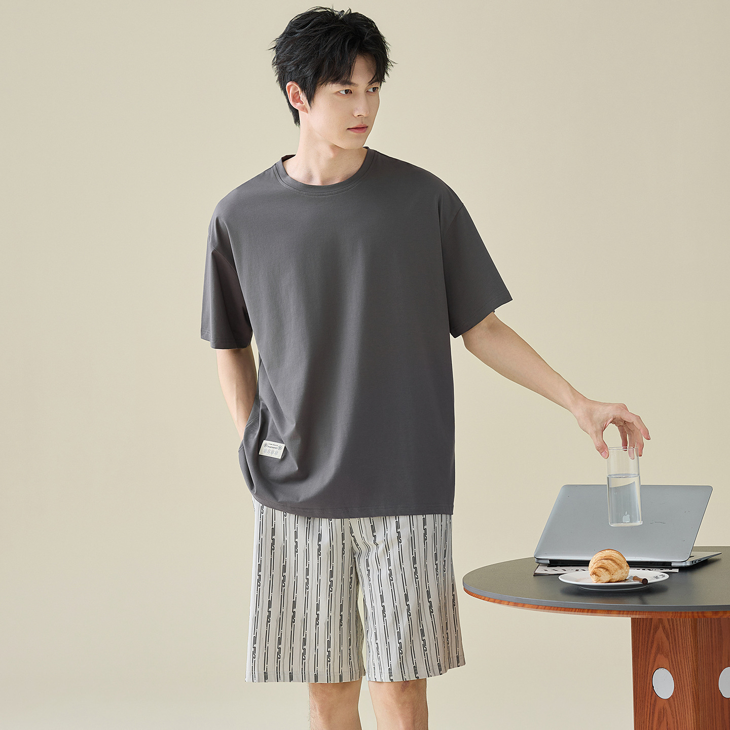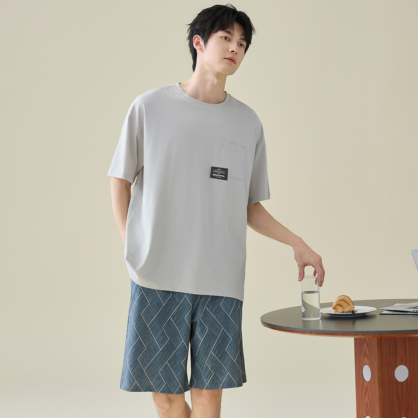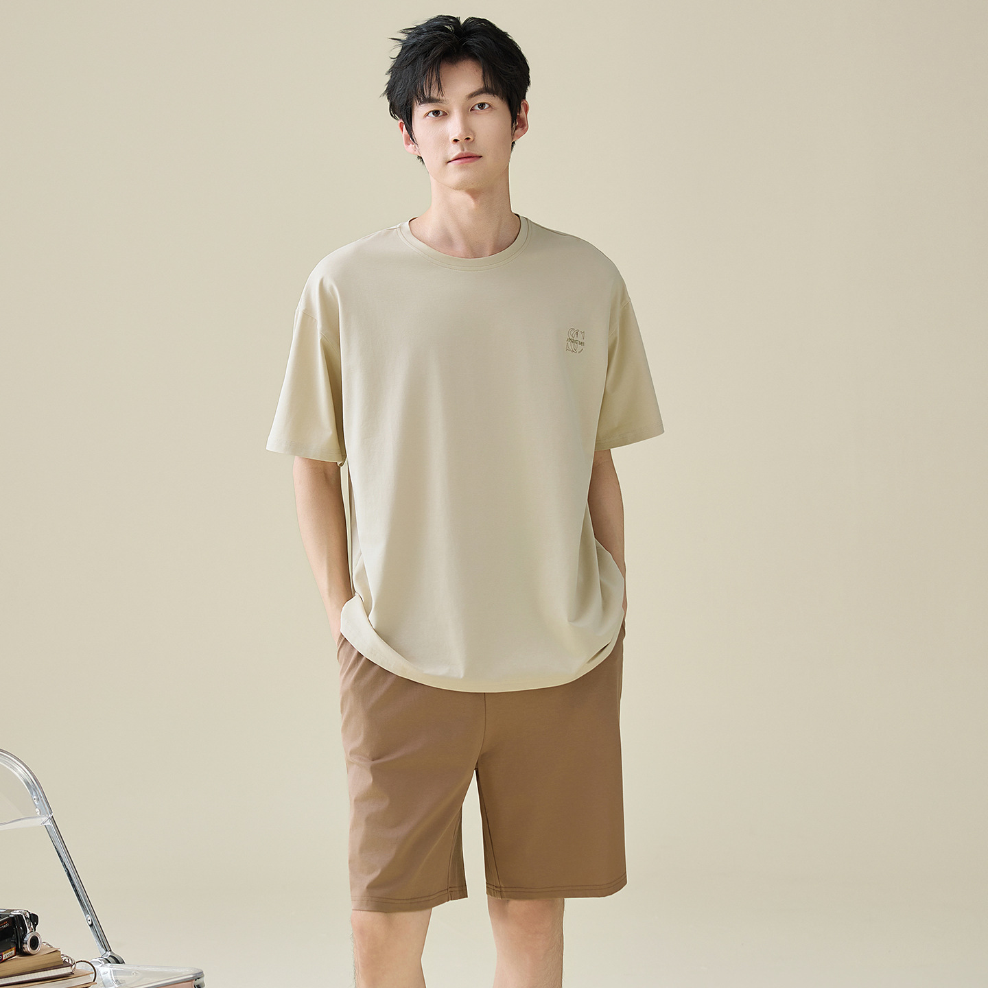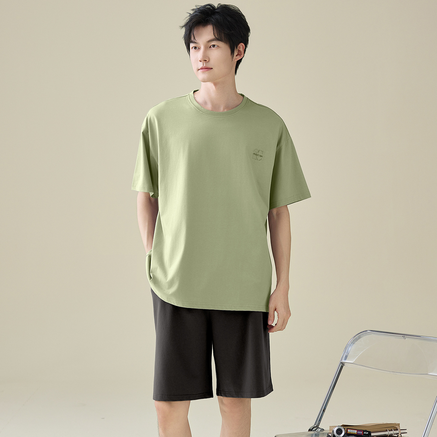 한국식 고급 순면 남성용 여름 잠옷, 라운드넥 반팔 반바지, 루즈핏, 큰 사이즈, 외출복으로도 활용 가능, 청소년 홈웨어스토어 가기