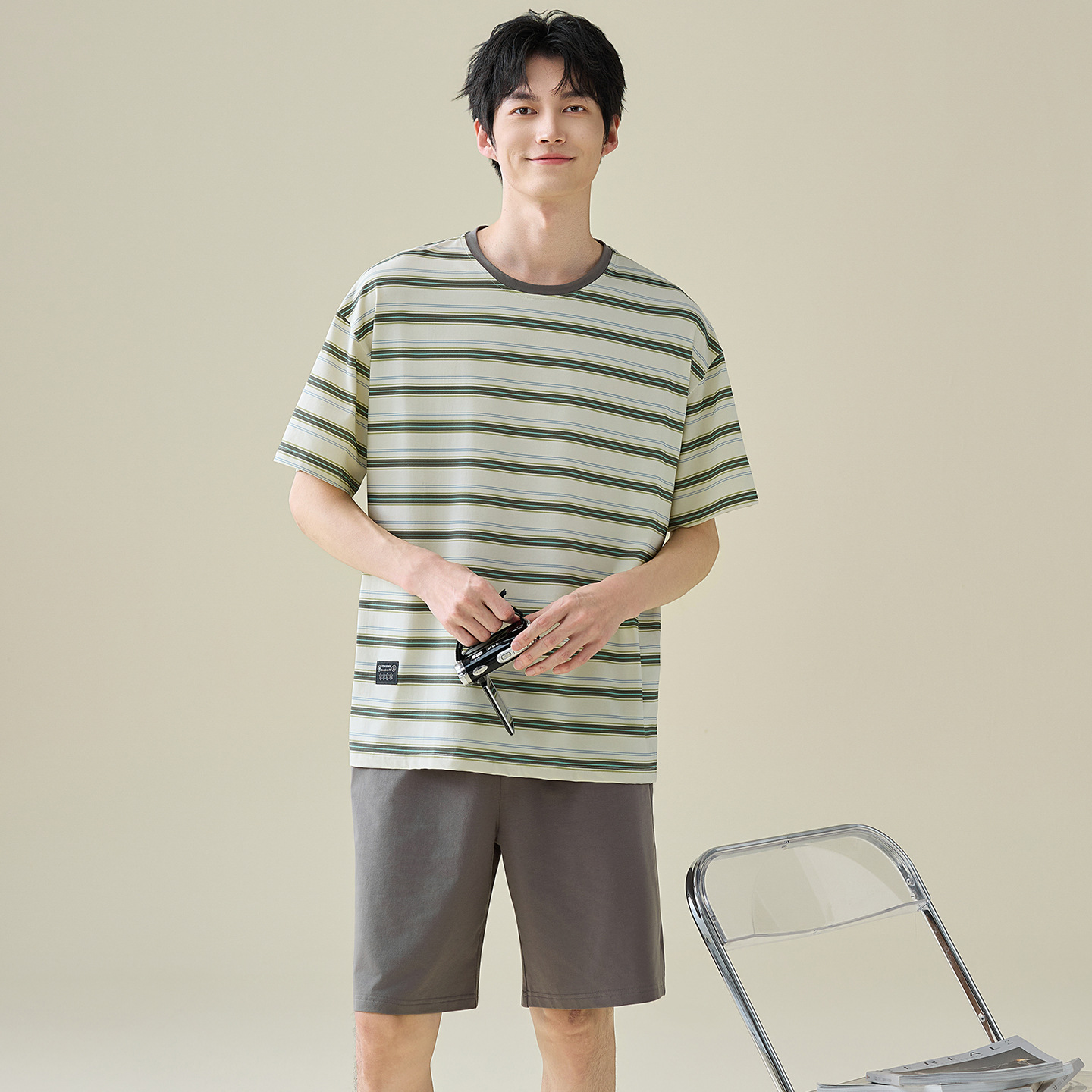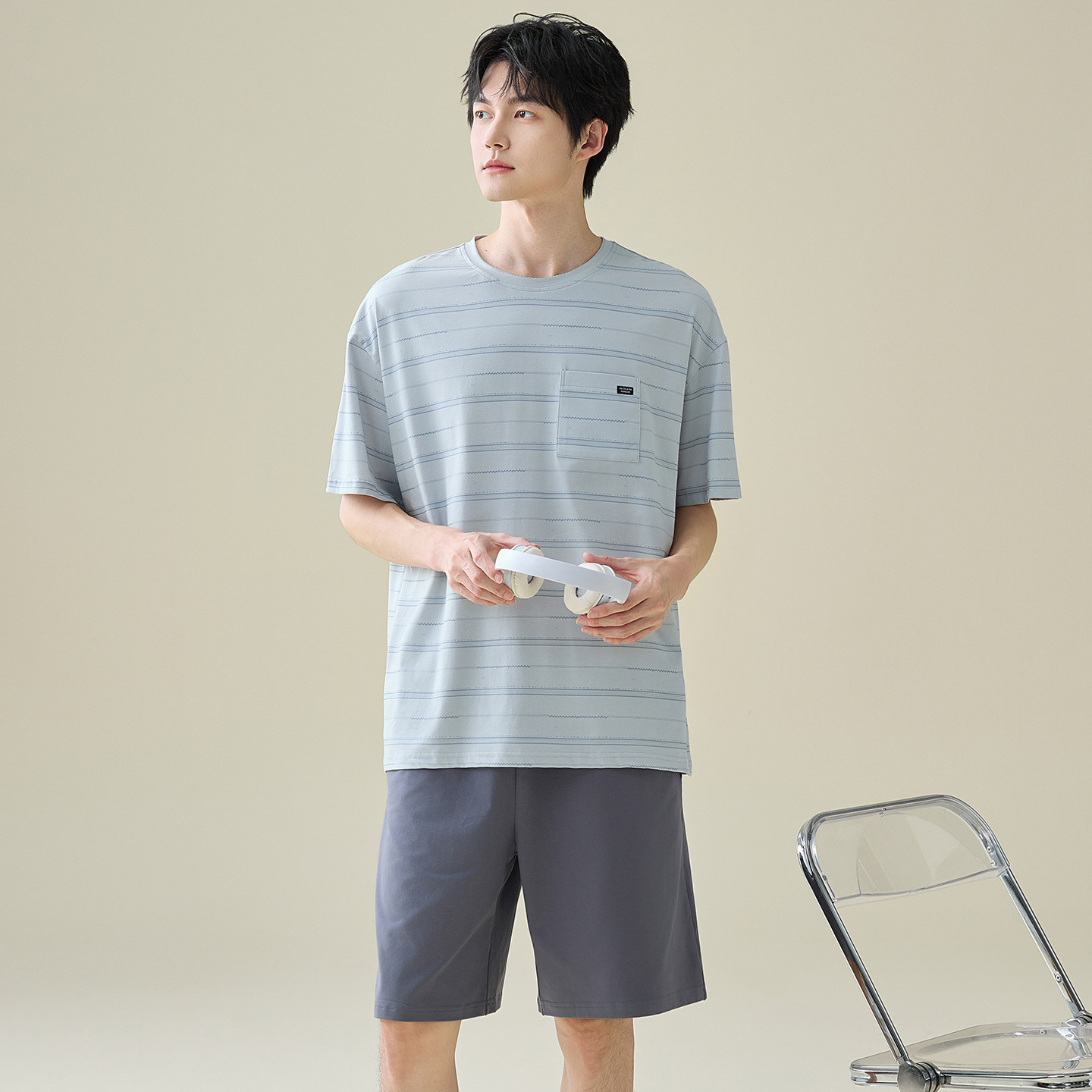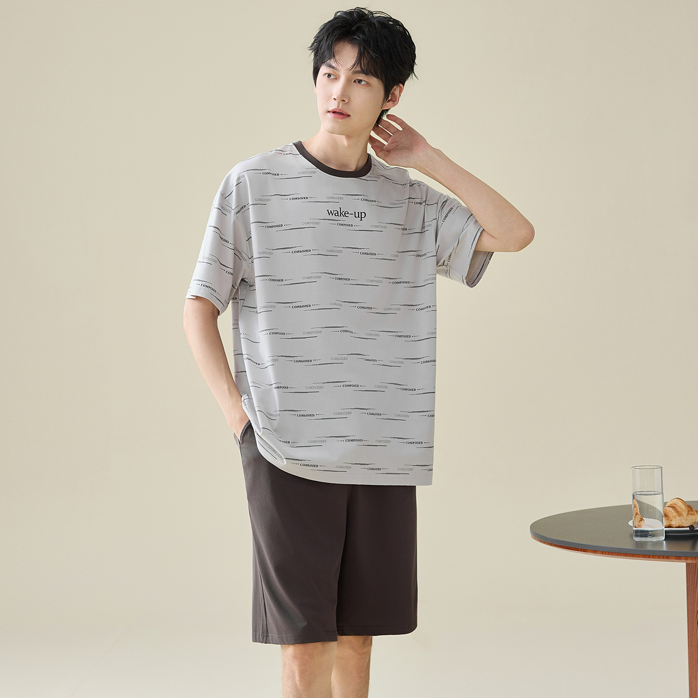 한국식 고급 순면 남성용 여름 잠옷, 라운드넥 반팔 반바지, 루즈핏, 큰 사이즈, 외출복으로도 활용 가능, 청소년 홈웨어