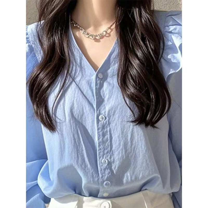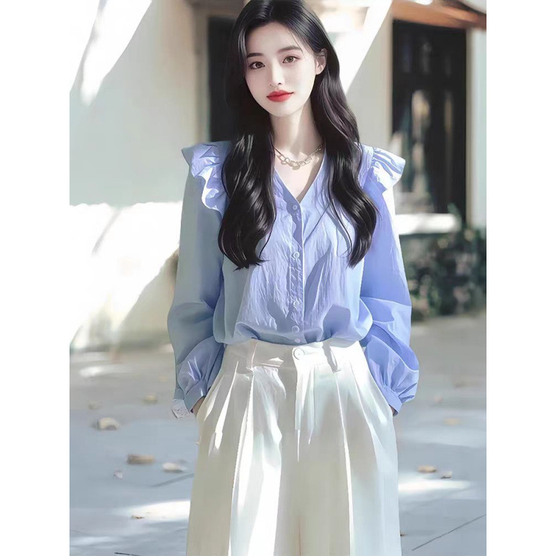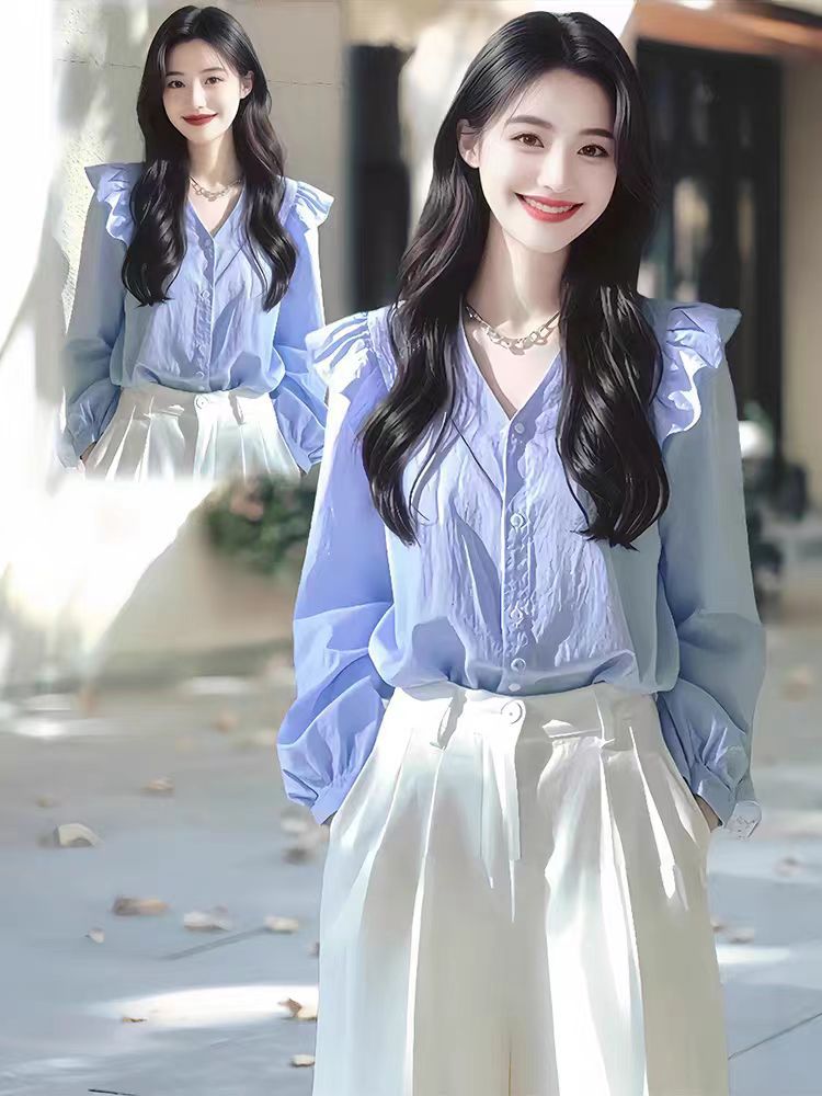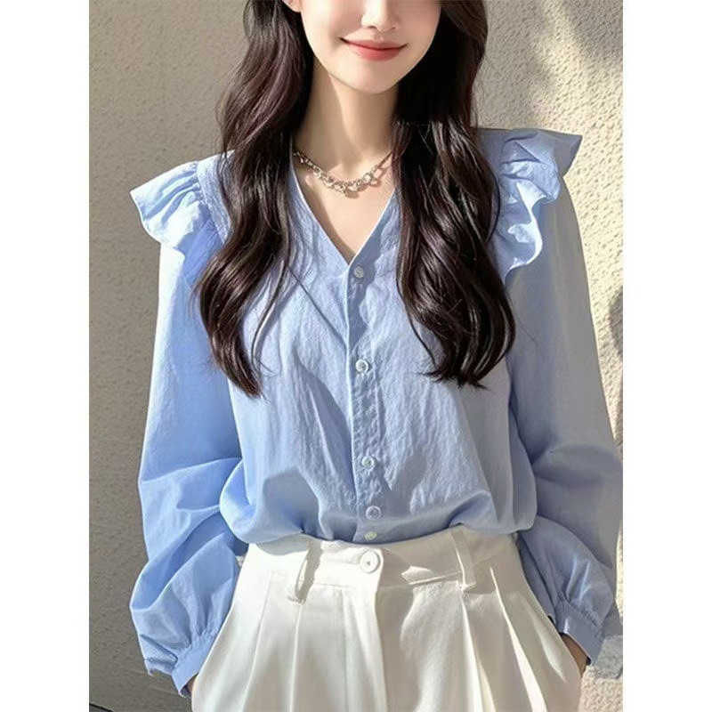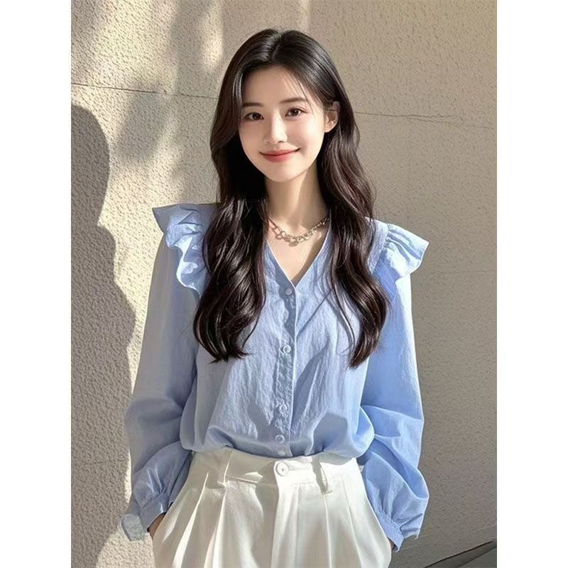 올해 인기있는 아름다운 작은 셔츠 가벼운 고급 고급 프랑스 틈새 아름다운 푸른 긴 소매 셔츠 여성의 새로운 가을스토어 가기