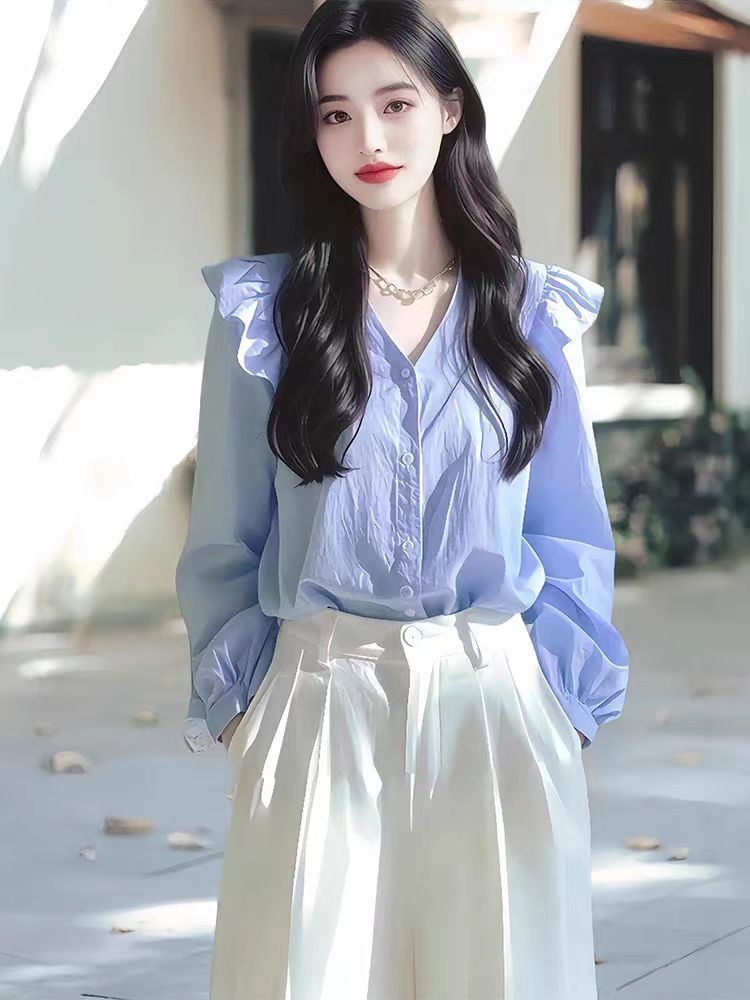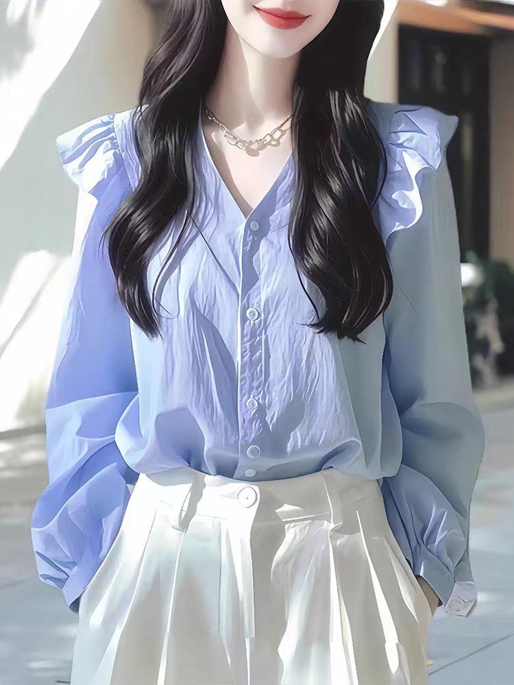 올해 인기있는 아름다운 작은 셔츠 가벼운 고급 고급 프랑스 틈새 아름다운 푸른 긴 소매 셔츠 여성의 새로운 가을
