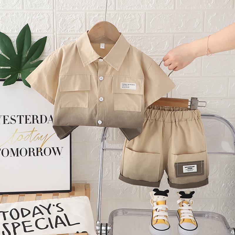 소년의 새로운 여름 반팔 셔츠 정장, 잘 생긴 아기 소년의 여름 얇은 작업복 투피스 세트, 드롭 배송
