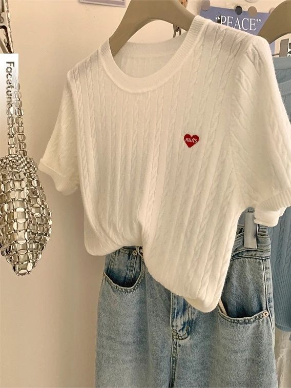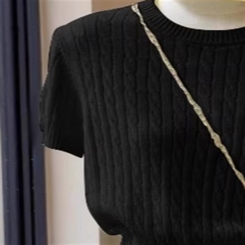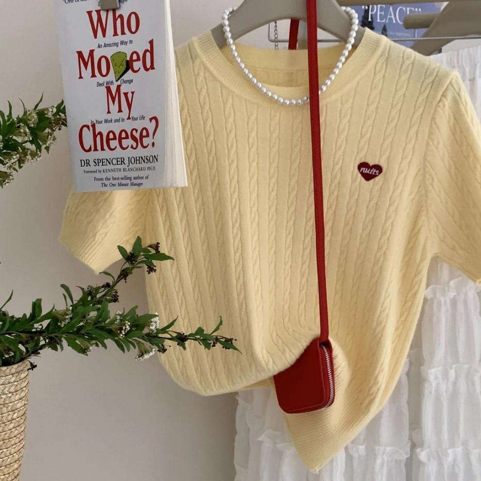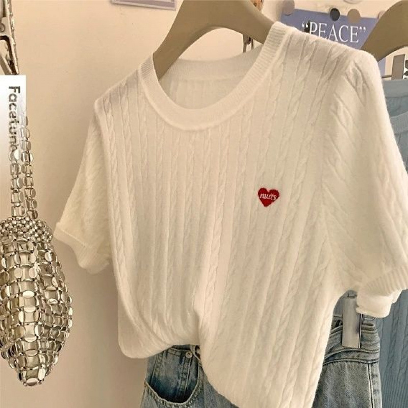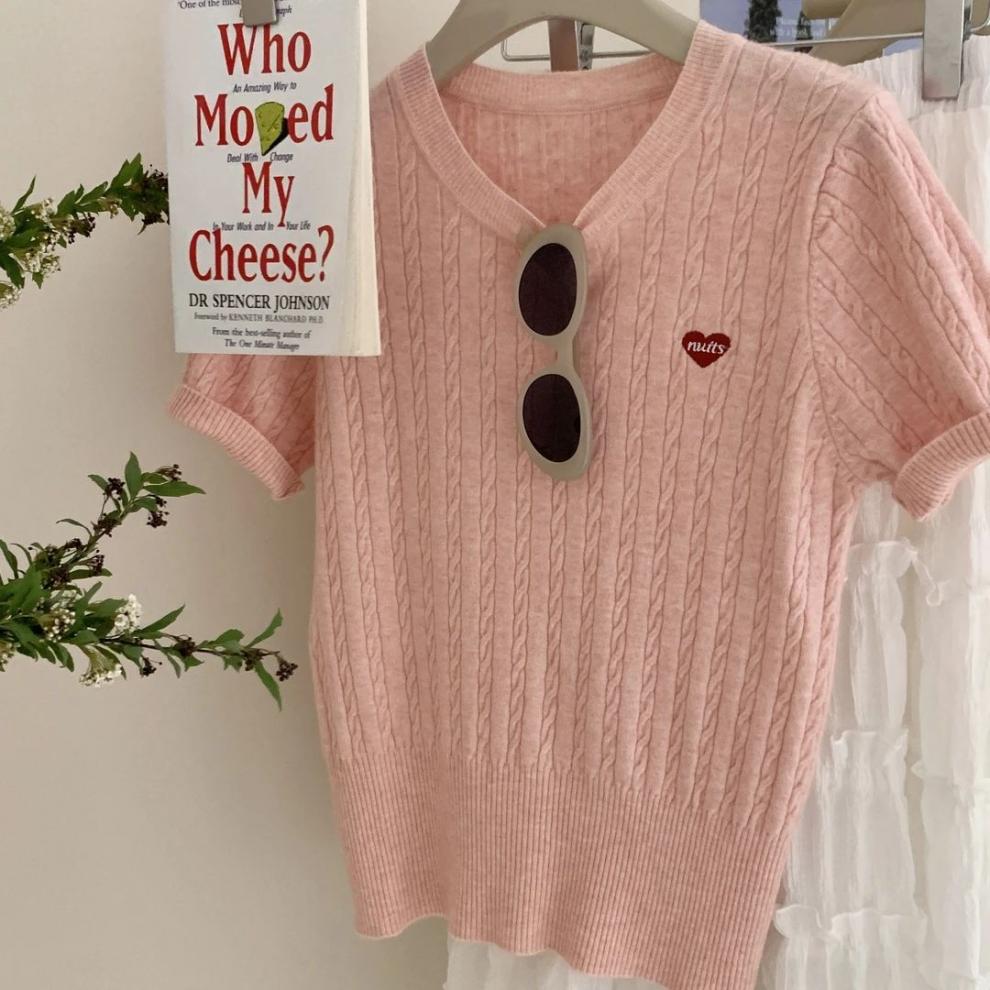 디자인 센스 티셔츠 소프트 왁스 반팔 어깨 탑 자수 얇은 한국 스타일 나이 감소 트위스트 여성용 니트 스웨터 여름스토어 가기
