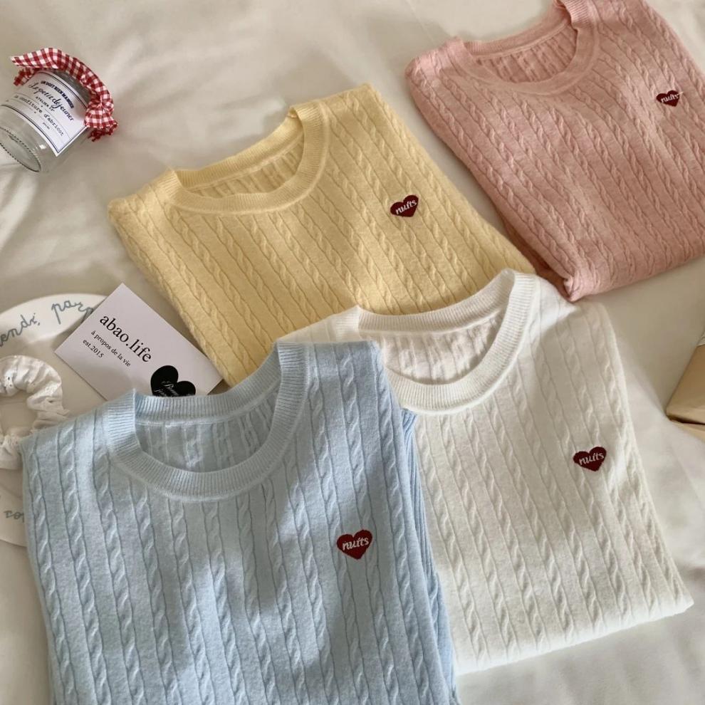 디자인 센스 티셔츠 소프트 왁스 반팔 어깨 탑 자수 얇은 한국 스타일 나이 감소 트위스트 여성용 니트 스웨터 여름