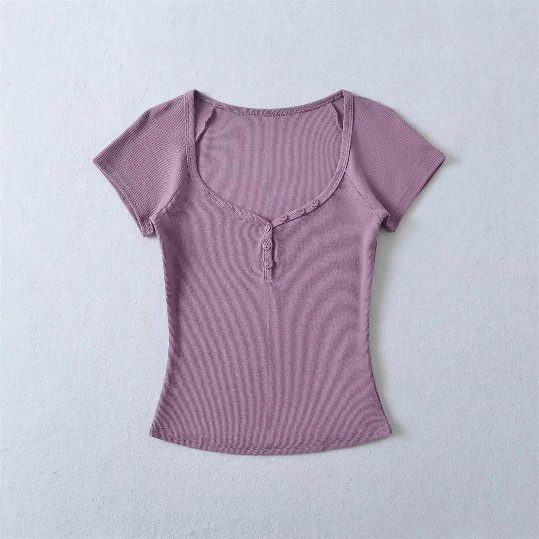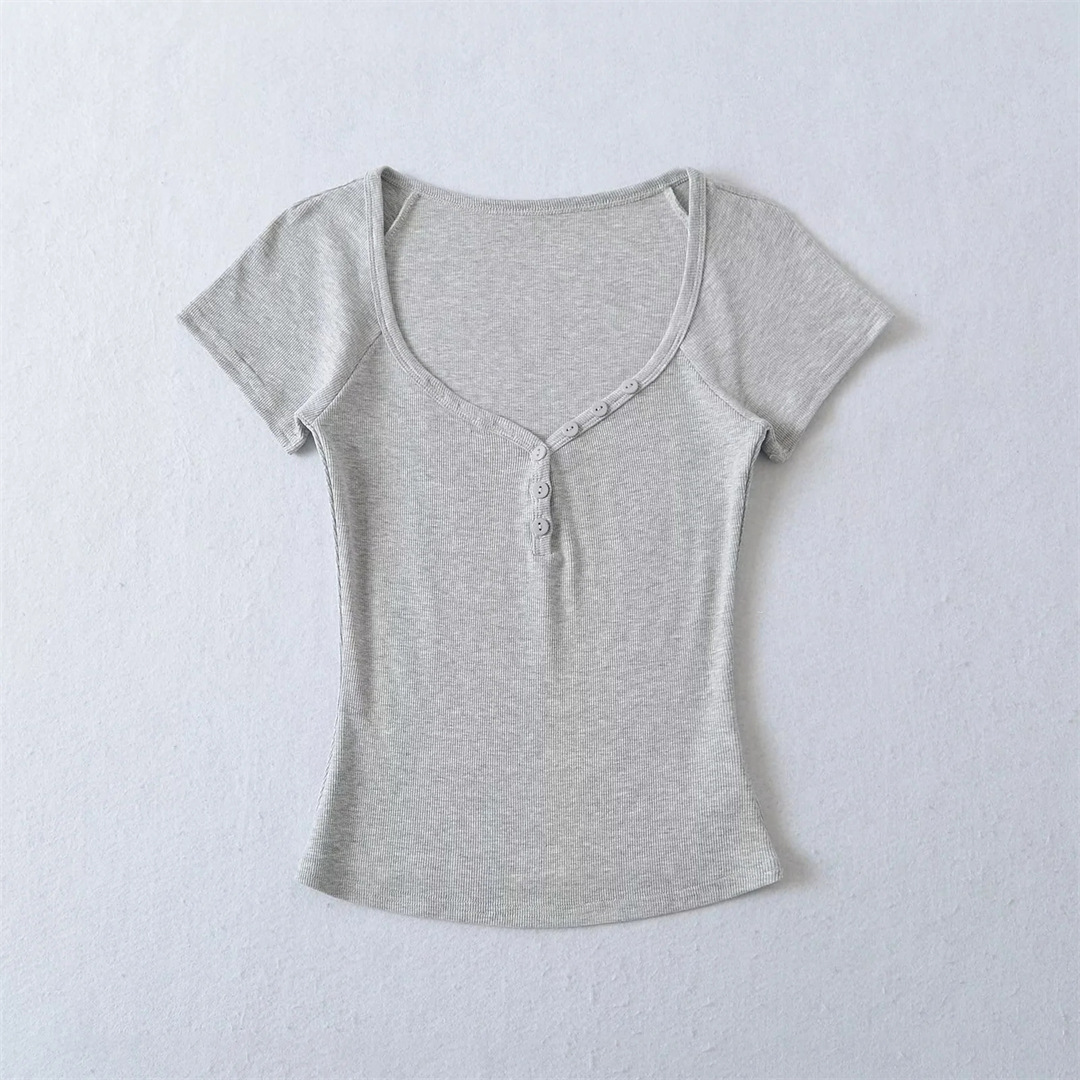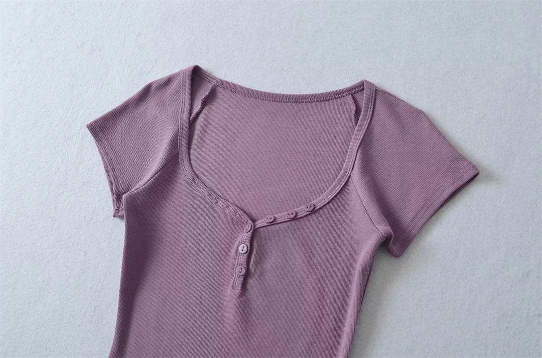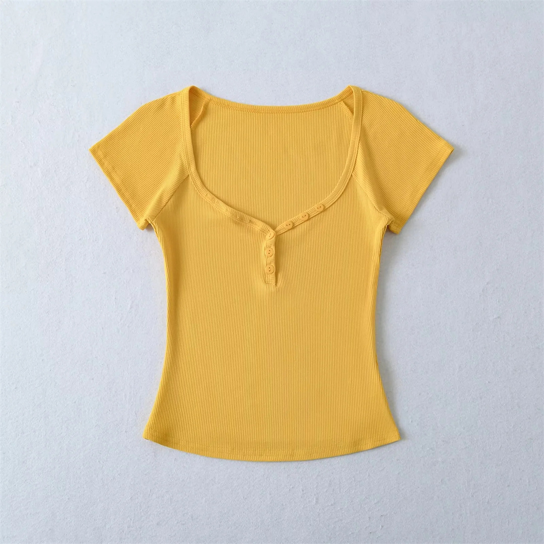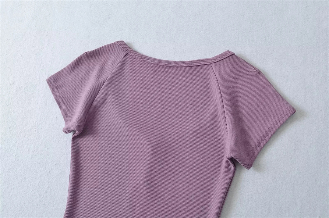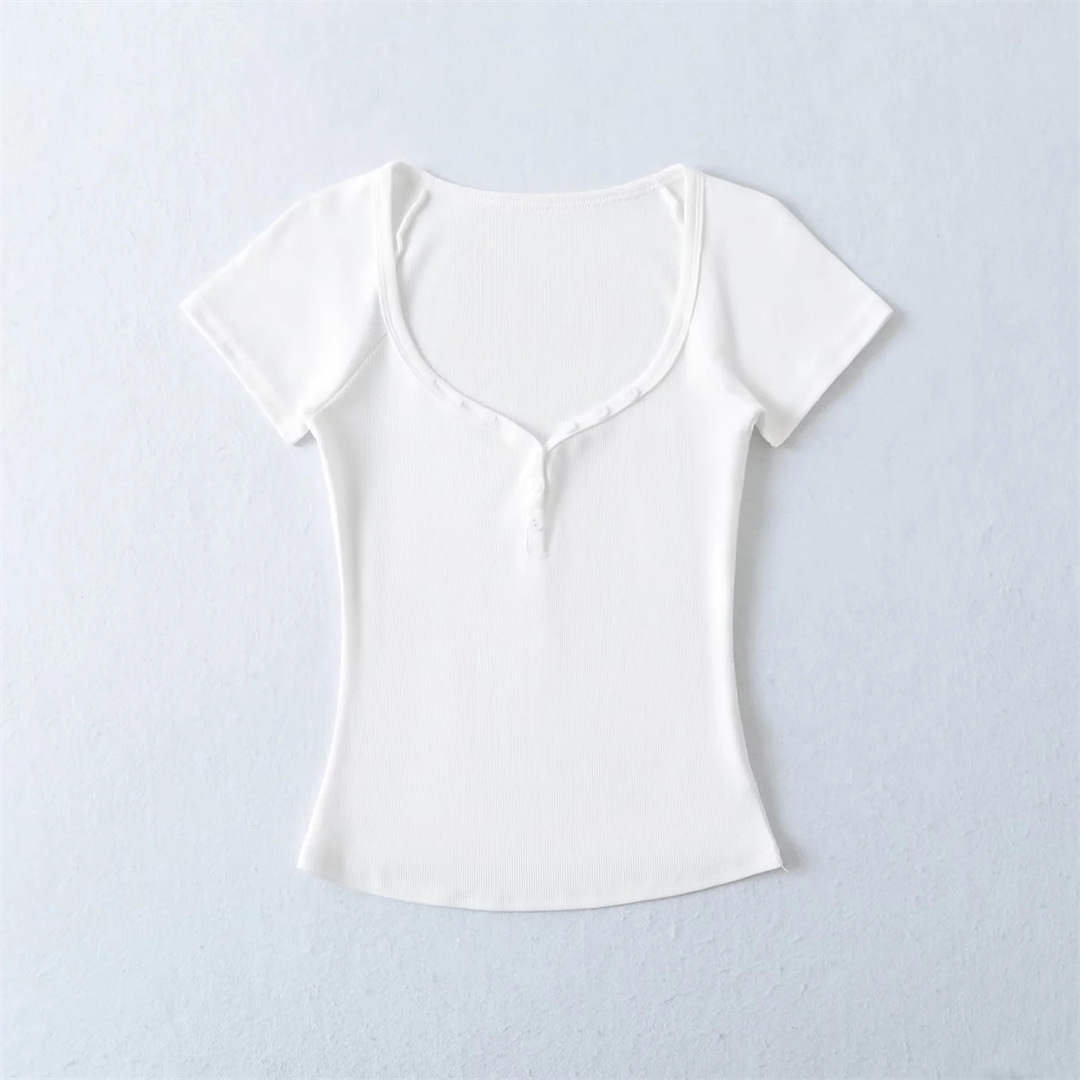 뜨거운 소녀 하트 칼라 로우 컷 반팔 티셔츠 여성용 여름 디자인 센스 슬림 핏 간단한 짧은 어깨 솔리드 컬러 탑