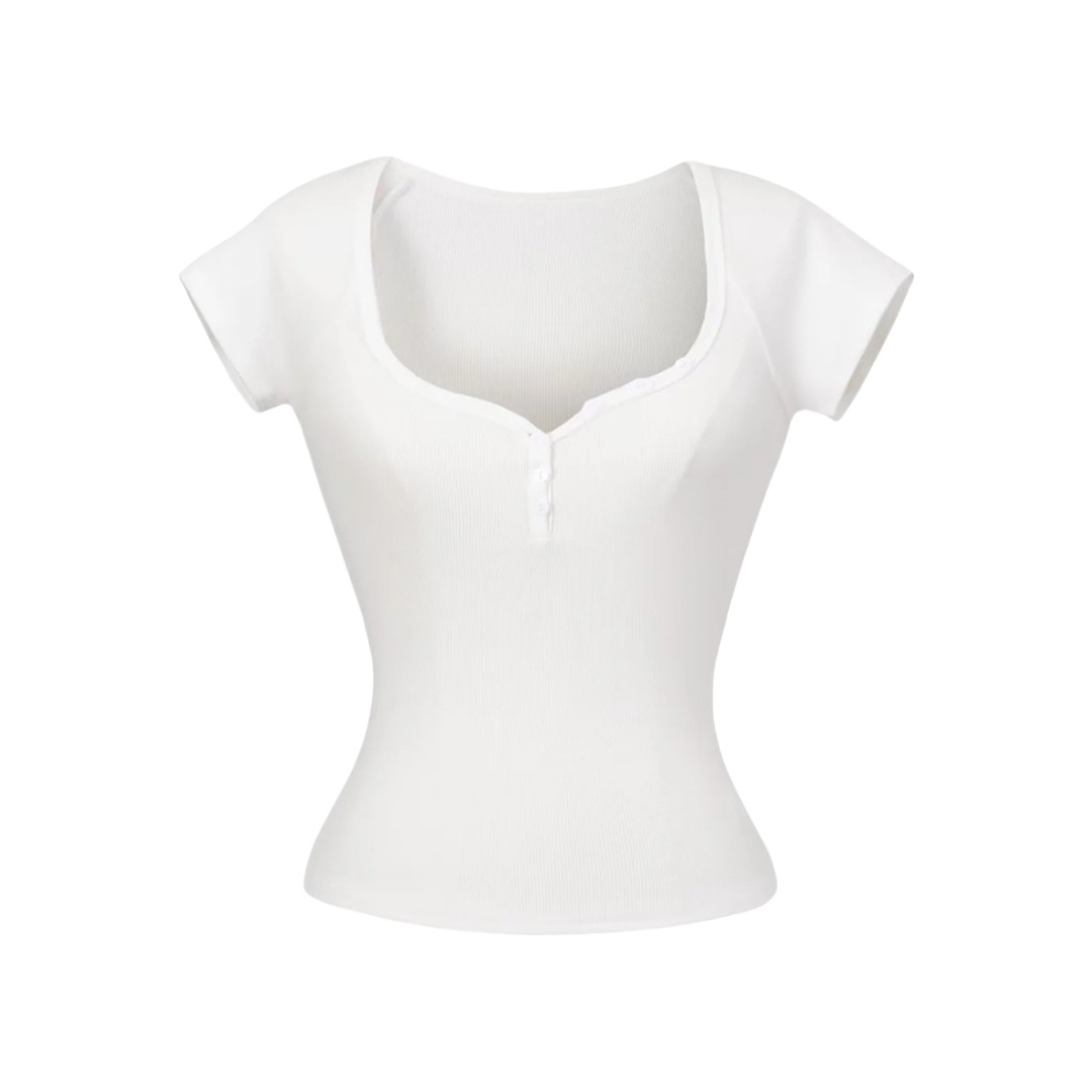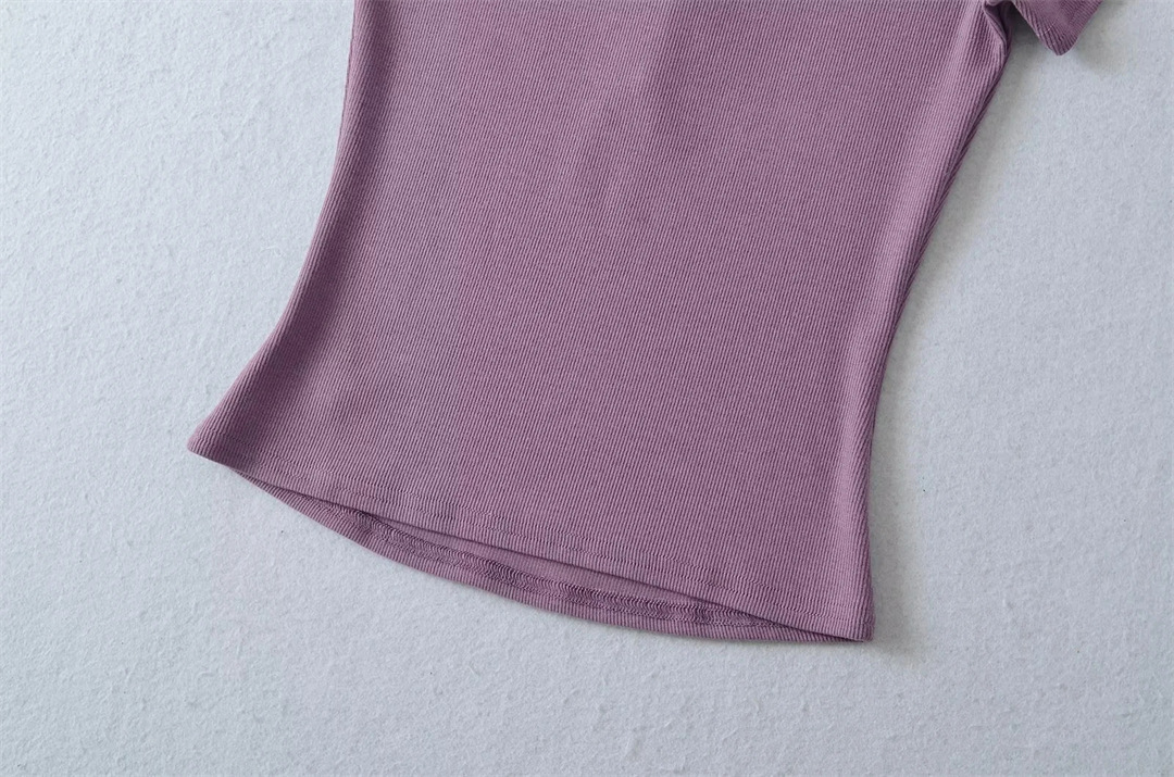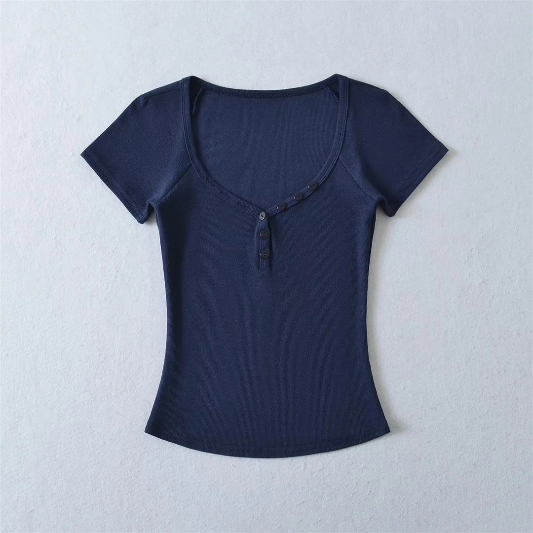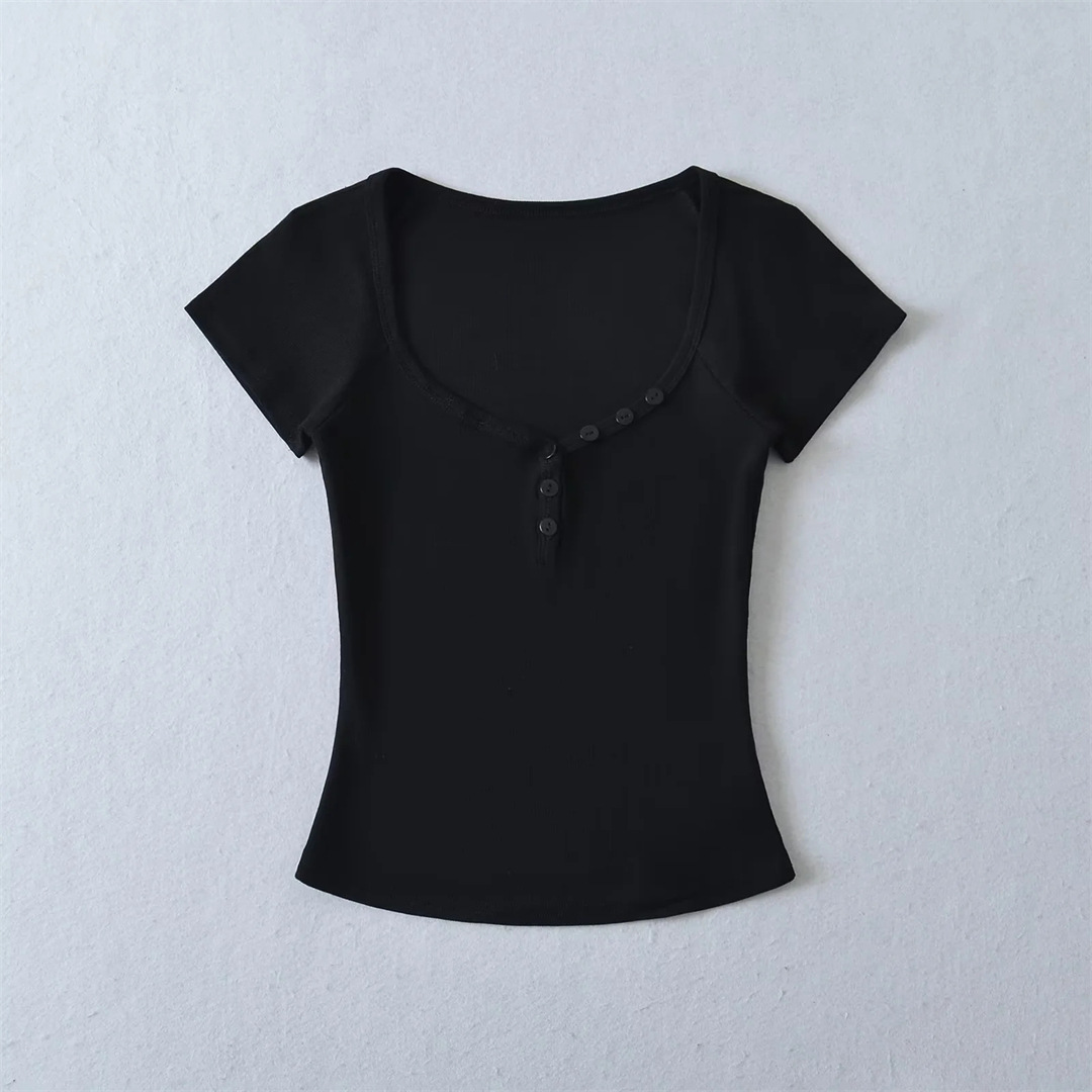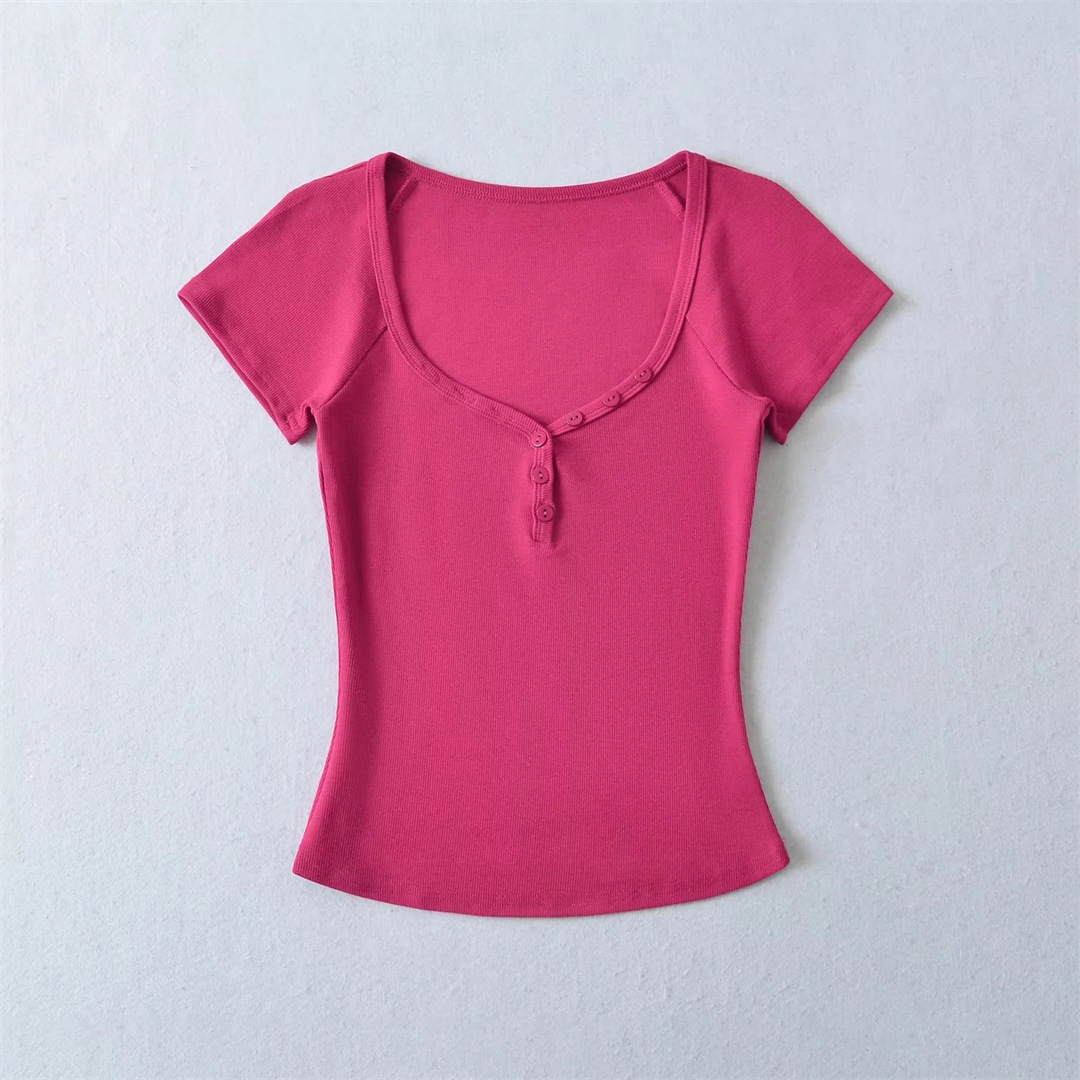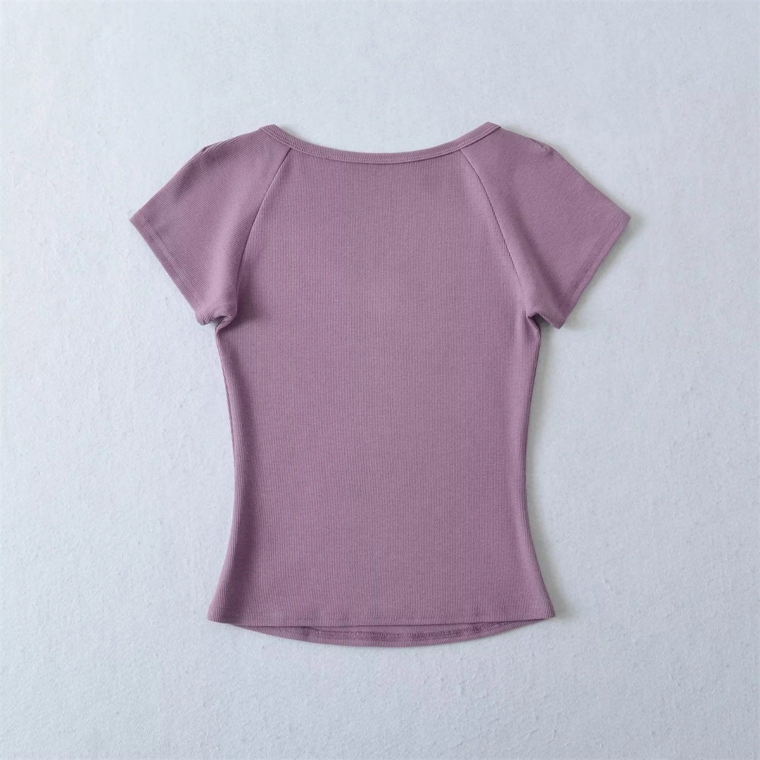 뜨거운 소녀 하트 칼라 로우 컷 반팔 티셔츠 여성용 여름 디자인 센스 슬림 핏 간단한 짧은 어깨 솔리드 컬러 탑