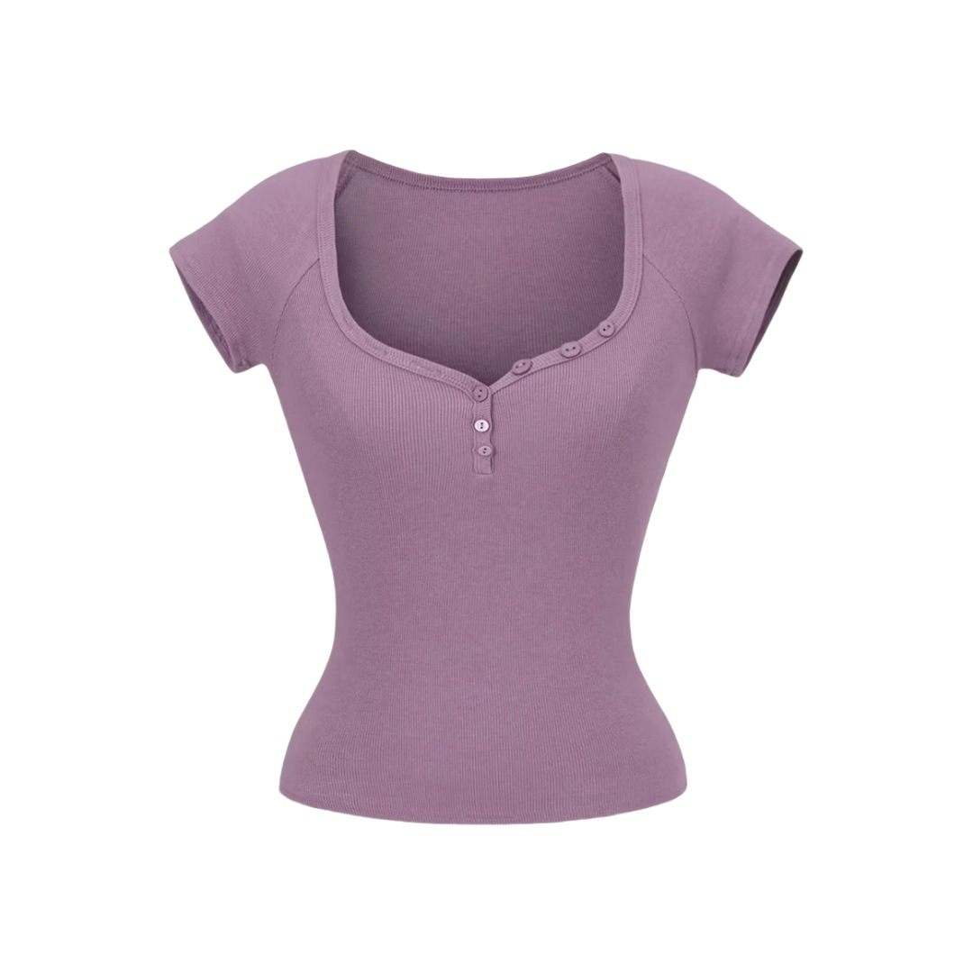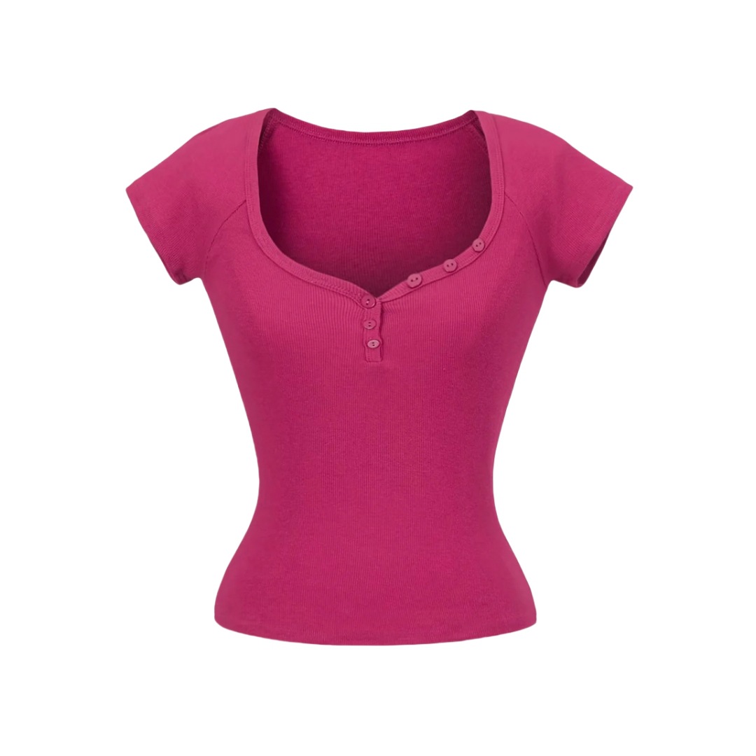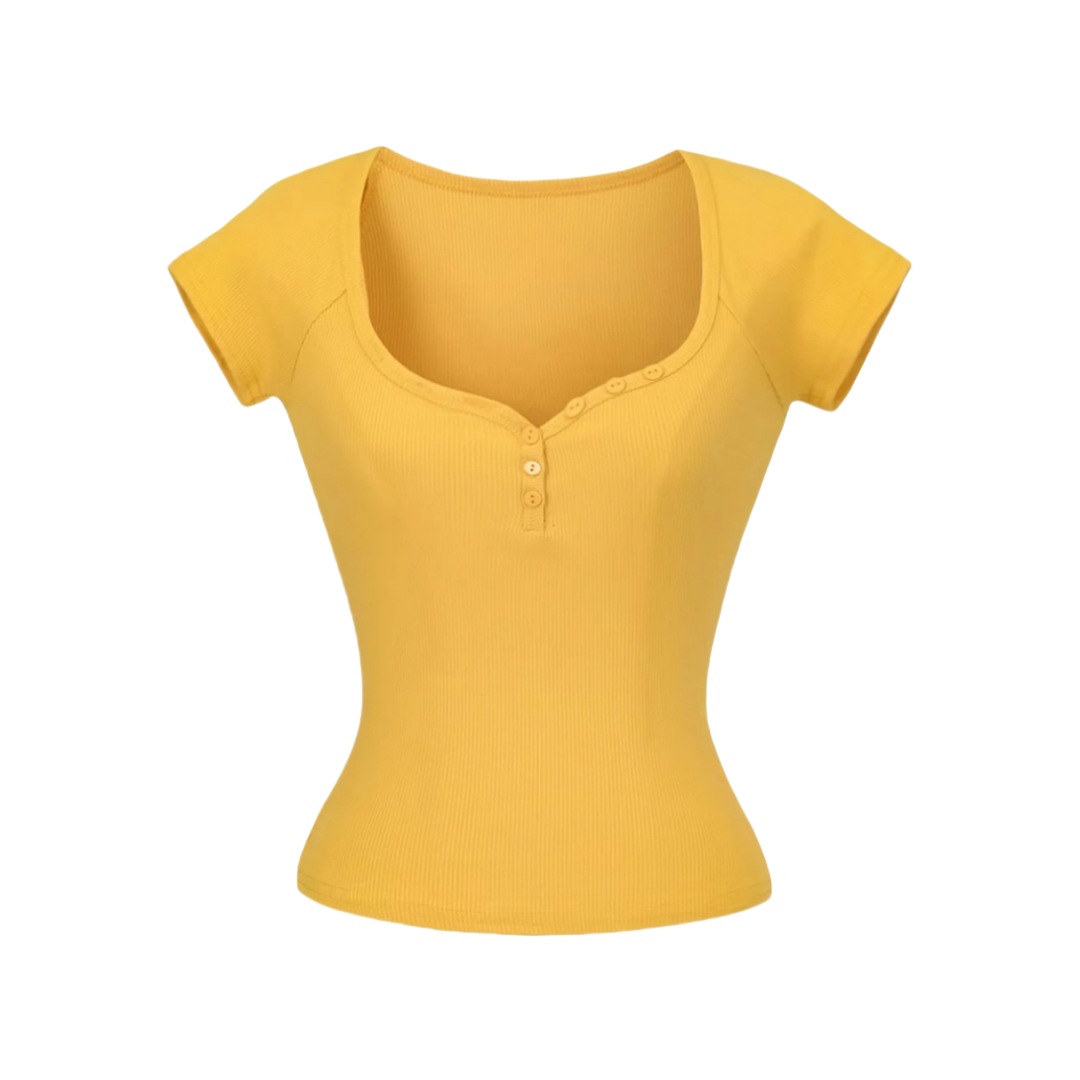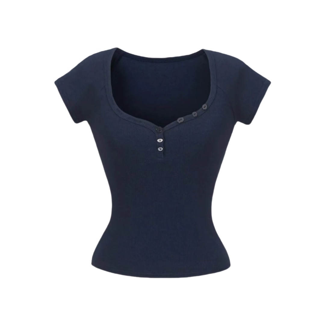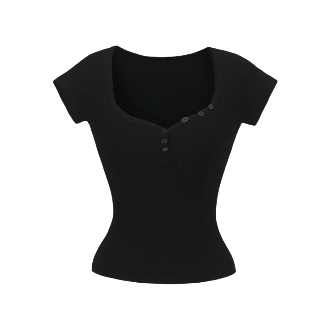 뜨거운 소녀 하트 칼라 로우 컷 반팔 티셔츠 여성용 여름 디자인 센스 슬림 핏 간단한 짧은 어깨 솔리드 컬러 탑