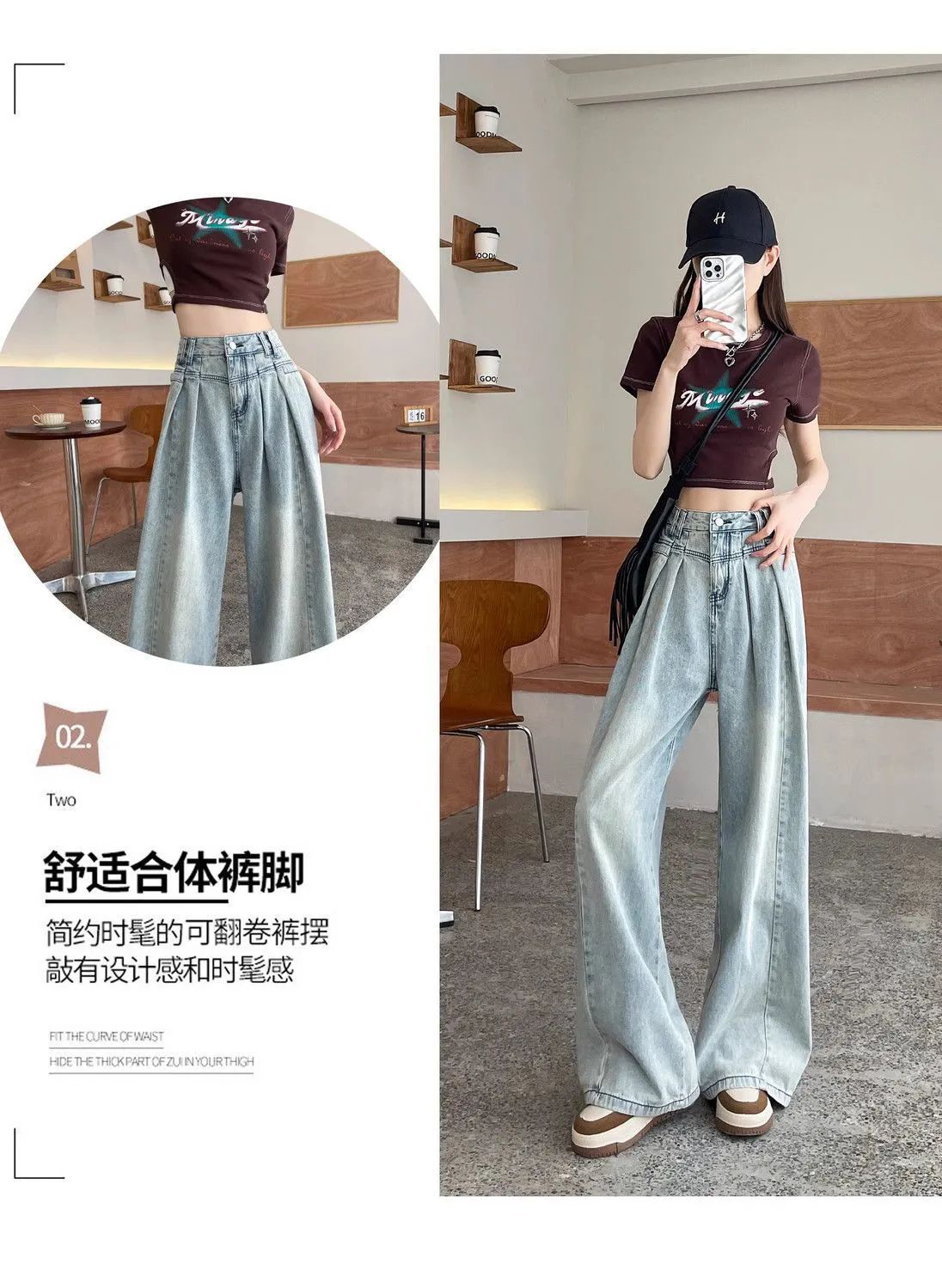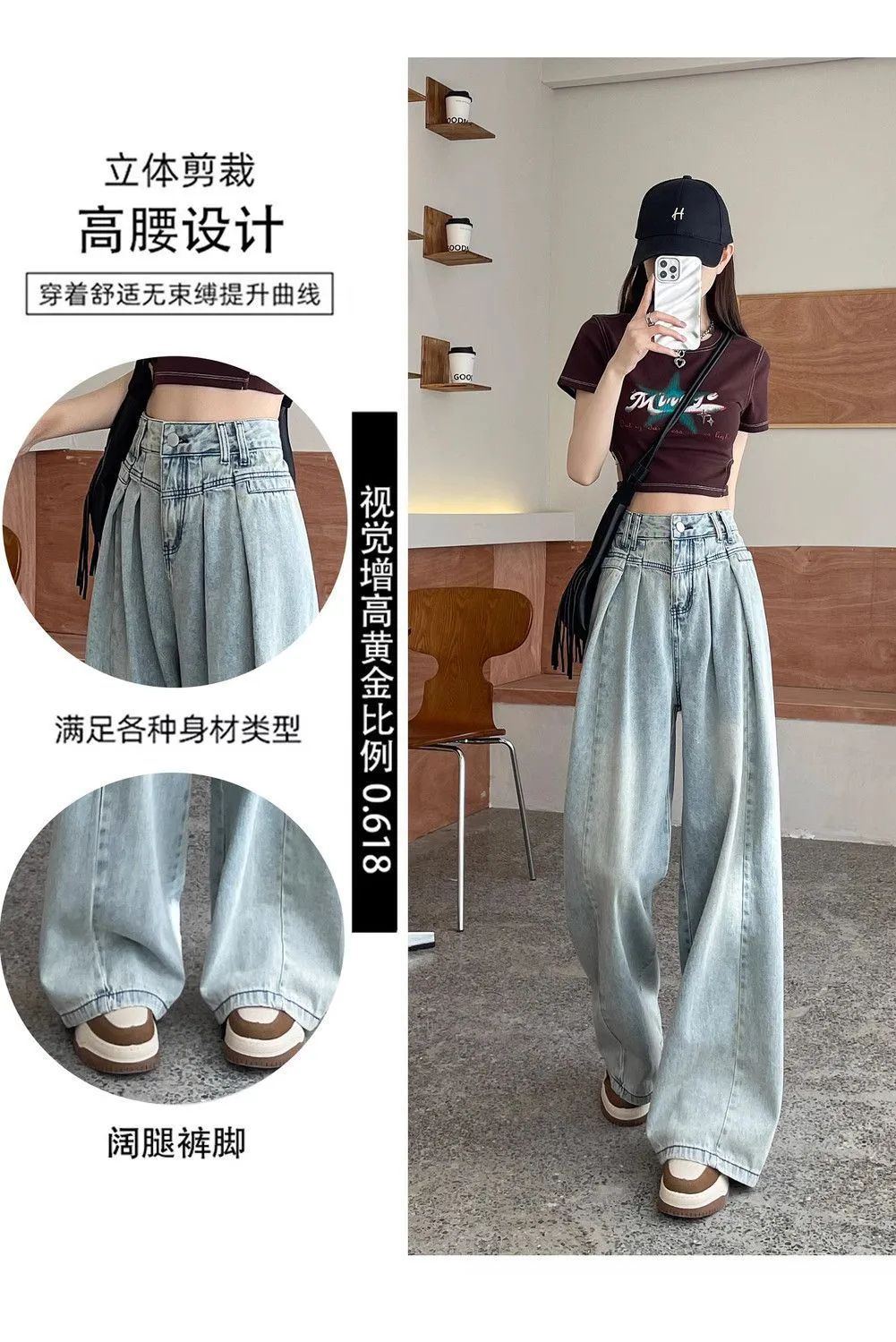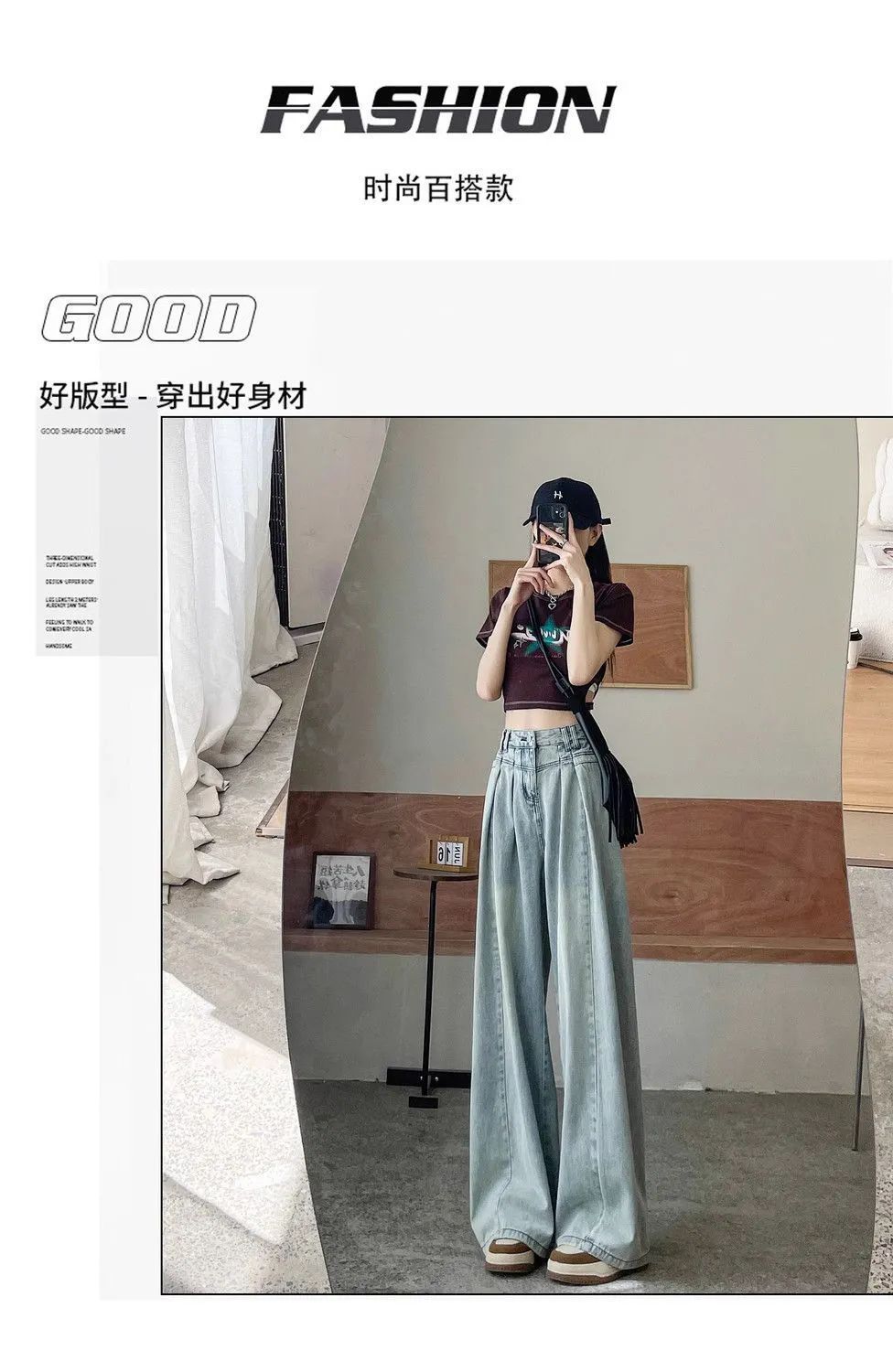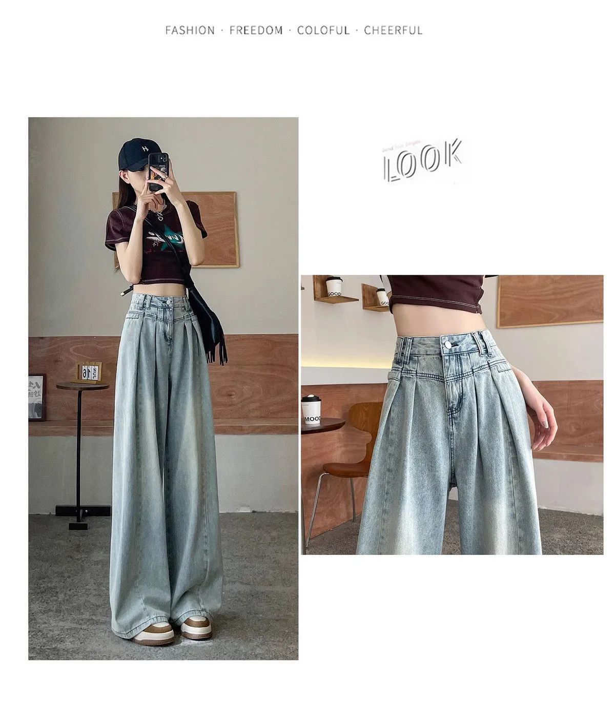 여성용 라이트 블루 와이드 레그 청바지 2025 봄 여름 디자인 플리츠 하이 웨이스트 슬림 루즈 드레이프 스트레이트 팬츠스토어 가기
