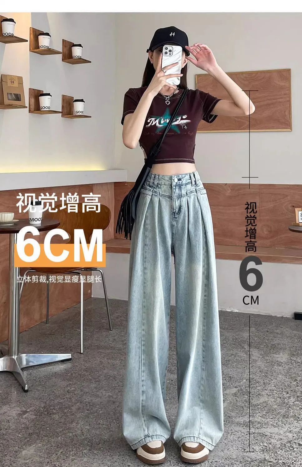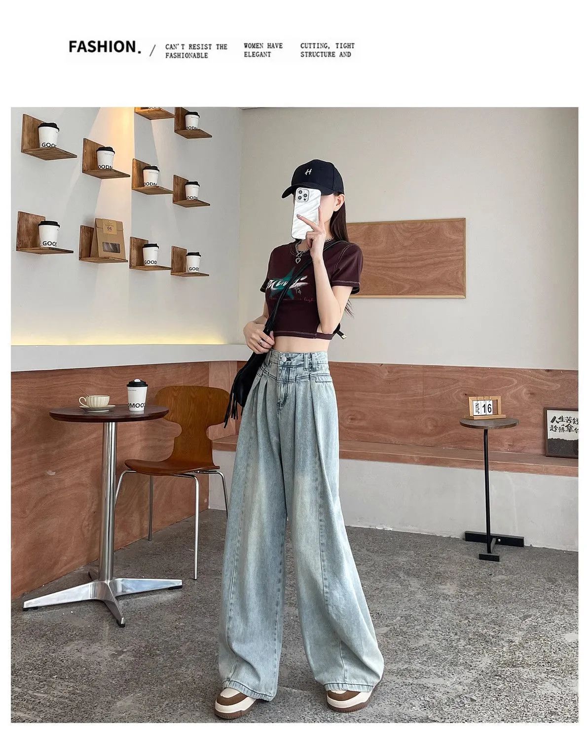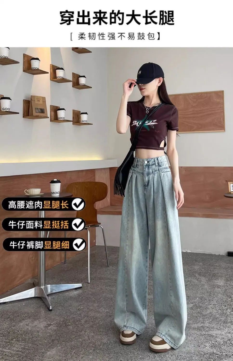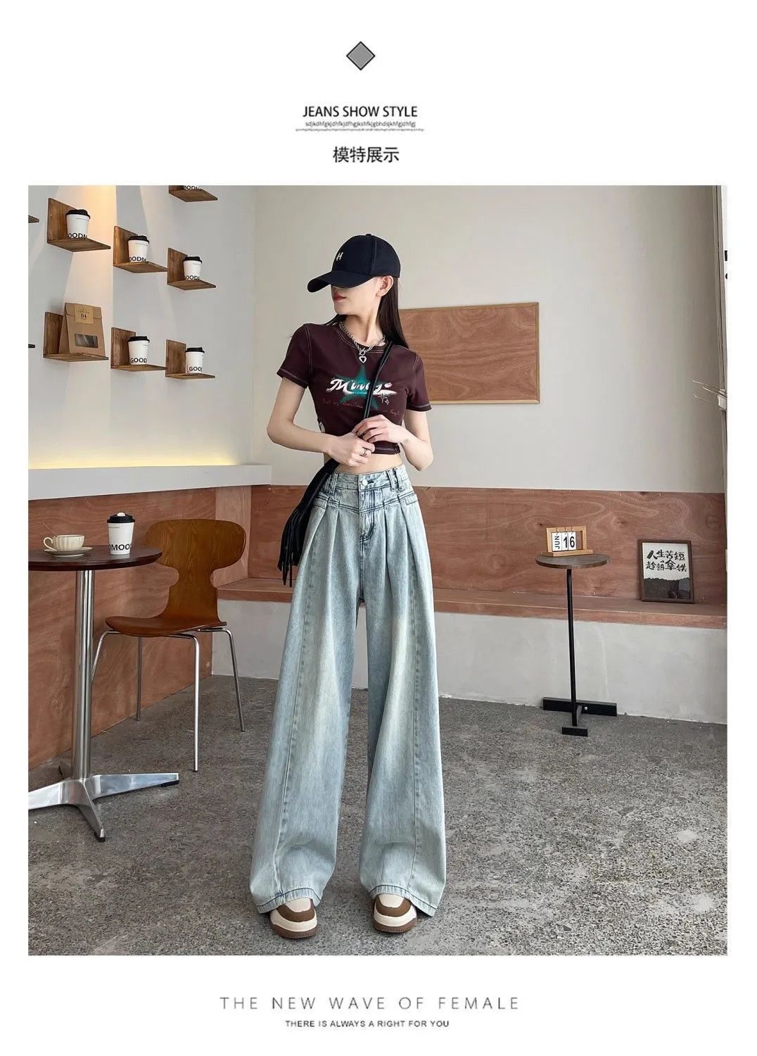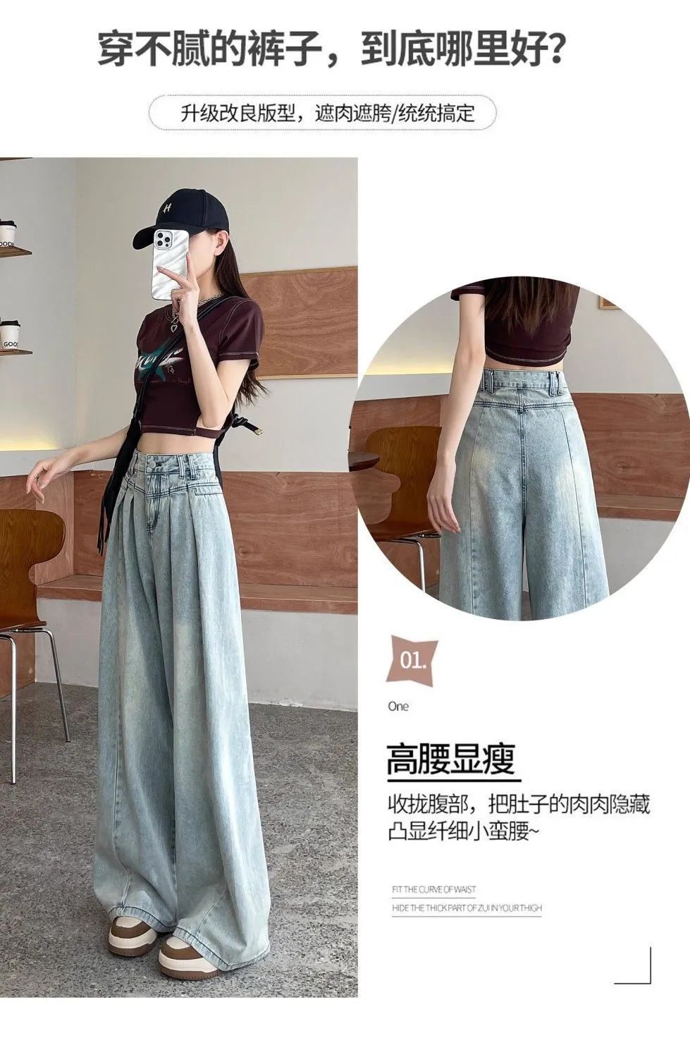여성용 라이트 블루 와이드 레그 청바지 2025 봄 여름 디자인 플리츠 하이 웨이스트 슬림 루즈 드레이프 스트레이트 팬츠스토어 가기