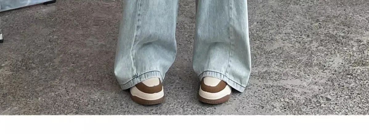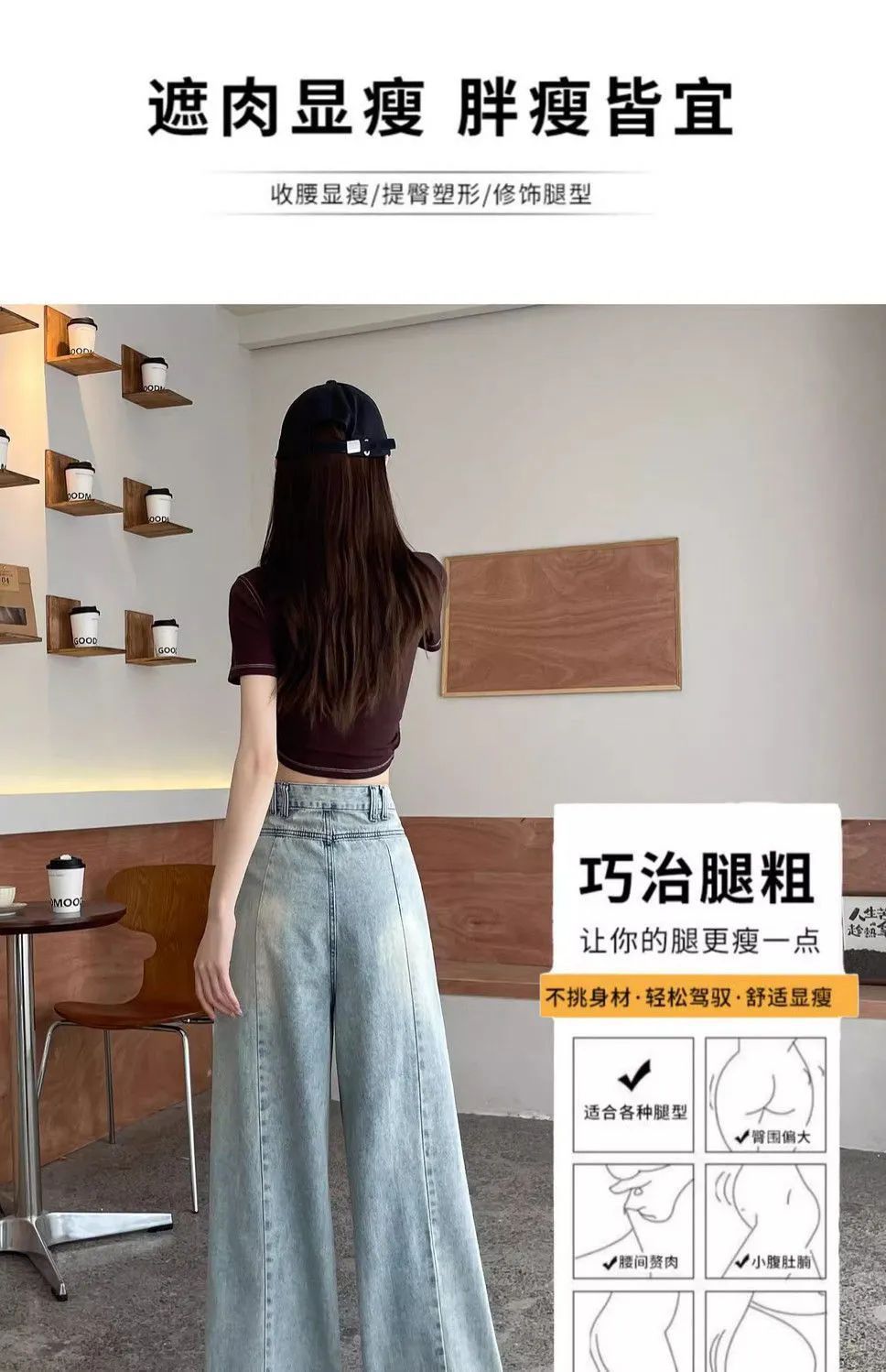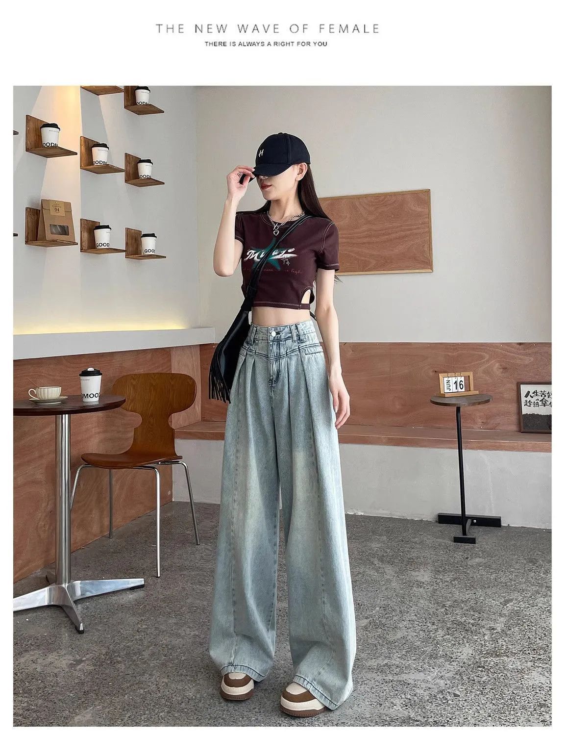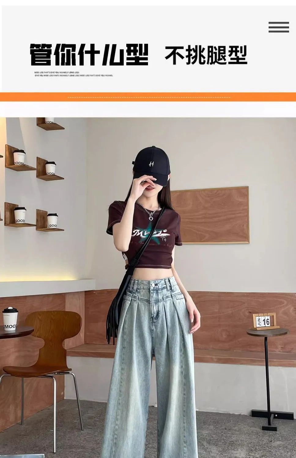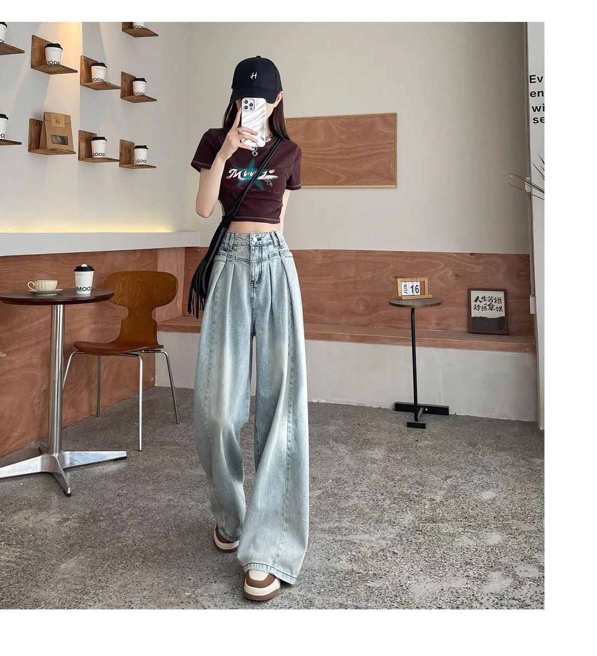 여성용 라이트 블루 와이드 레그 청바지 2025 봄 여름 디자인 플리츠 하이 웨이스트 슬림 루즈 드레이프 스트레이트 팬츠스토어 가기