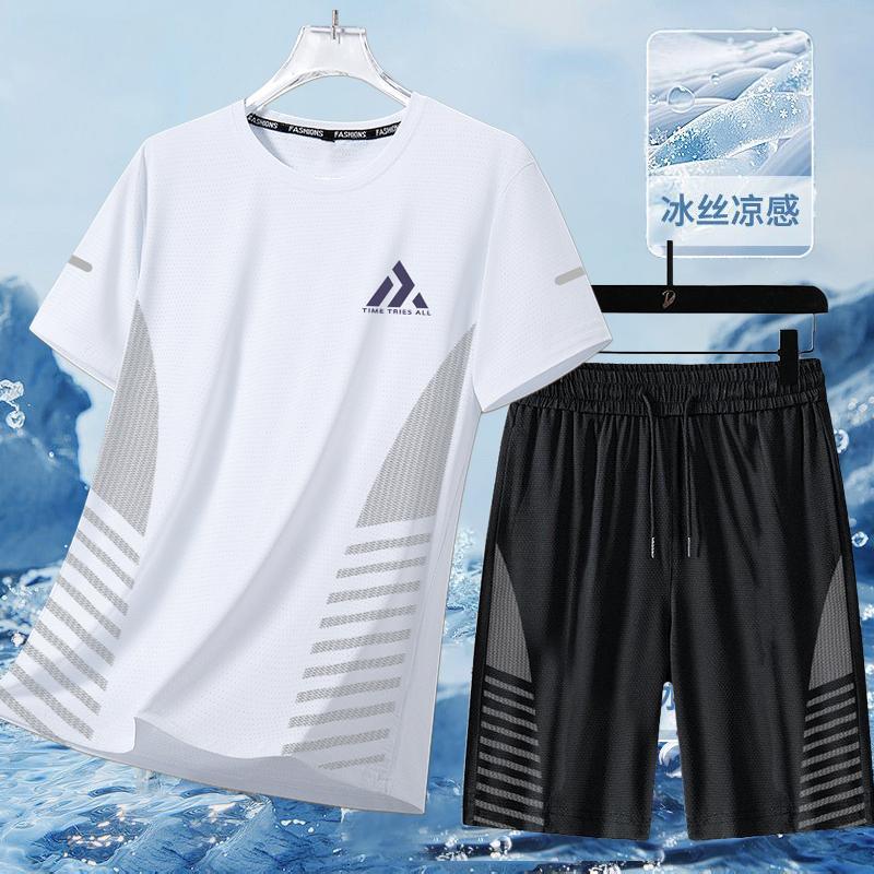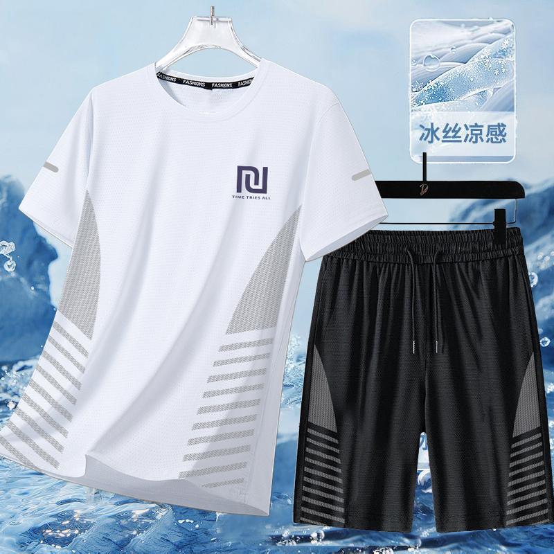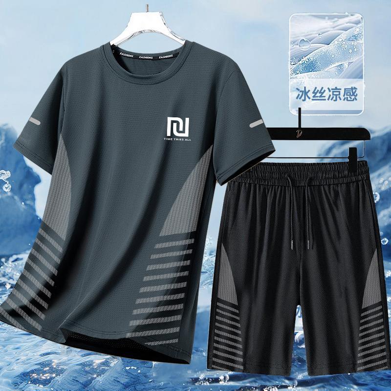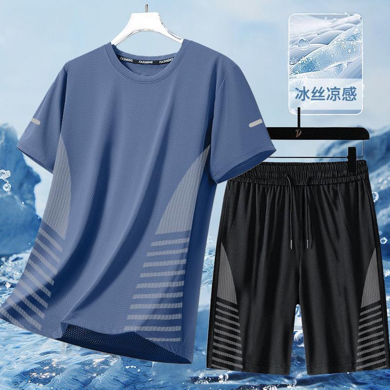 남성용 아이스 캐주얼 슈트, 여름 통기성 속건성 스트레치 반팔 반바지, 남성용 라운드 넥 스포츠웨어 슈트, 남성용 트렌디스토어 가기