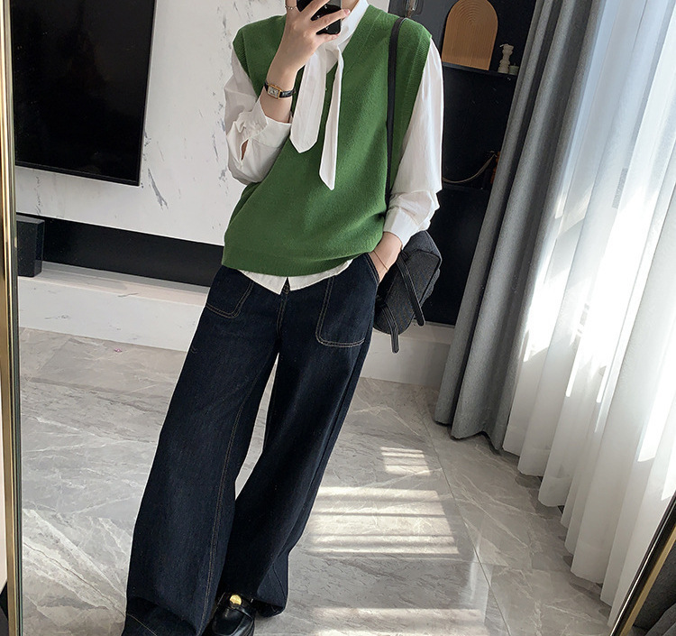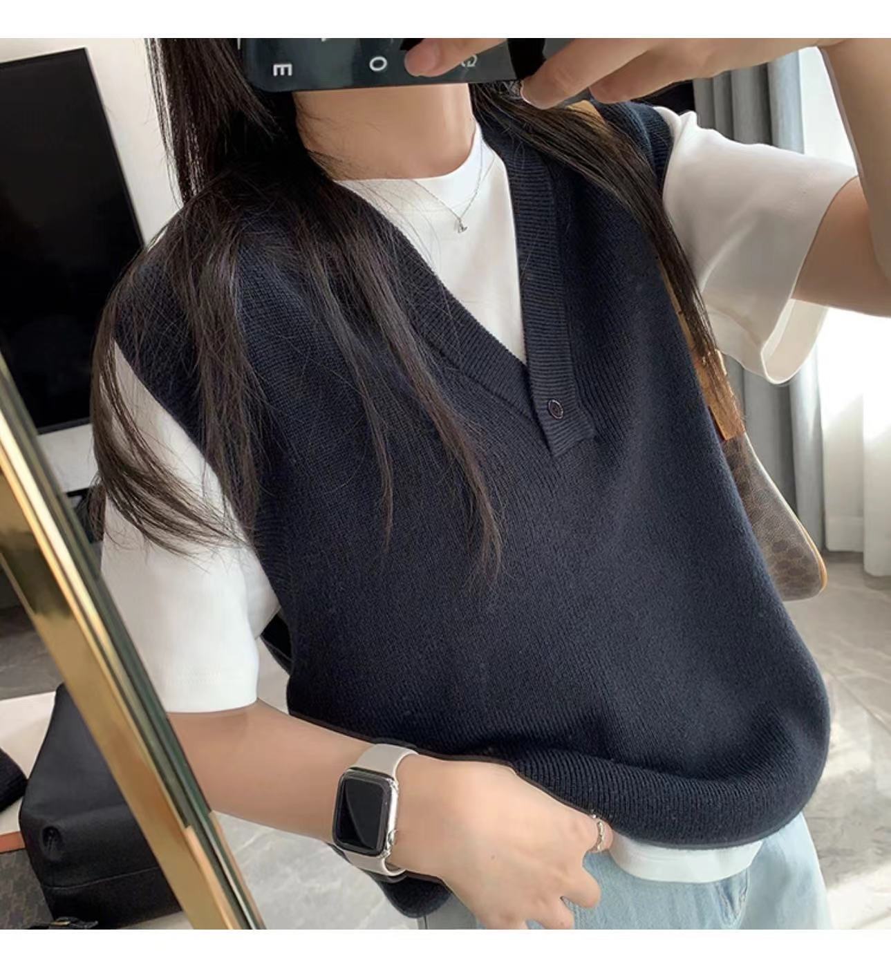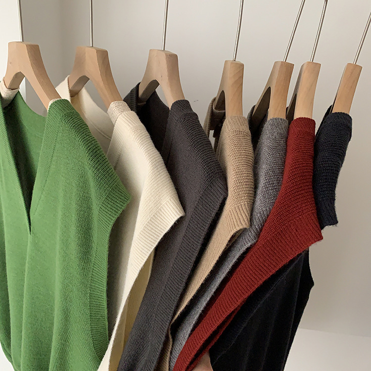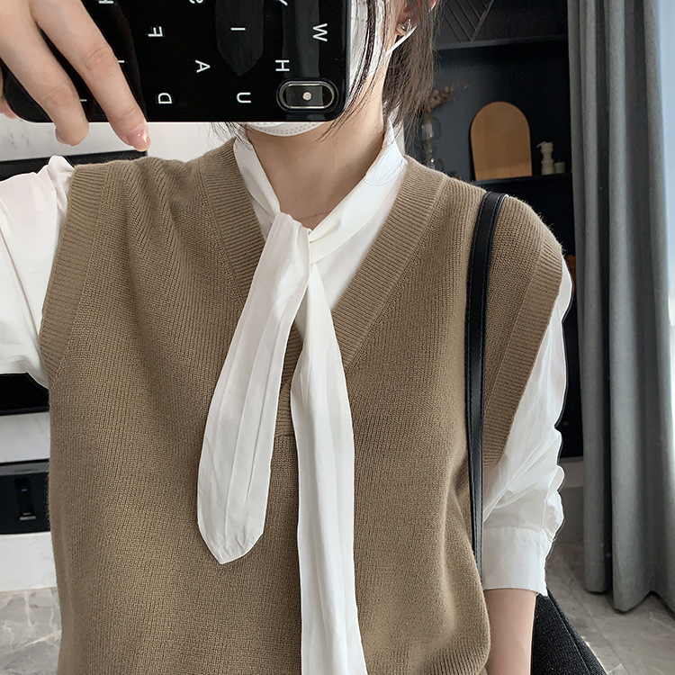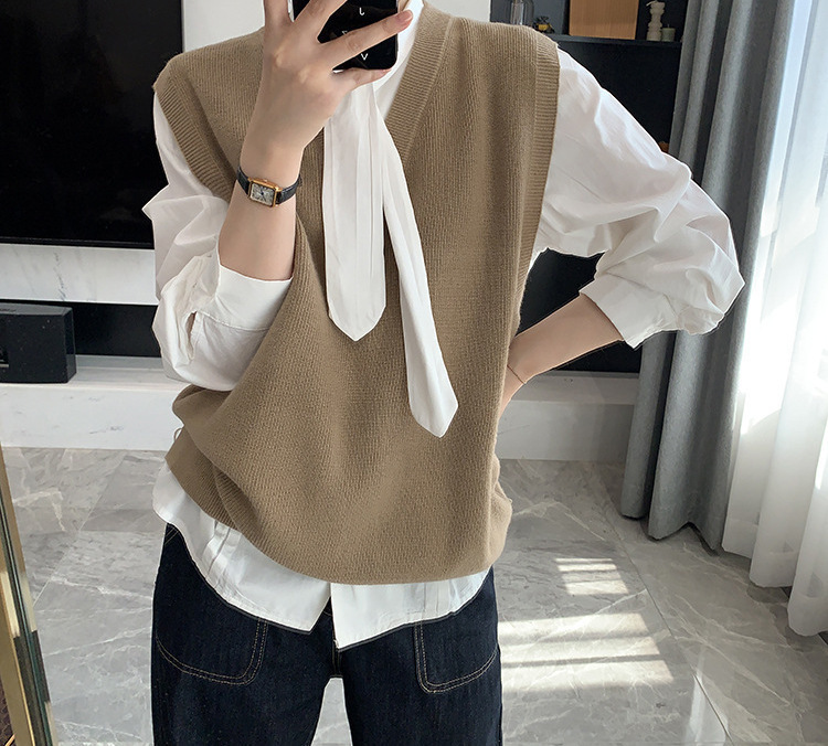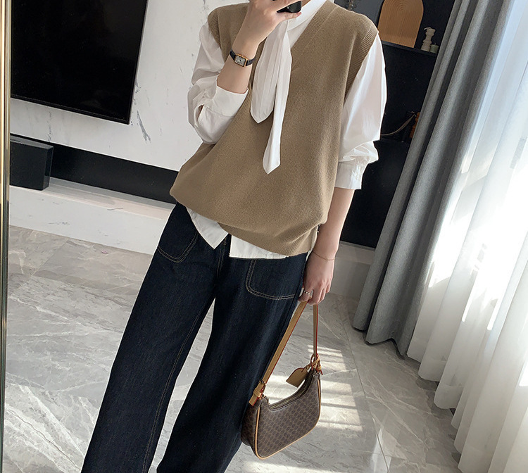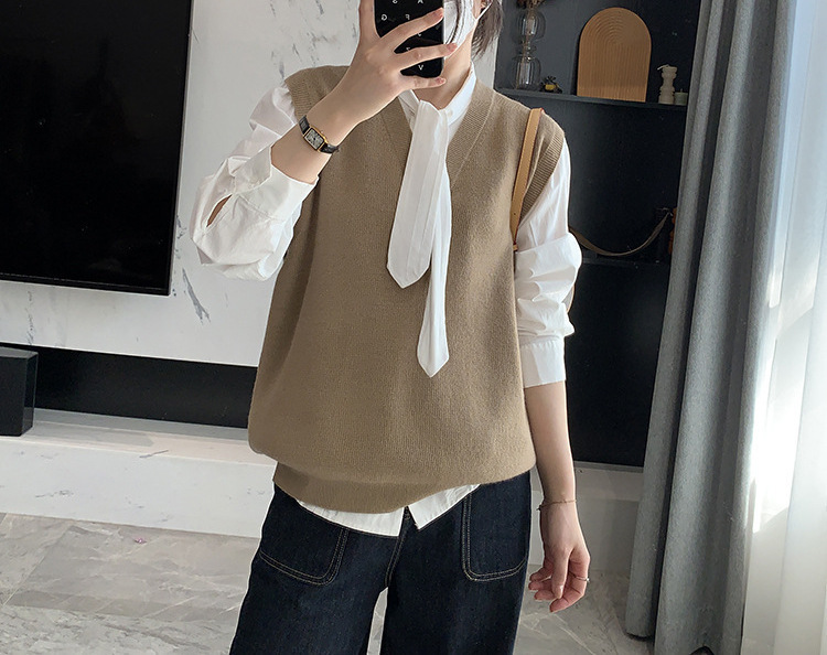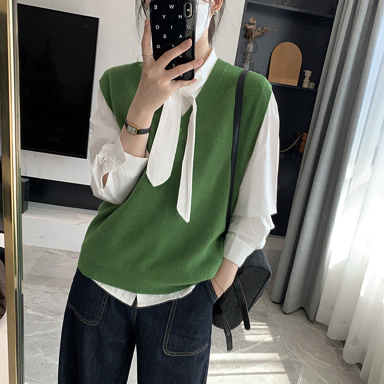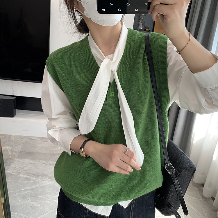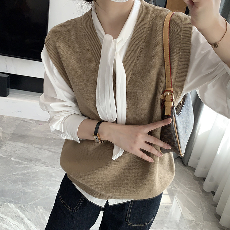 여성을위한 복고풍 느슨한 겉옷 V 넥타이 버클 조끼 가을, 겨울 새로운 스타일 여성 레이어링 외국 스타일 니트 조끼 여성 조끼스토어 가기