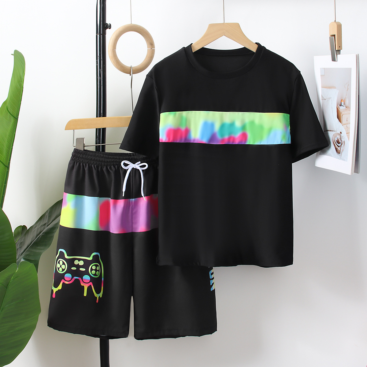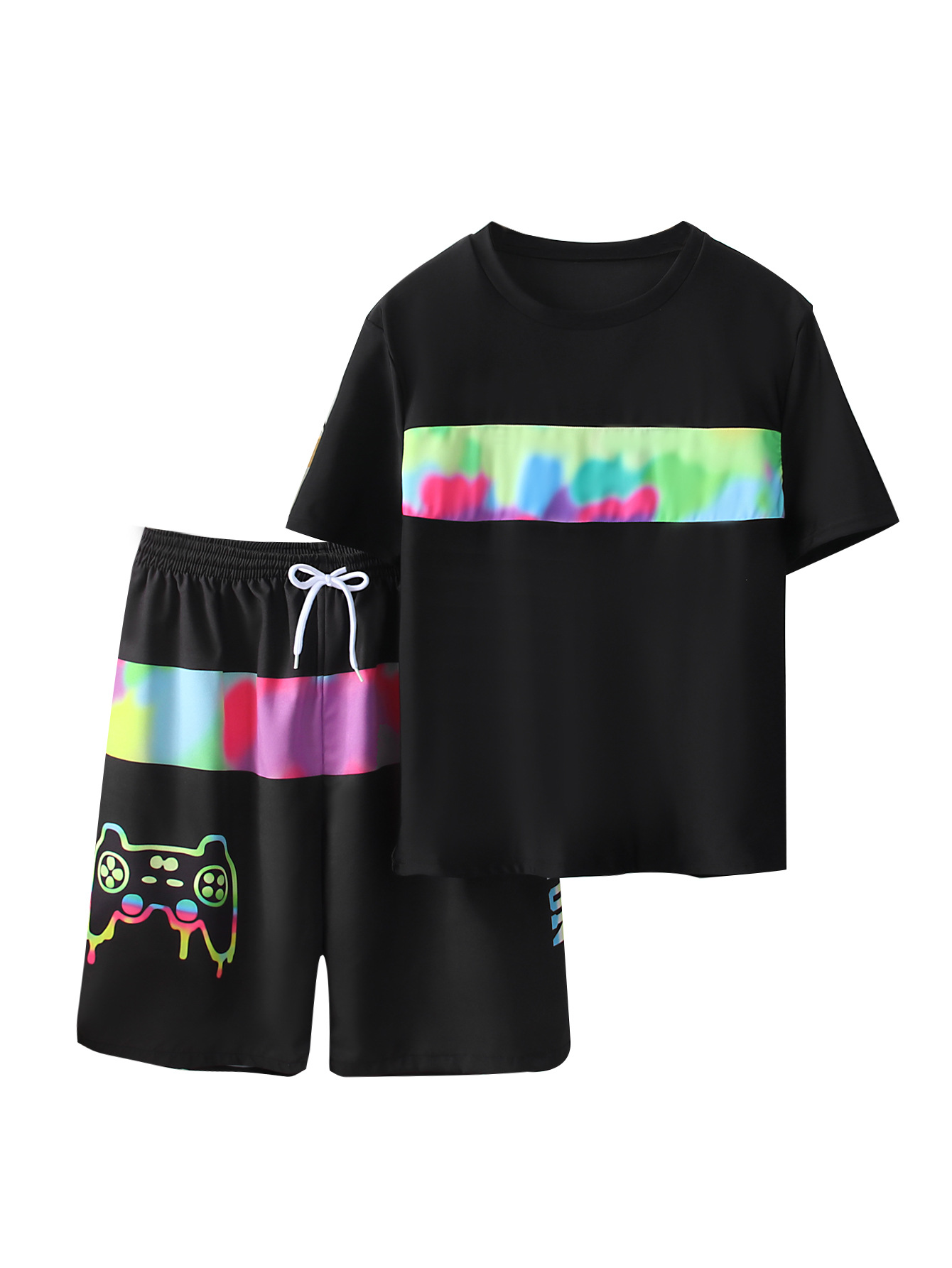 청소년, 남성, 중년 및 어린이 수영복 속건성 게임기 비치 반바지 스플릿 반팔 자외선 차단 수영복 세트