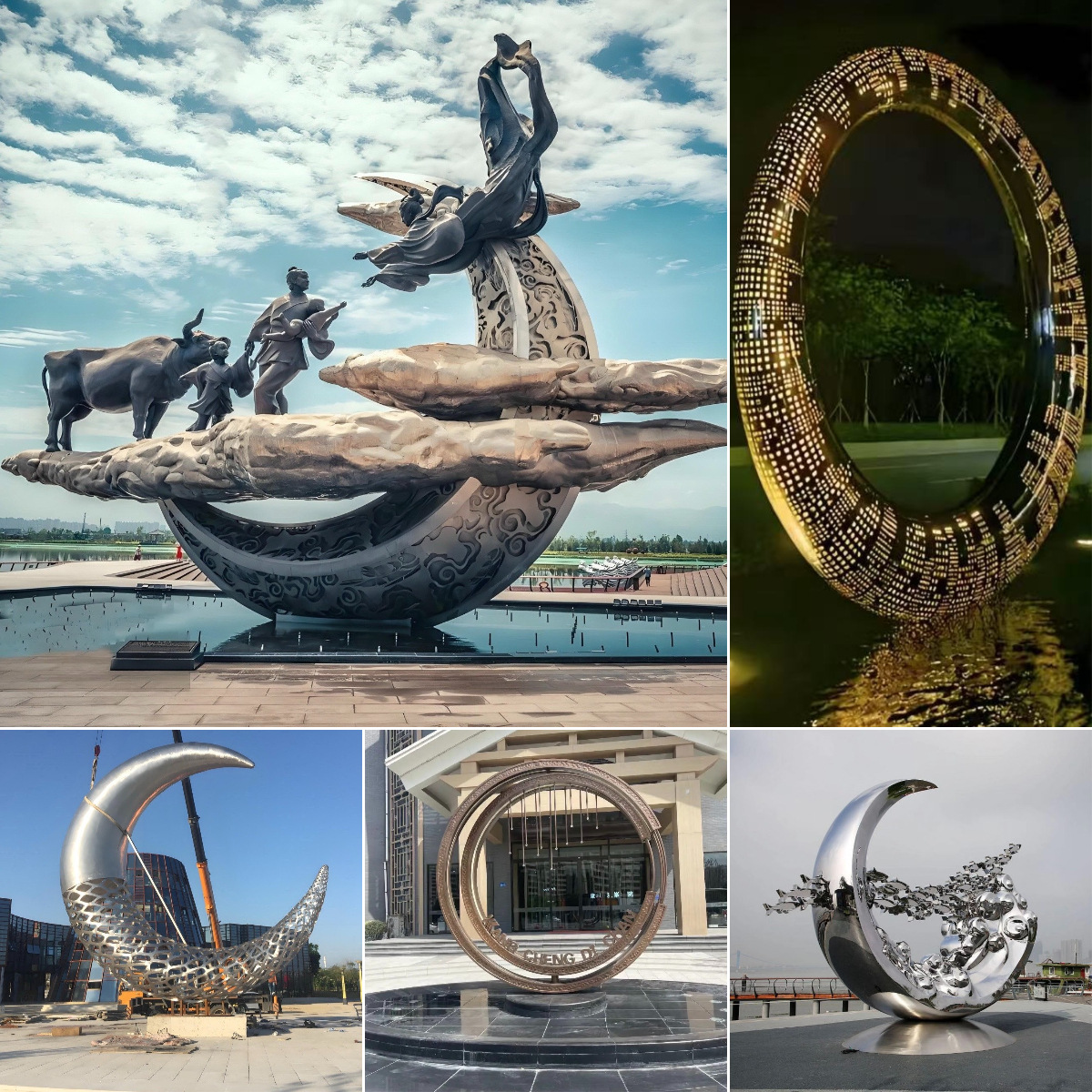 대형 스테인레스 스틸 달 조각 맞춤형 거울 빛나는 반지 야외 수경 광장 부동산 장식 장식품