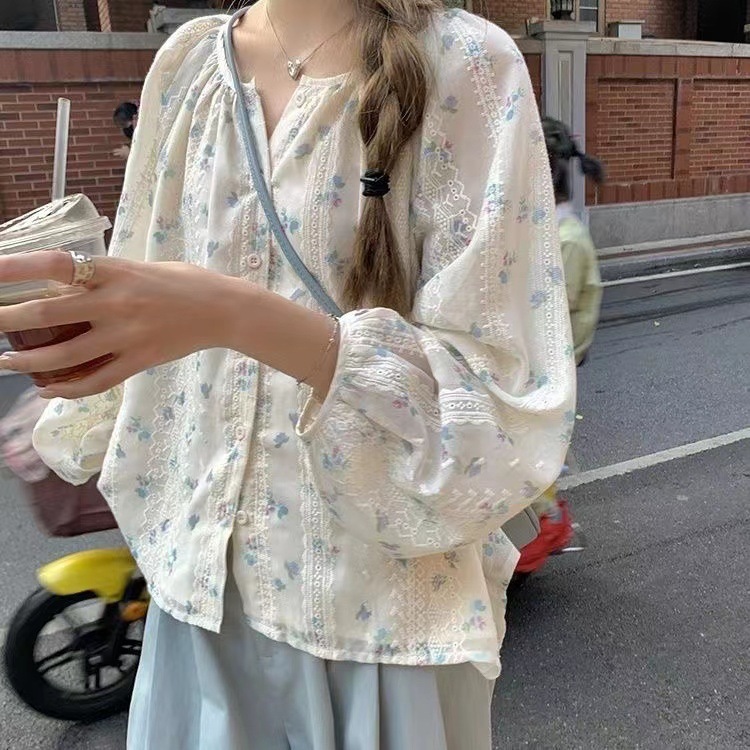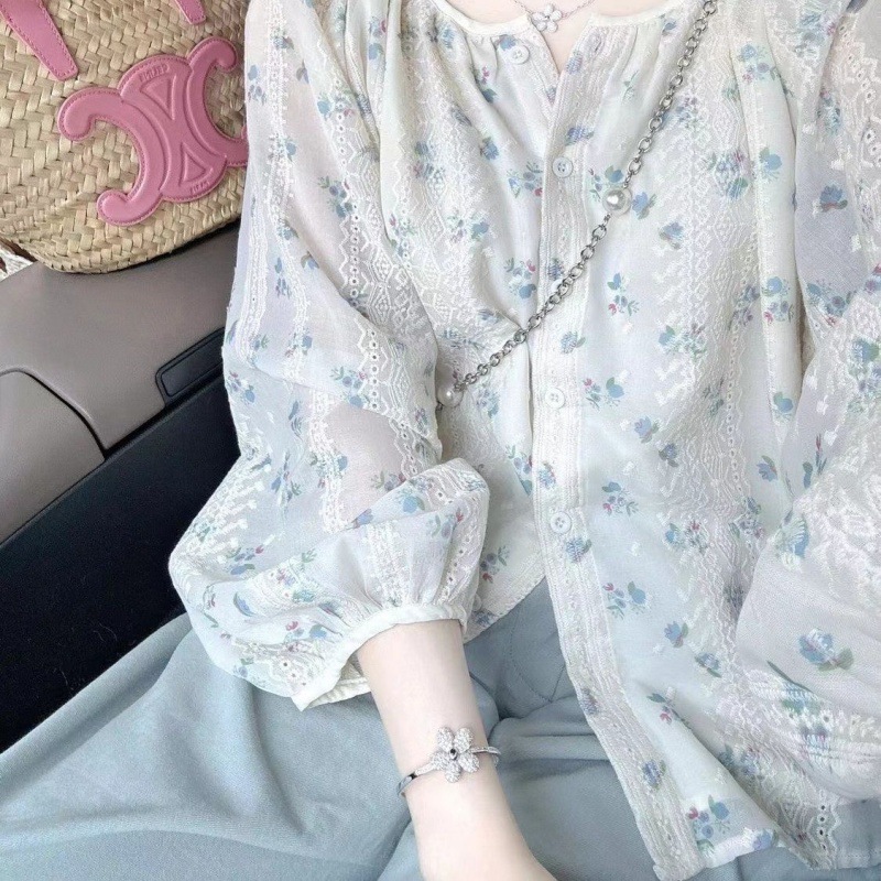 홍콩 스타일 달콤하고 신선한 꽃무늬 쉬폰 셔츠 긴팔 셔츠 여름 신작 여학생 루즈 슬리밍 자외선 차단 셔츠스토어 가기