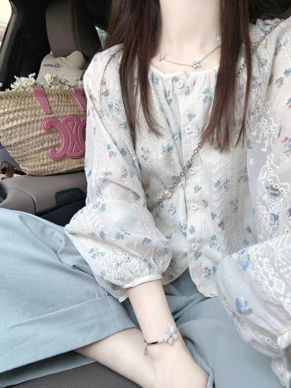 홍콩 스타일 달콤하고 신선한 꽃무늬 쉬폰 셔츠 긴팔 셔츠 여름 신작 여학생 루즈 슬리밍 자외선 차단 셔츠