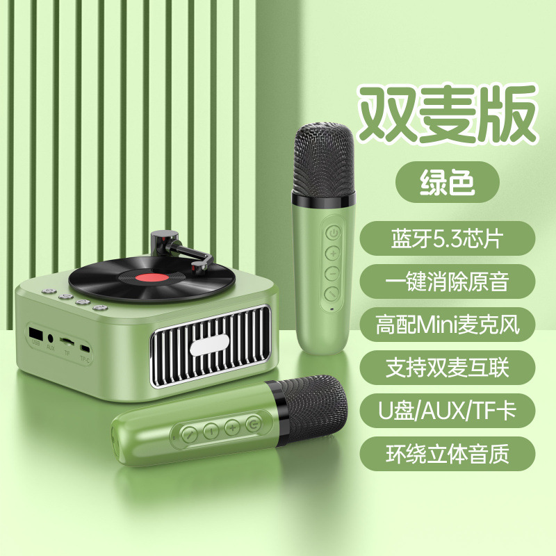 • 레코드 플레이어 노래방 스피커 [더블 마이크] 진한 녹색