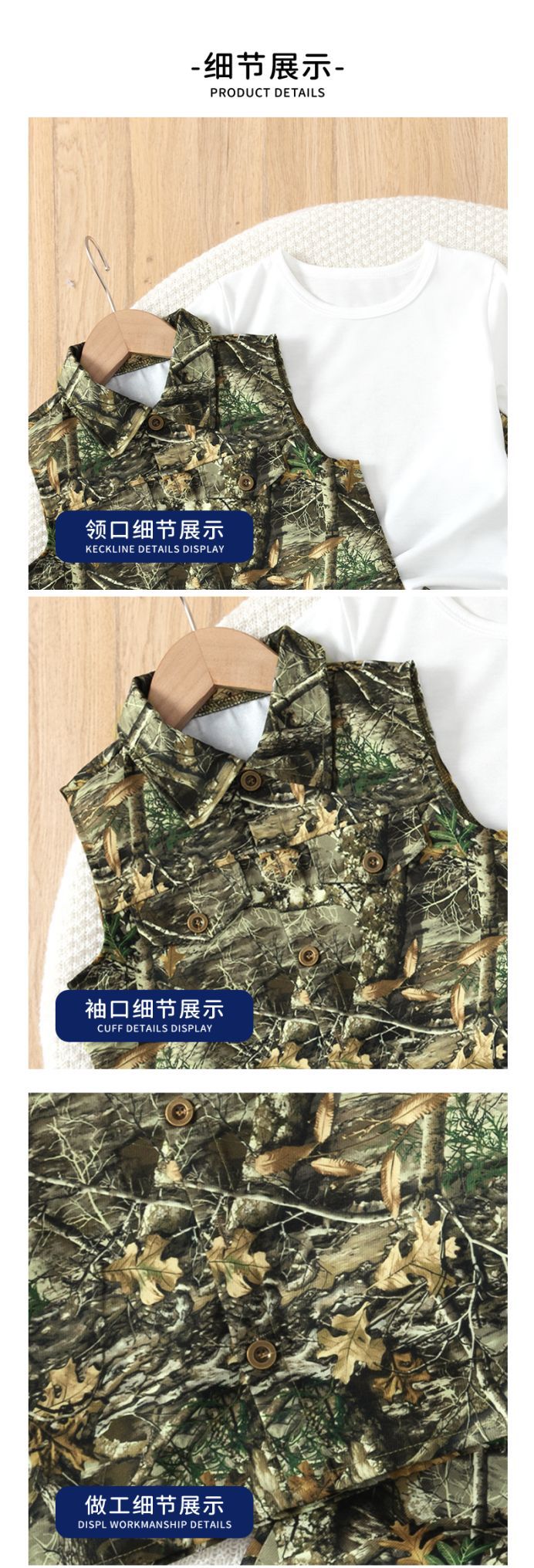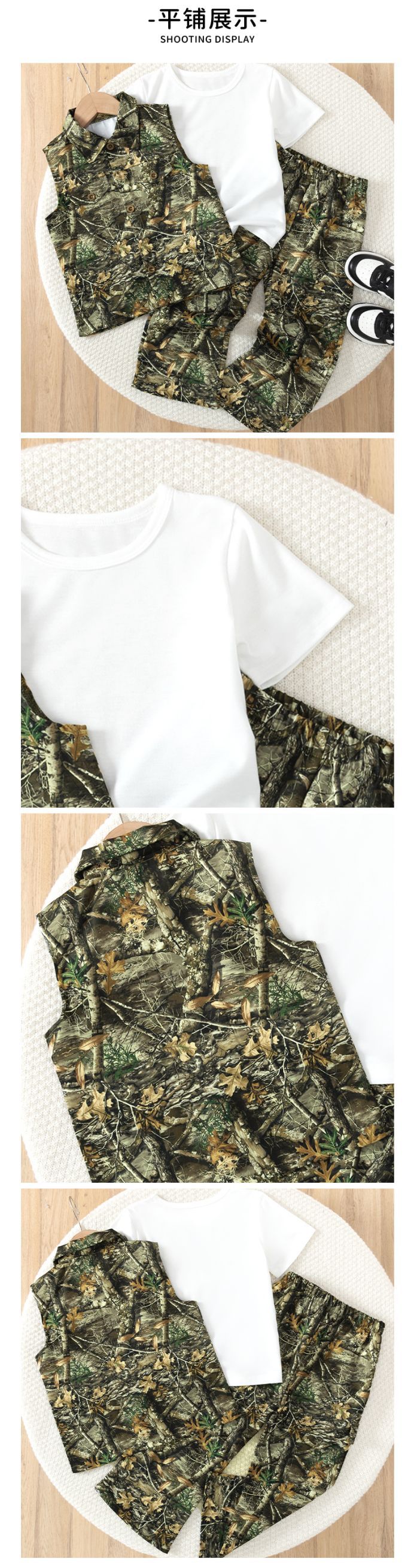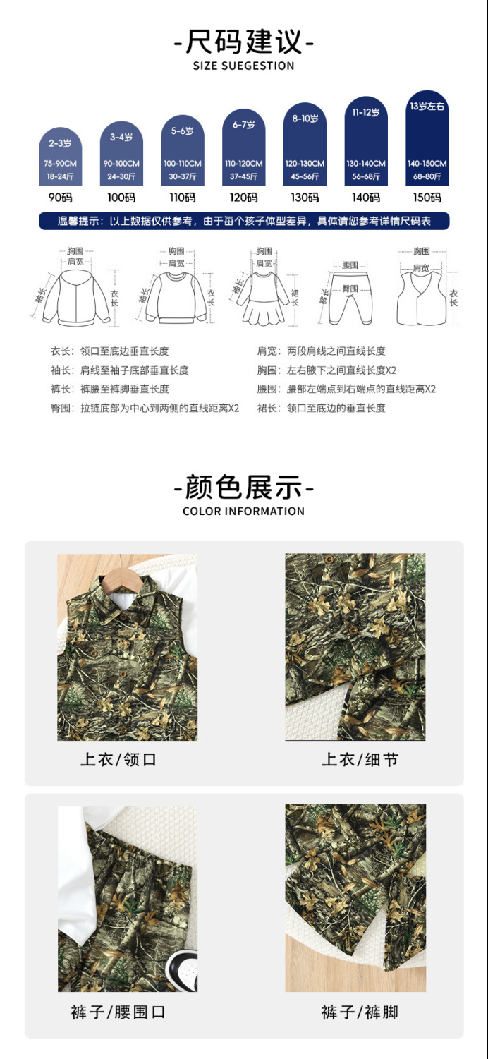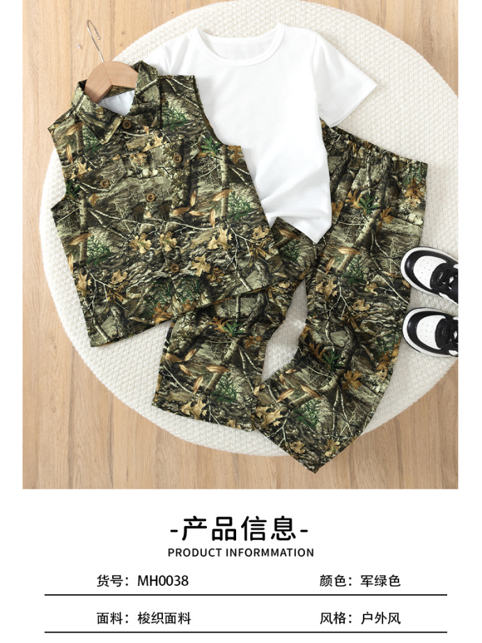 남아 여름 카모플라주 조끼 티셔츠 바지 3종 세트 가짜 포켓 디자인 아웃도어 캐주얼 아동복 반팔스토어 가기