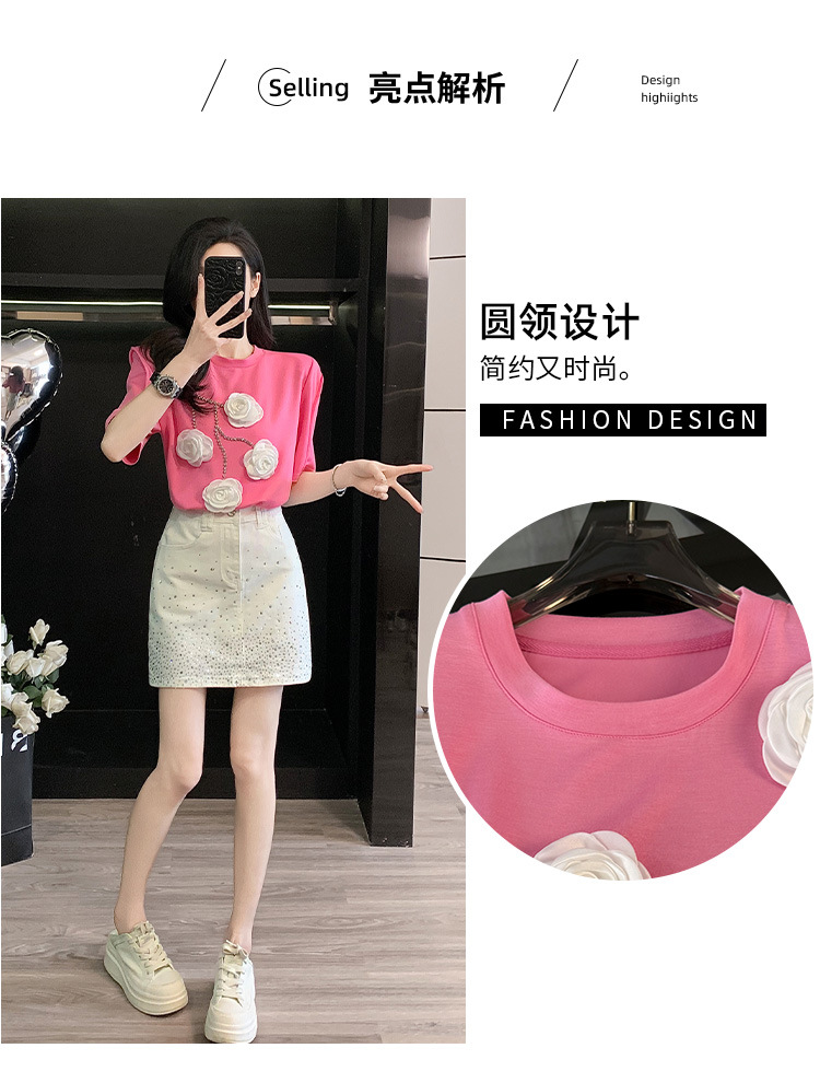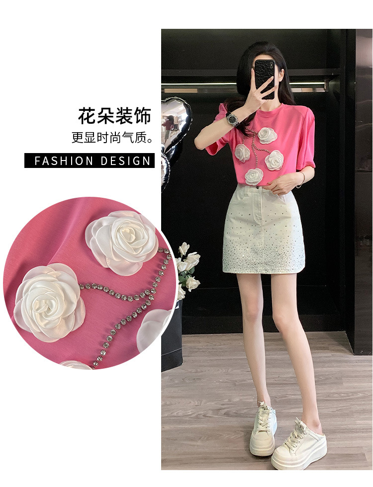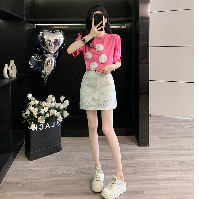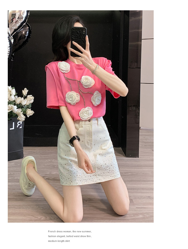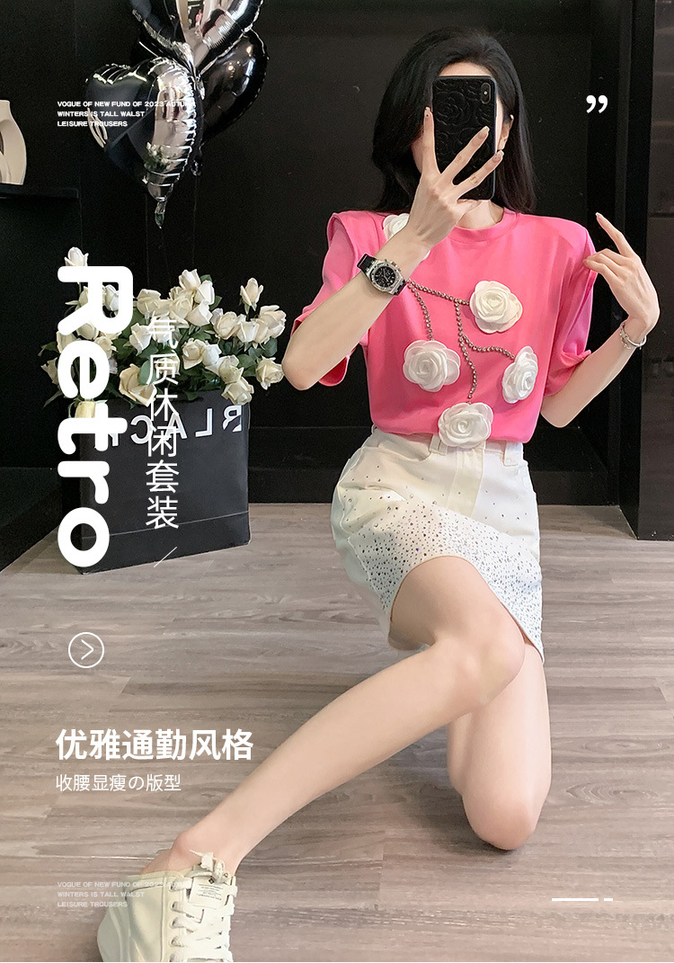 여름은 여성의 프랑스 중장비 구슬 독특한 세련된 작은 재킷 핫 드릴링 화이트 스커트 여성 세트를 착용합니다.