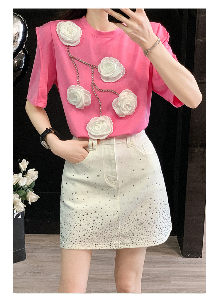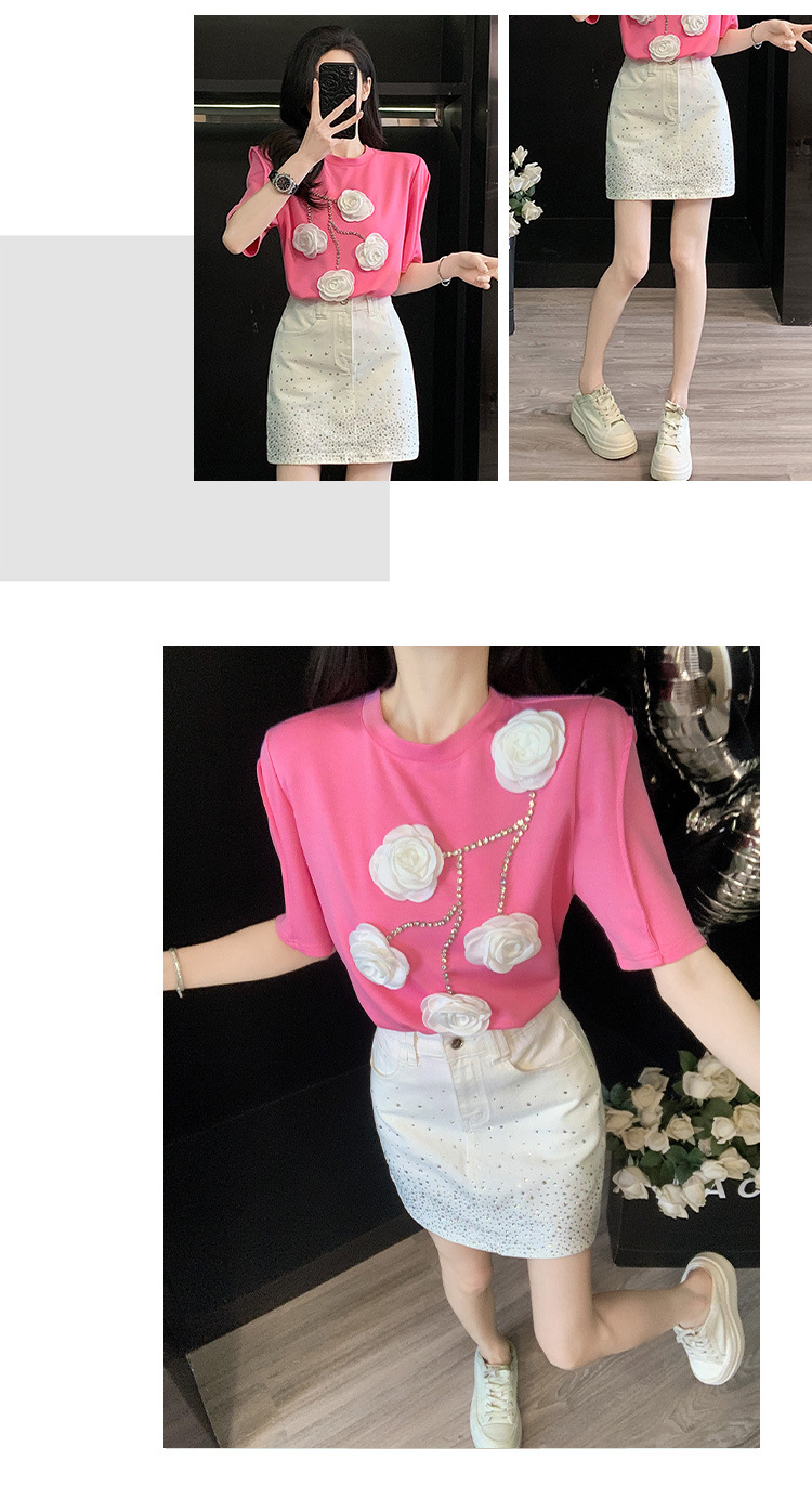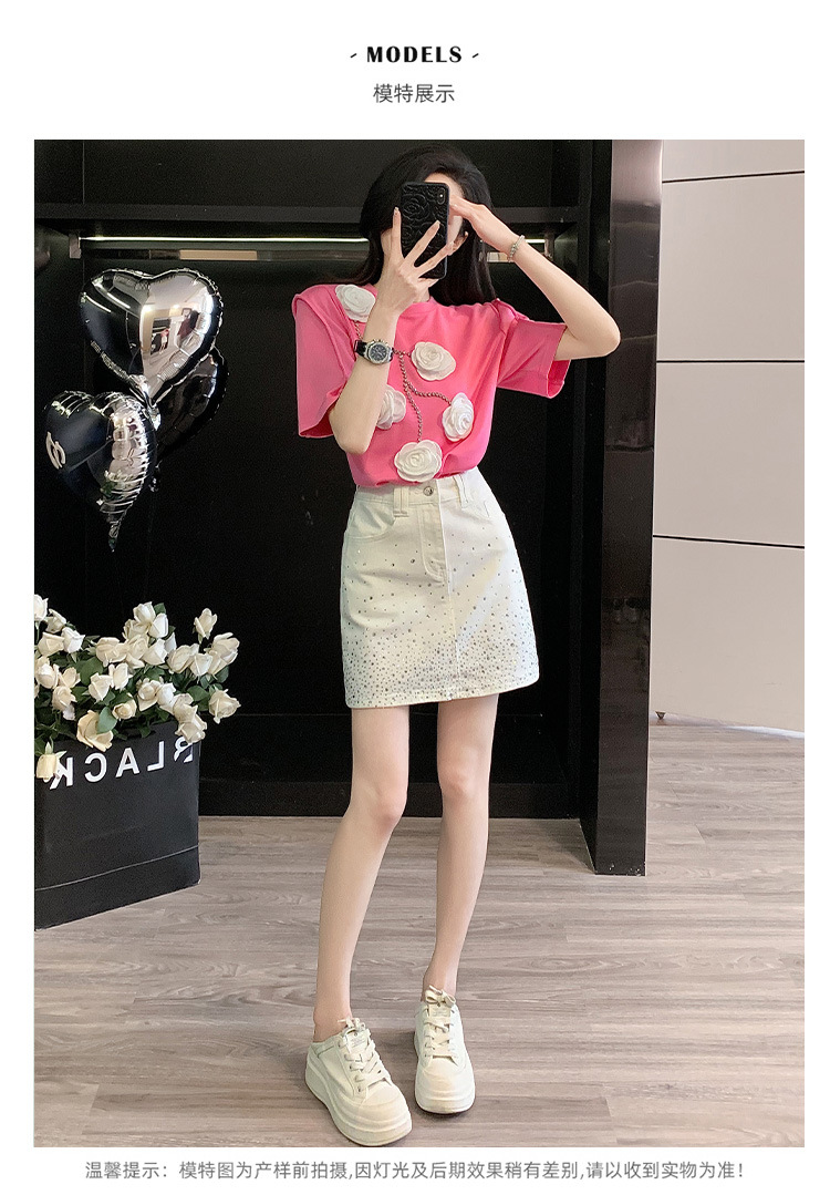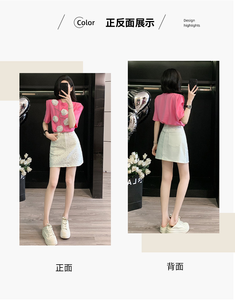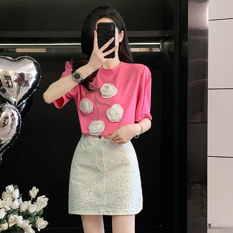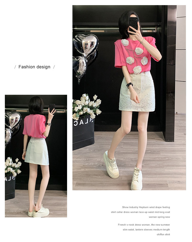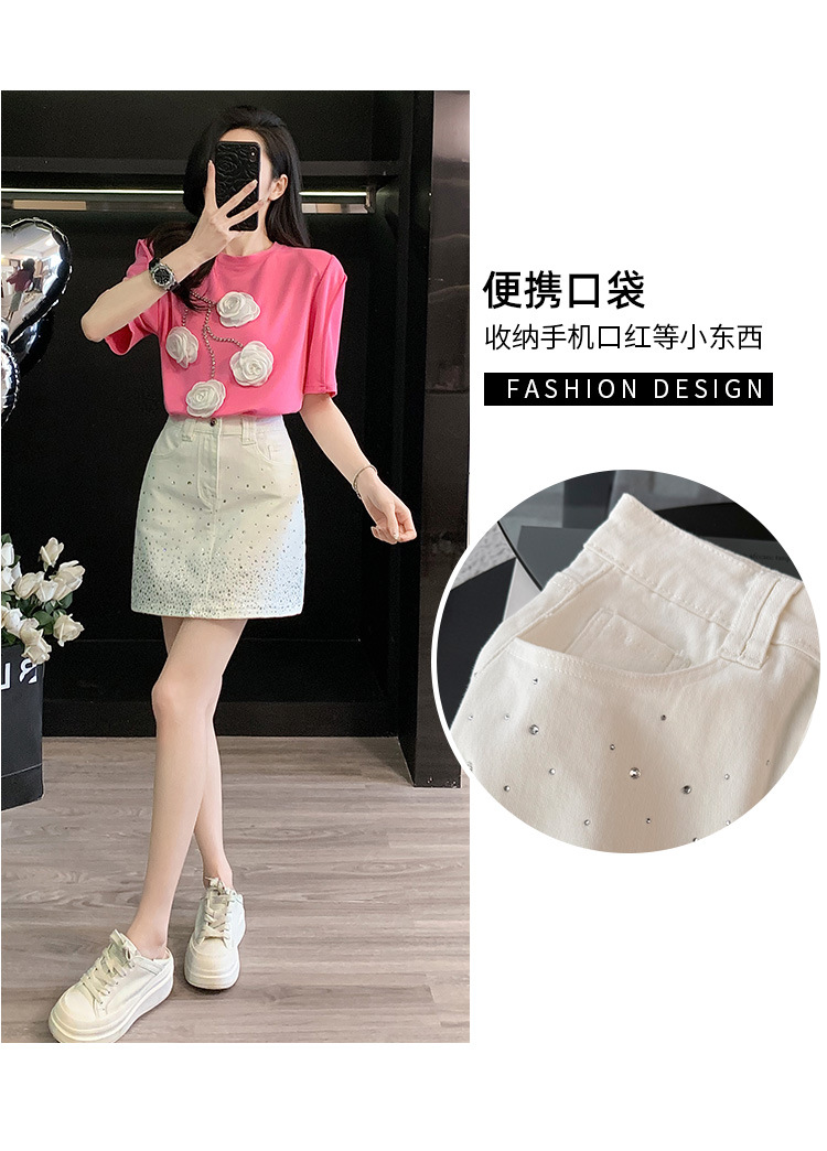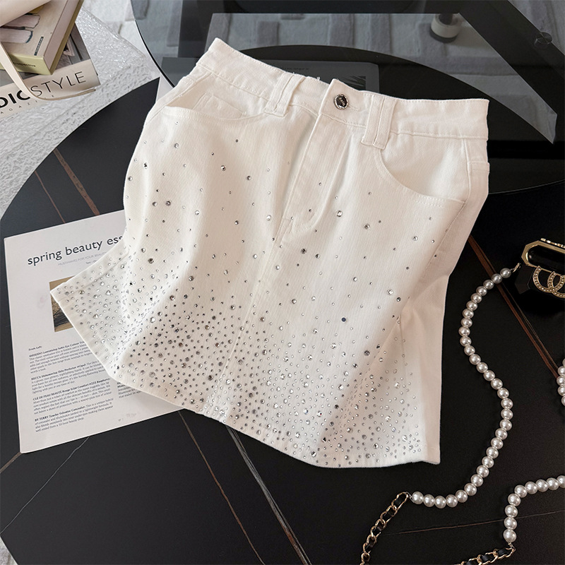 여름은 여성의 프랑스 중장비 구슬 독특한 세련된 작은 재킷 핫 드릴링 화이트 스커트 여성 세트를 착용합니다.스토어 가기