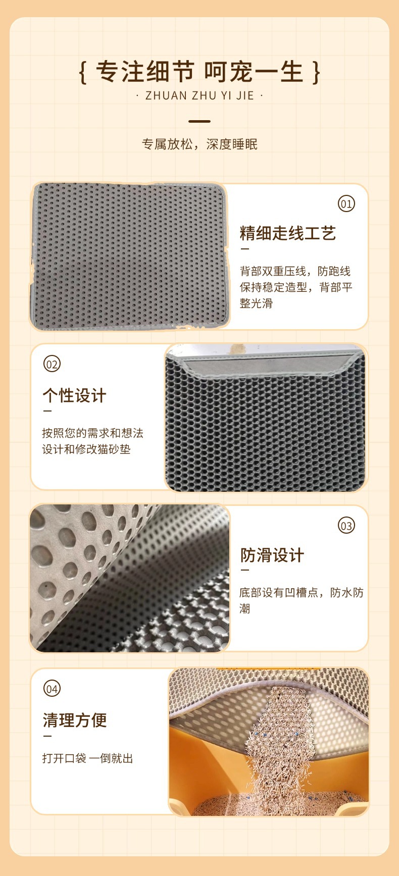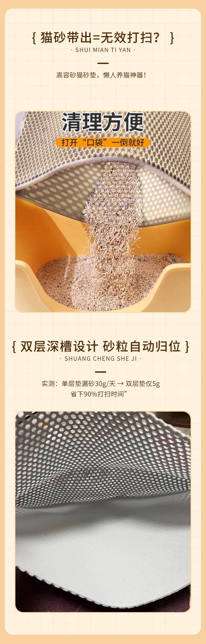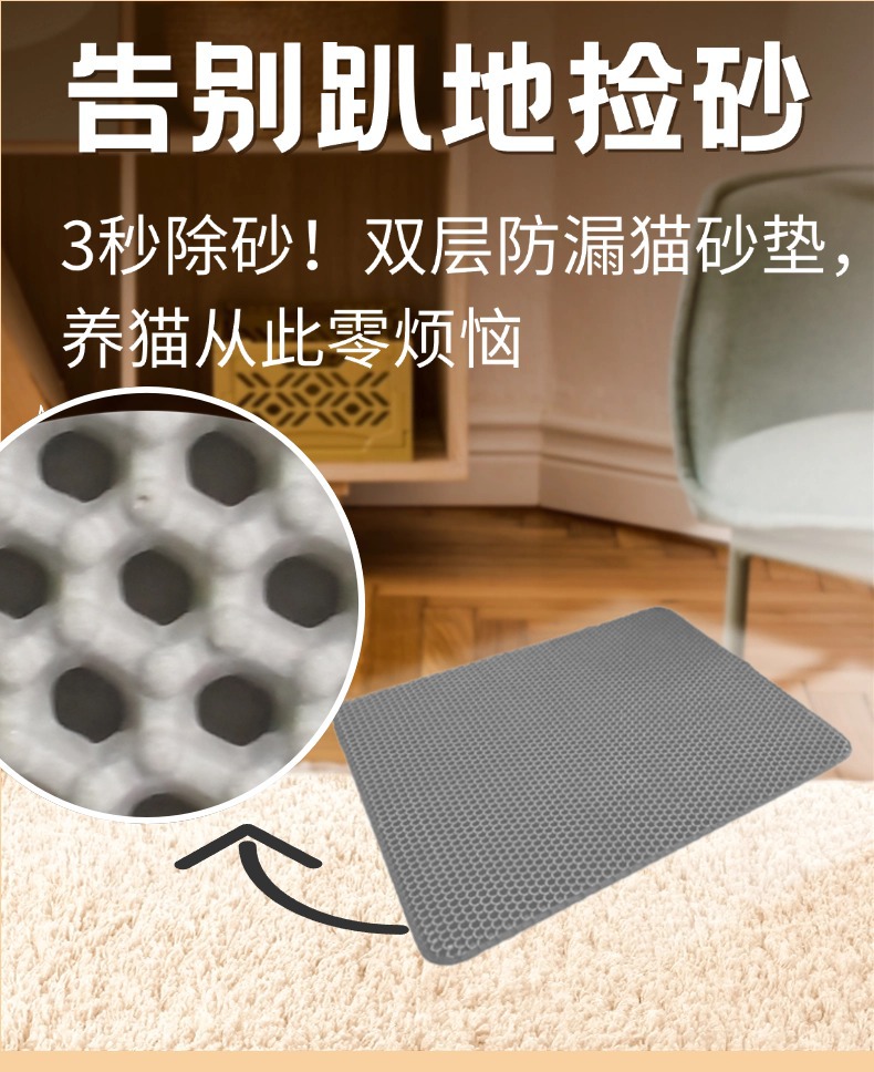 이중층 고양이 모래 매트, 휴대 방지, 벌집 누출 방지 및 미끄럼 방지 매트, 원산지 제조업체, 대형 세척 가능 모래 제어 매트, 재고 있음