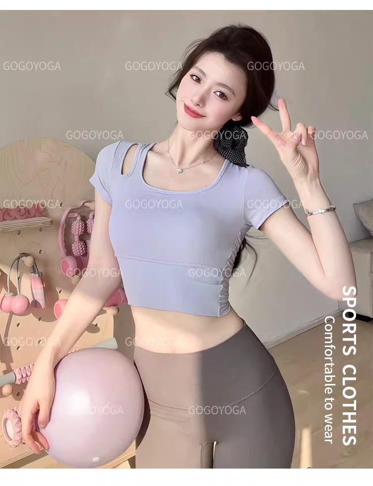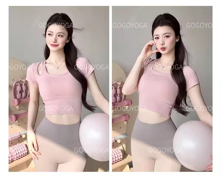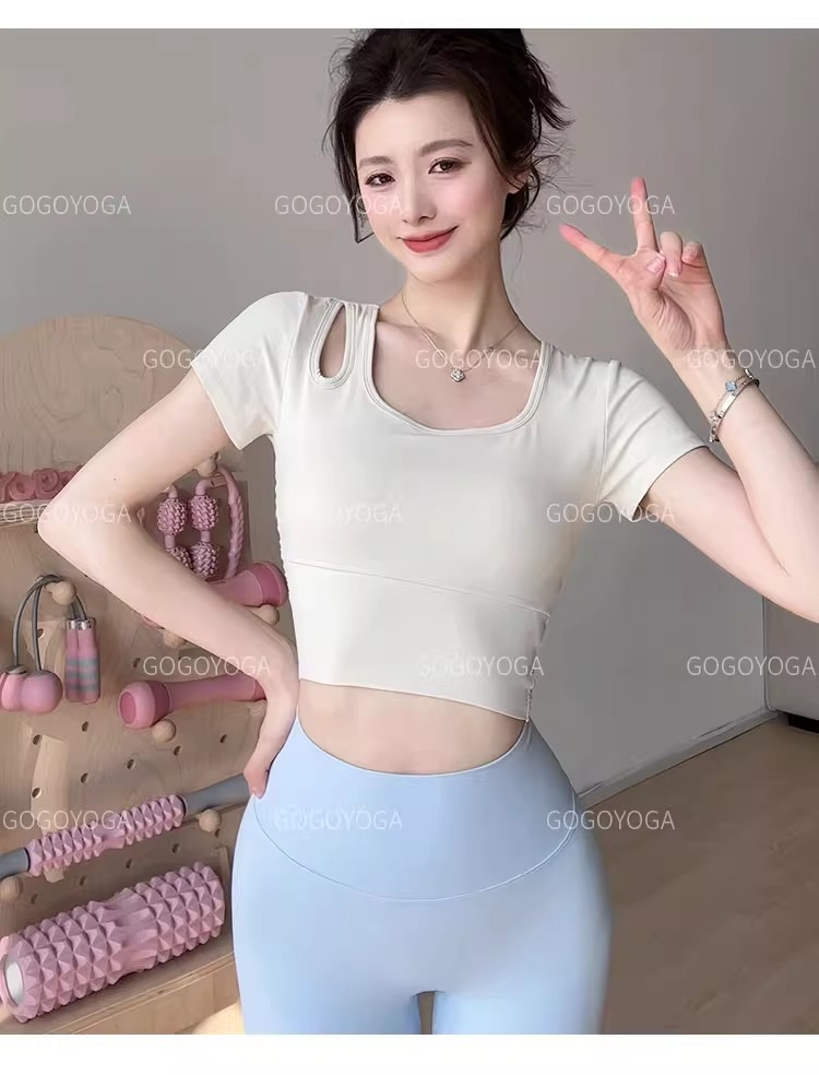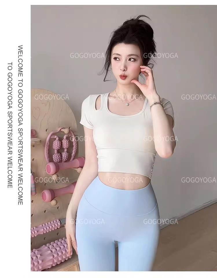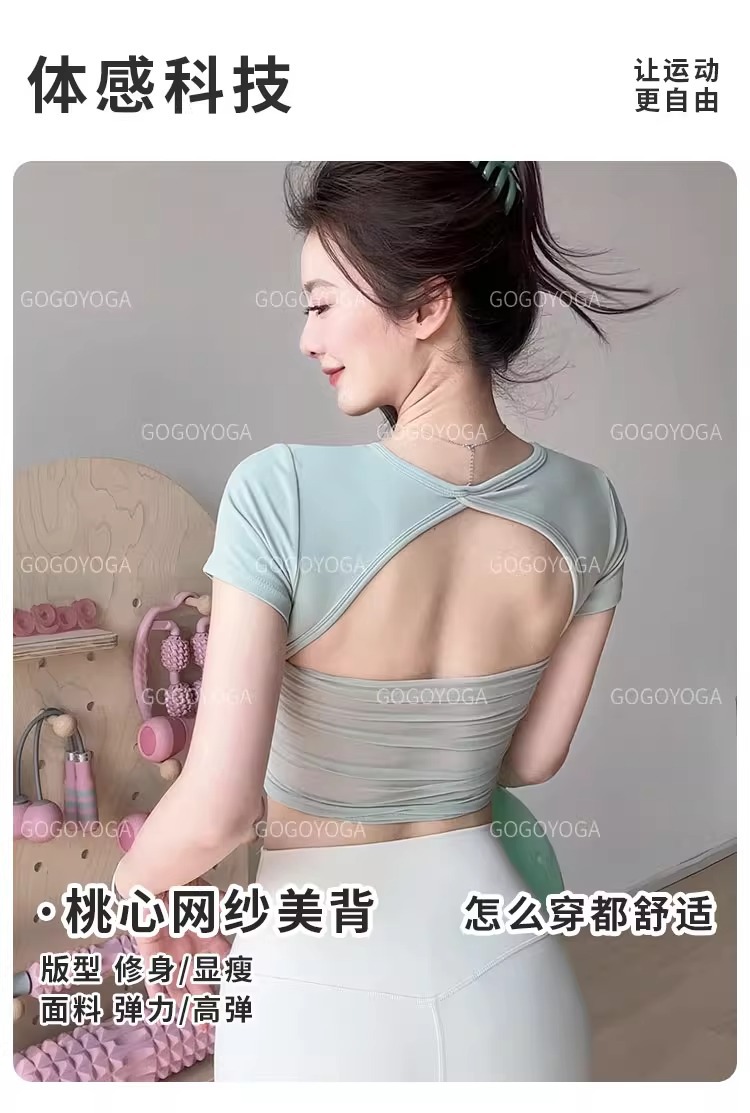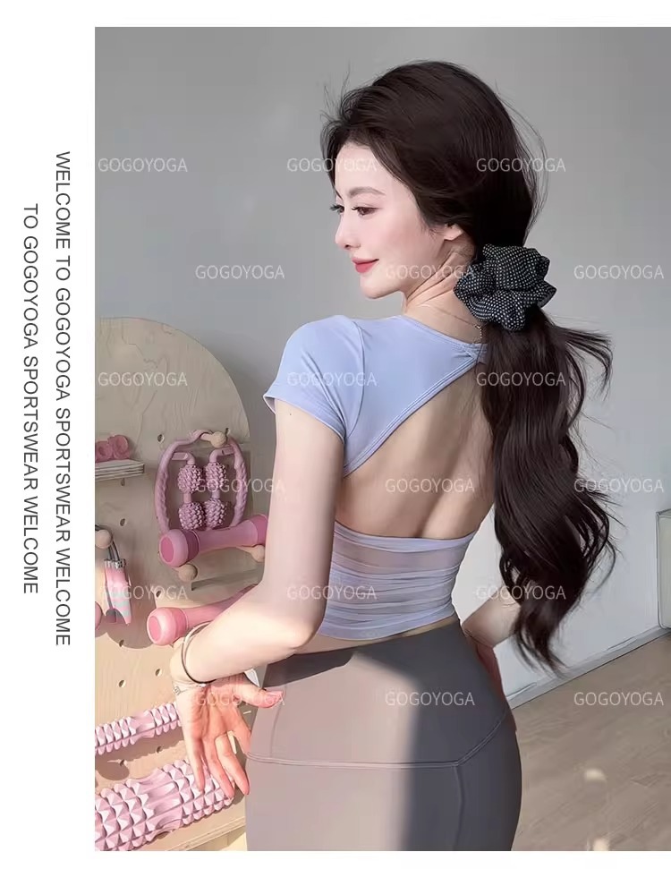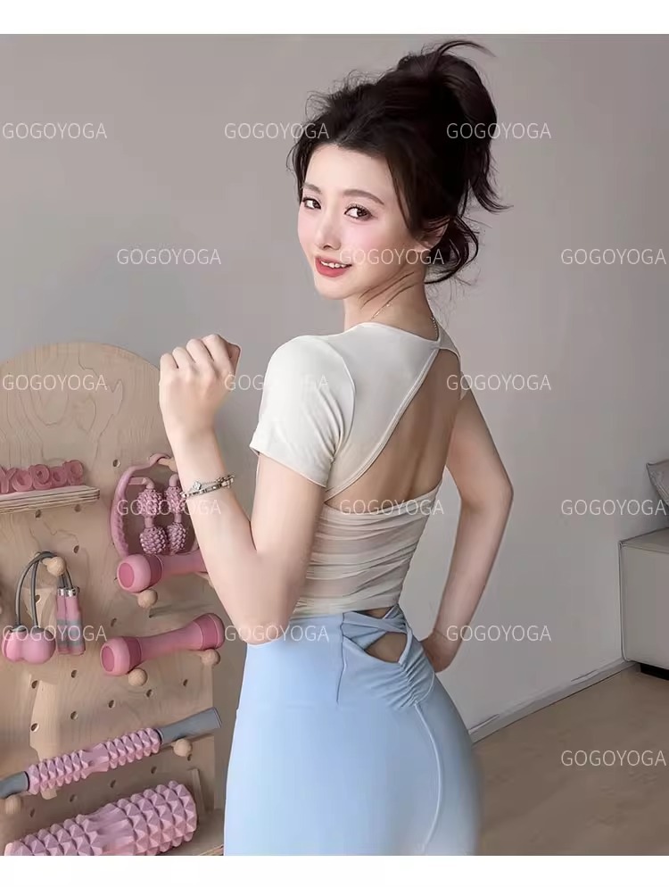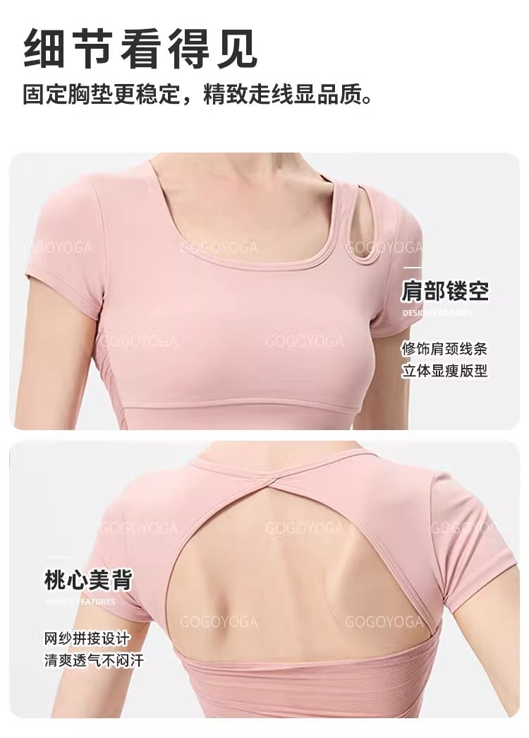요가 의류 여성 여름 패드 아름다운 백 스포츠 탑 필라테 훈련 반팔 티셔츠 달리기 피트니스 세트스토어 가기
