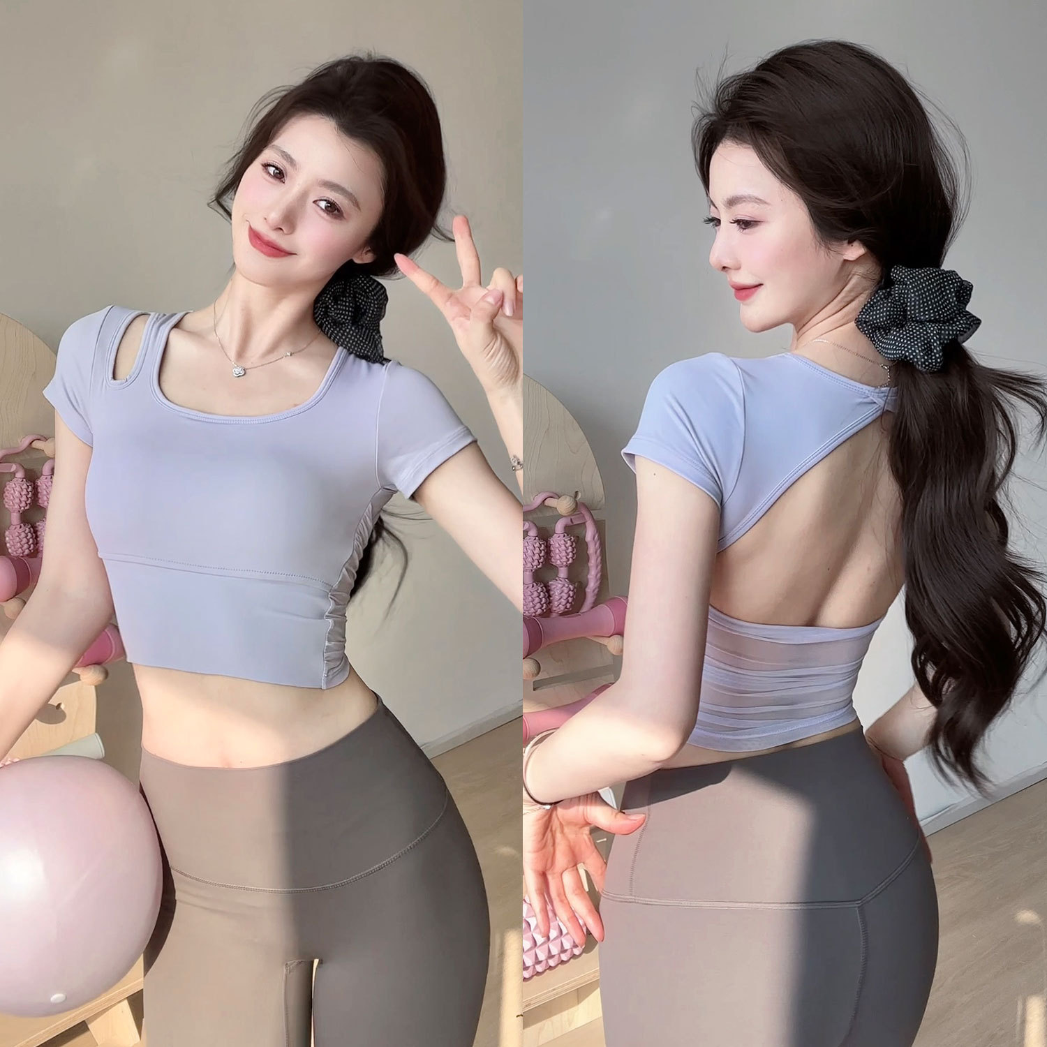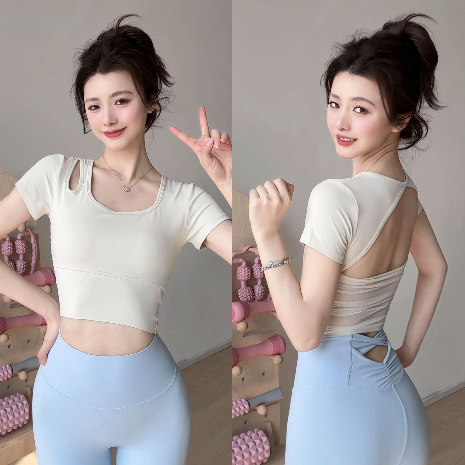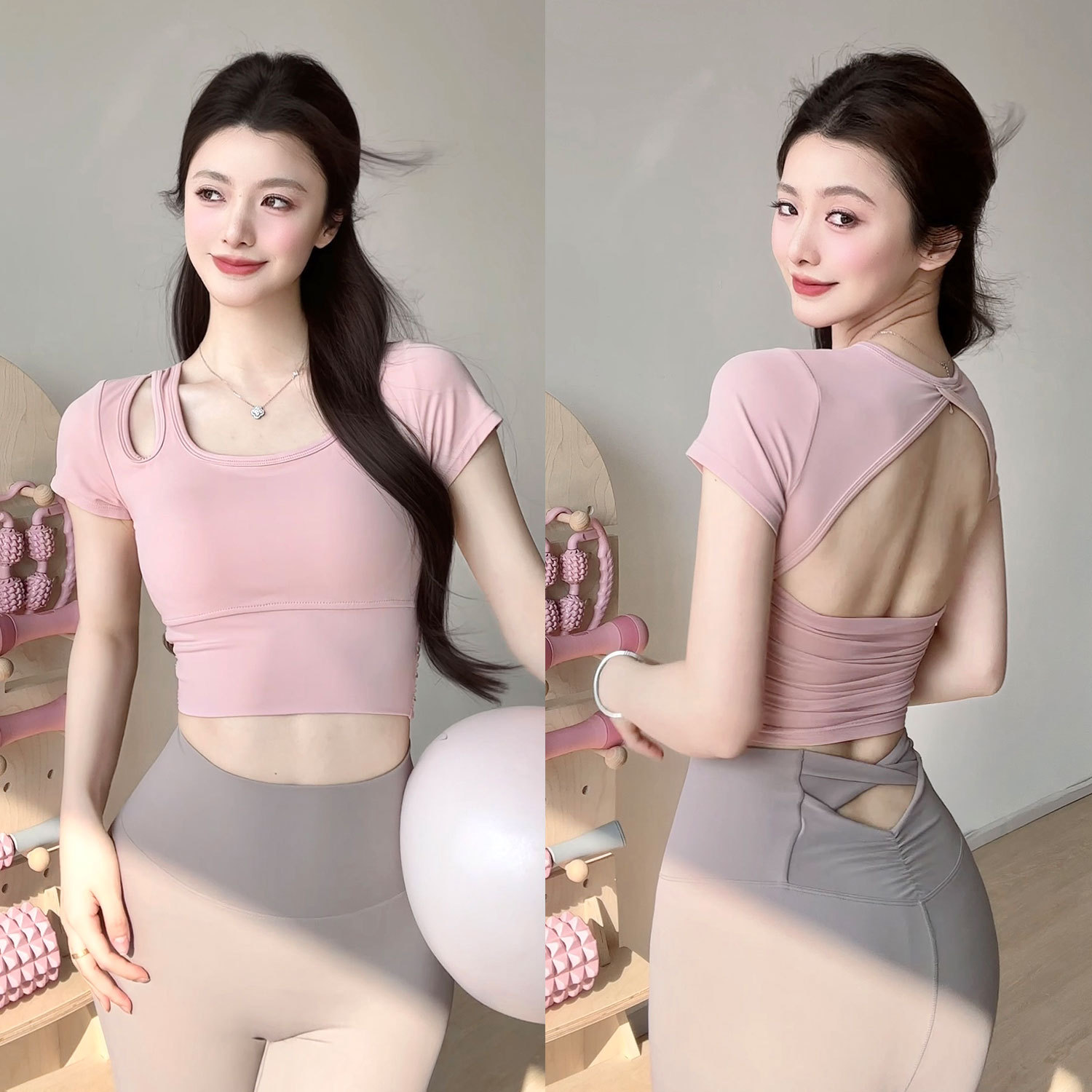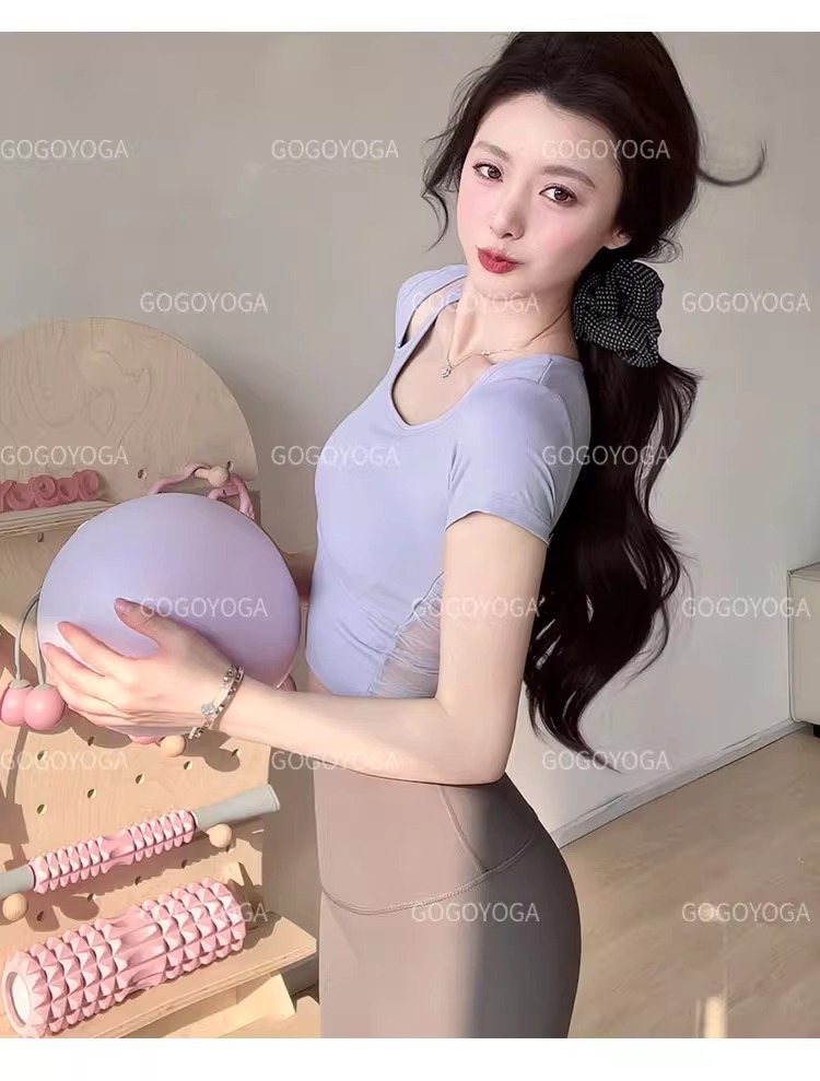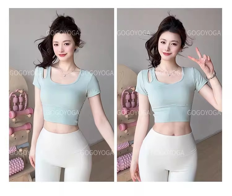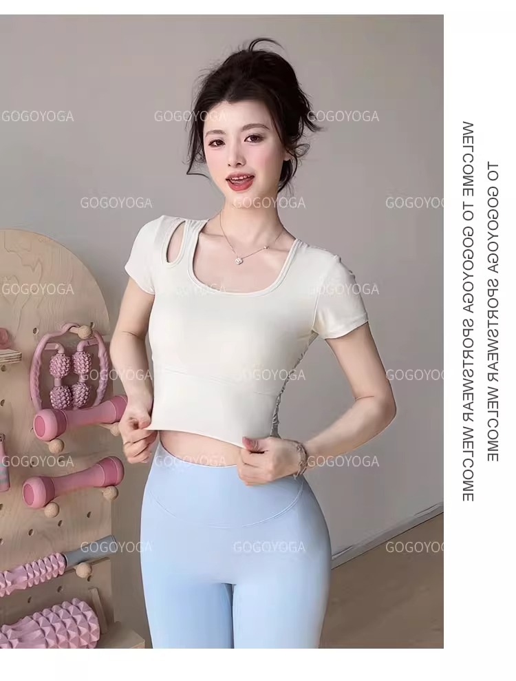 요가 의류 여성 여름 패드 아름다운 백 스포츠 탑 필라테 훈련 반팔 티셔츠 달리기 피트니스 세트스토어 가기