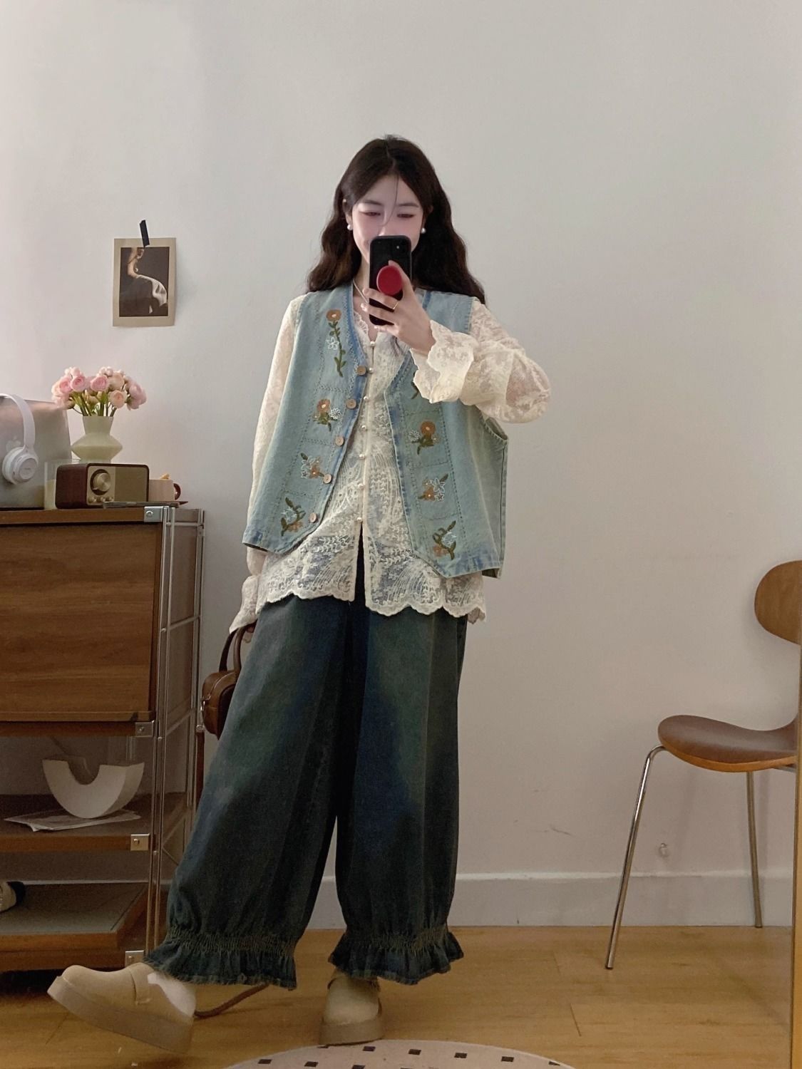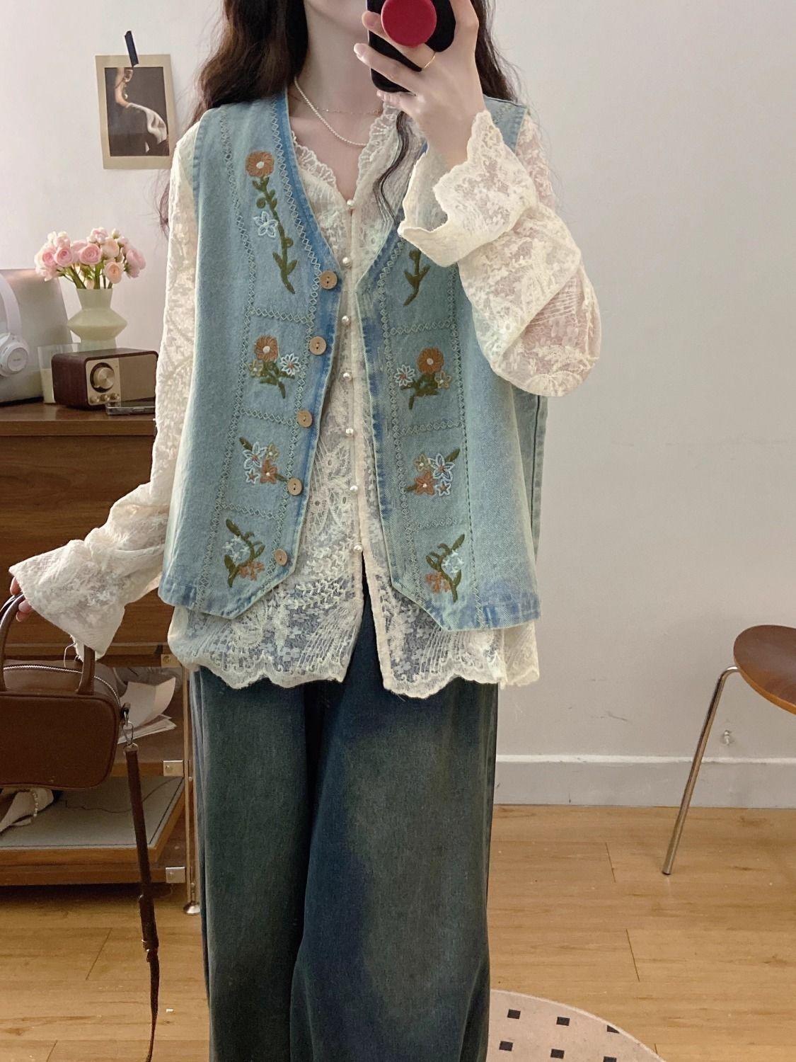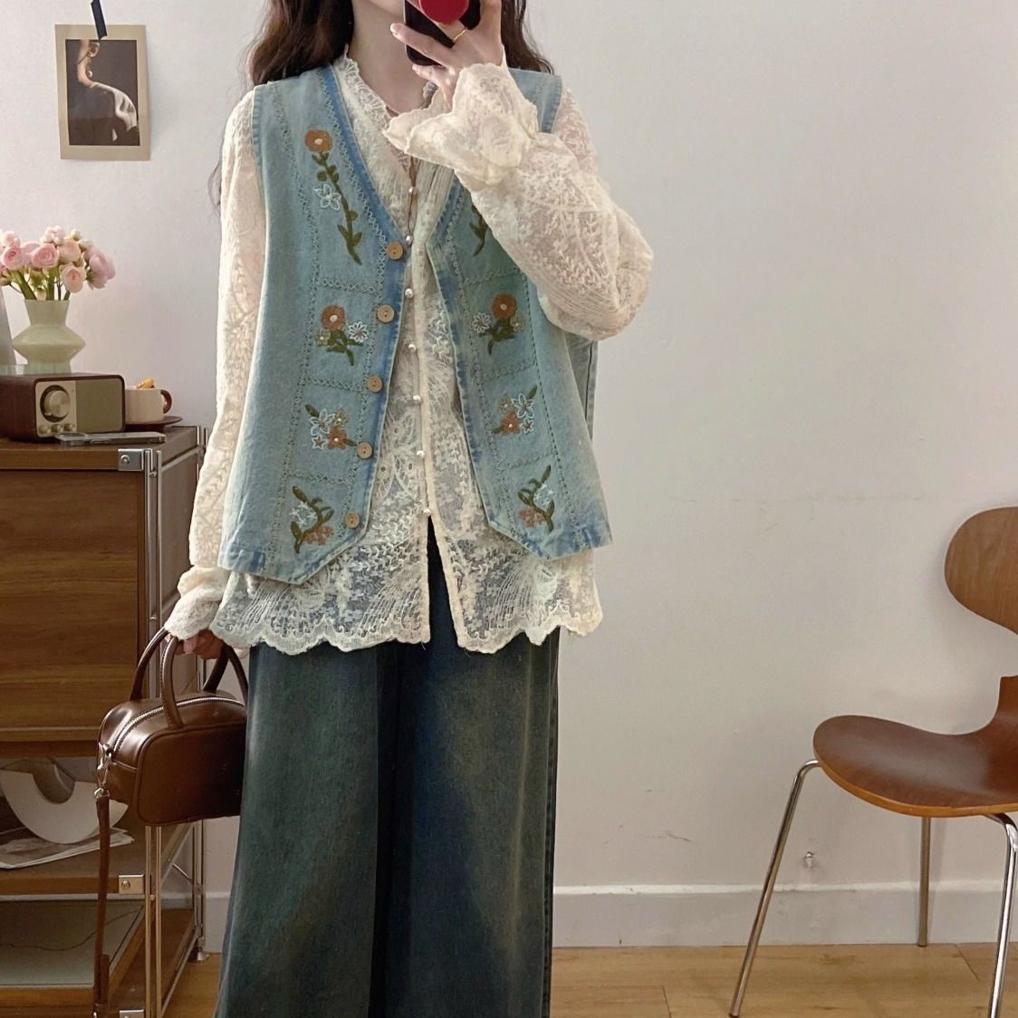 빅사이즈 솔트 스타일 2025년 신상 봄가을 자수 데님 조끼 여성 캐주얼 상의 슬림하고 달콤한 아우터스토어 가기