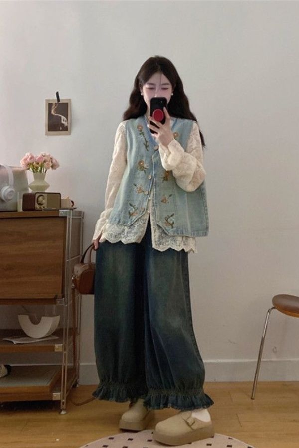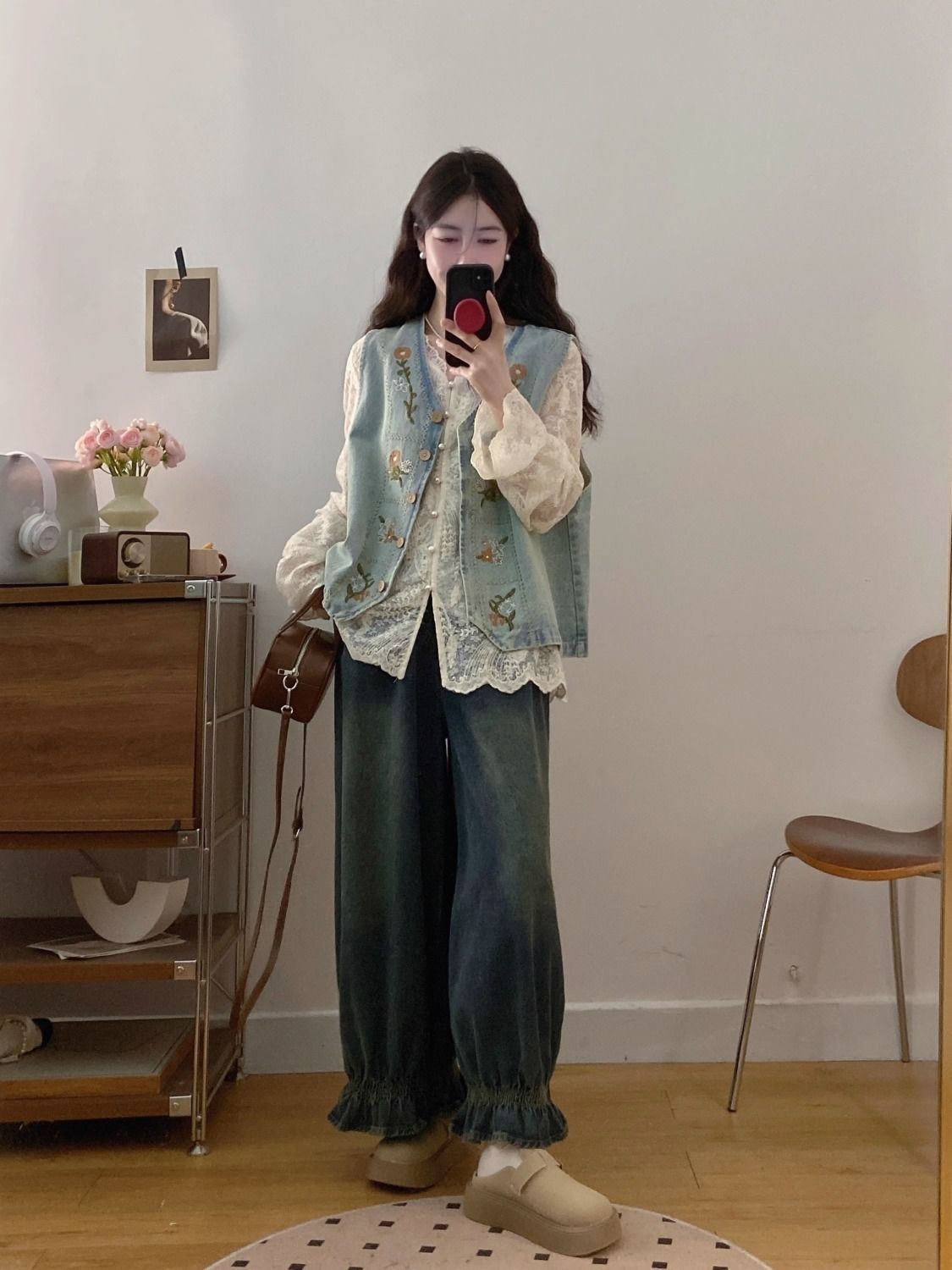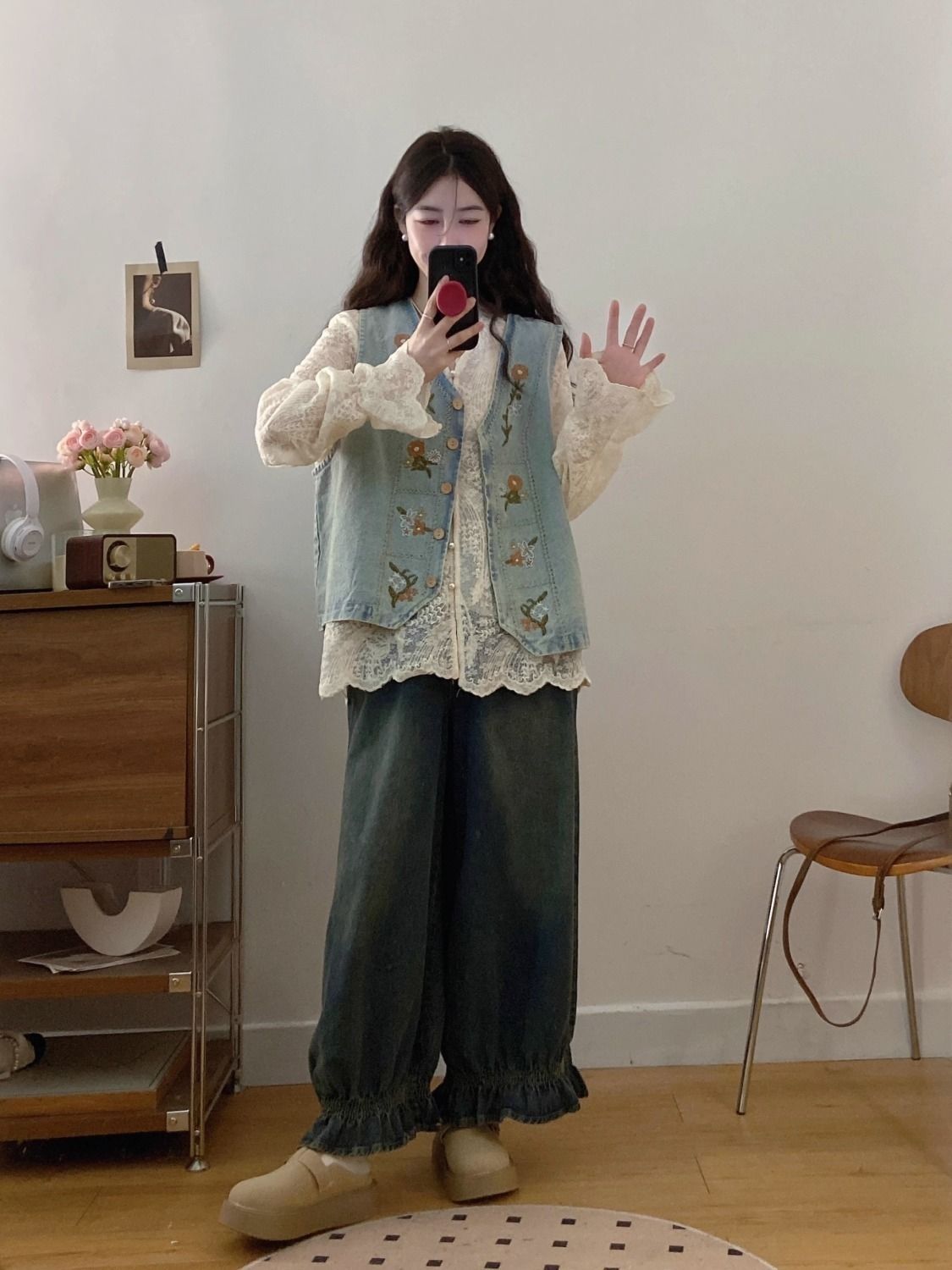 빅사이즈 솔트 스타일 2025년 신상 봄가을 자수 데님 조끼 여성 캐주얼 상의 슬림하고 달콤한 아우터스토어 가기