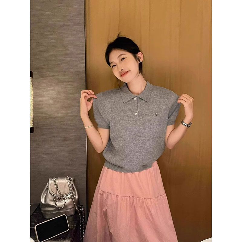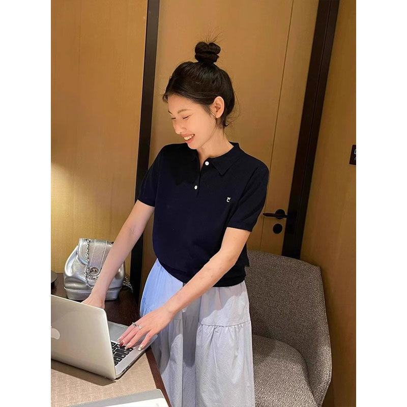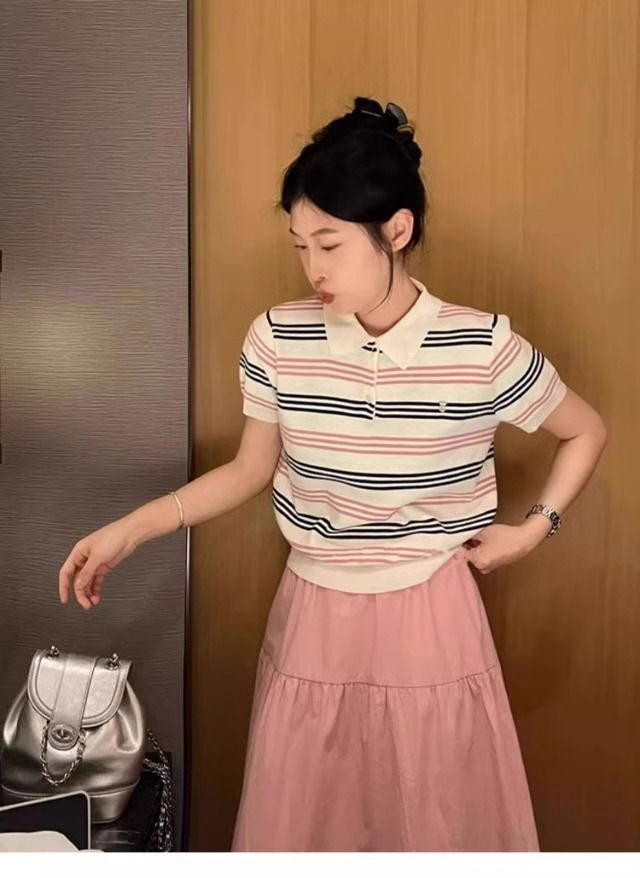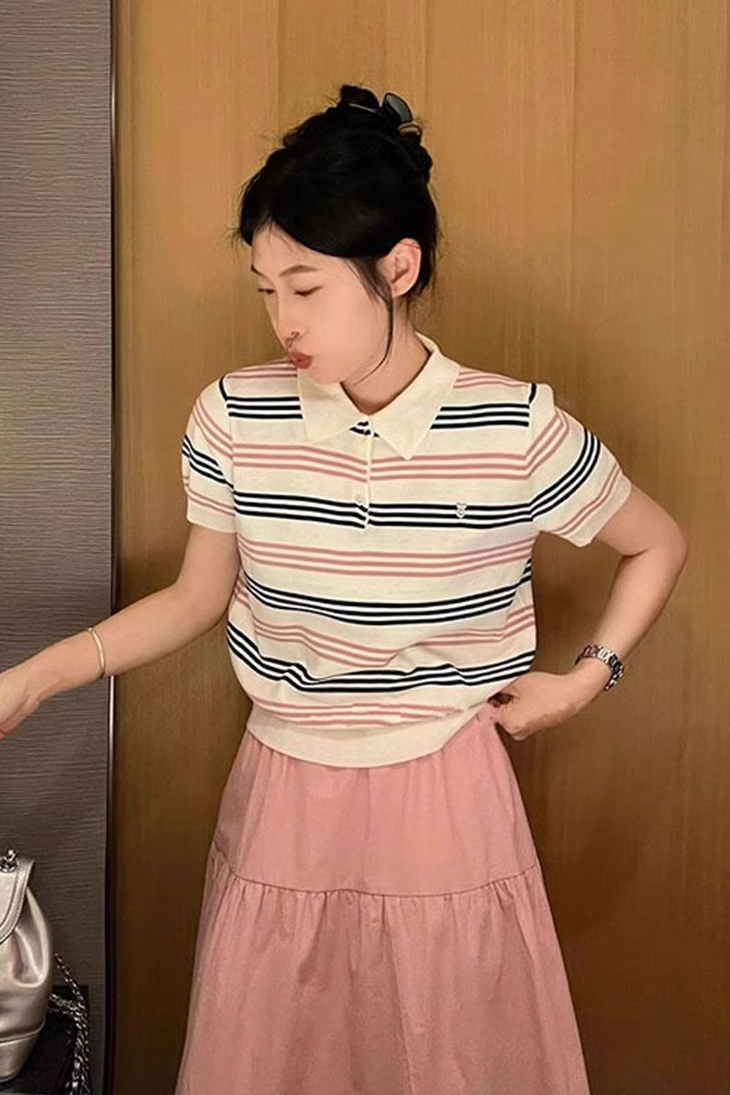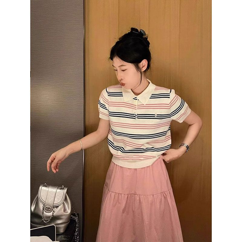 대학 스타일의 컬러 줄무늬 폴로 칼라 반팔 어깨 티셔츠 여성 여름 작은 아이스 실크 니트 쇼트 탑스토어 가기
