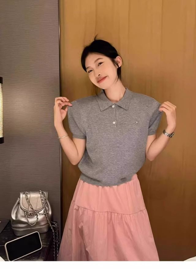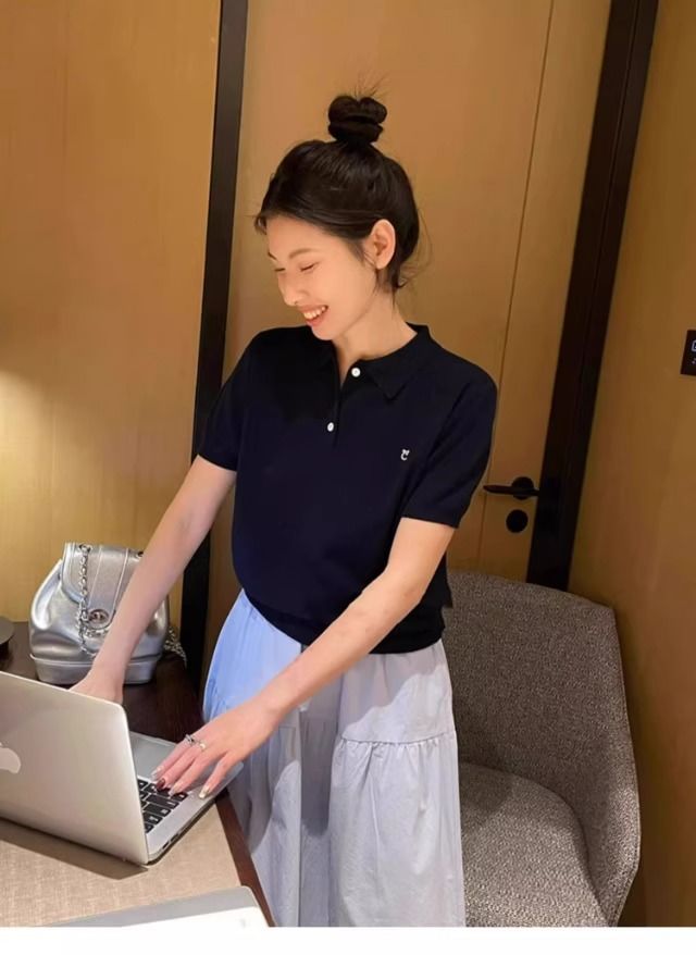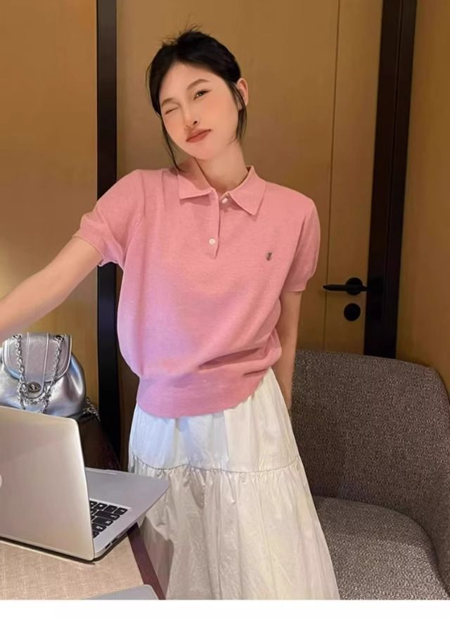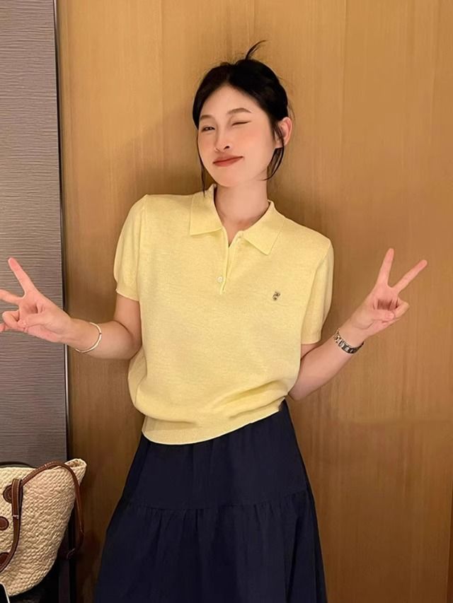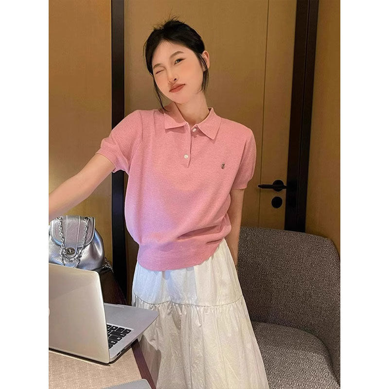대학 스타일의 컬러 줄무늬 폴로 칼라 반팔 어깨 티셔츠 여성 여름 작은 아이스 실크 니트 쇼트 탑스토어 가기