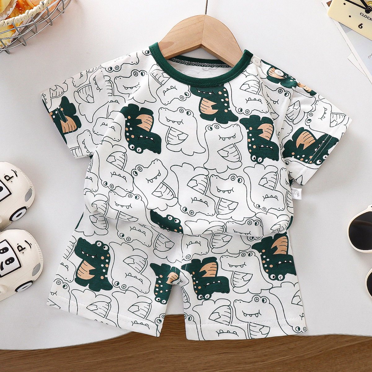 • Z-08 흰색 배경 꽃과 녹색 공룡 반팔 슈트
