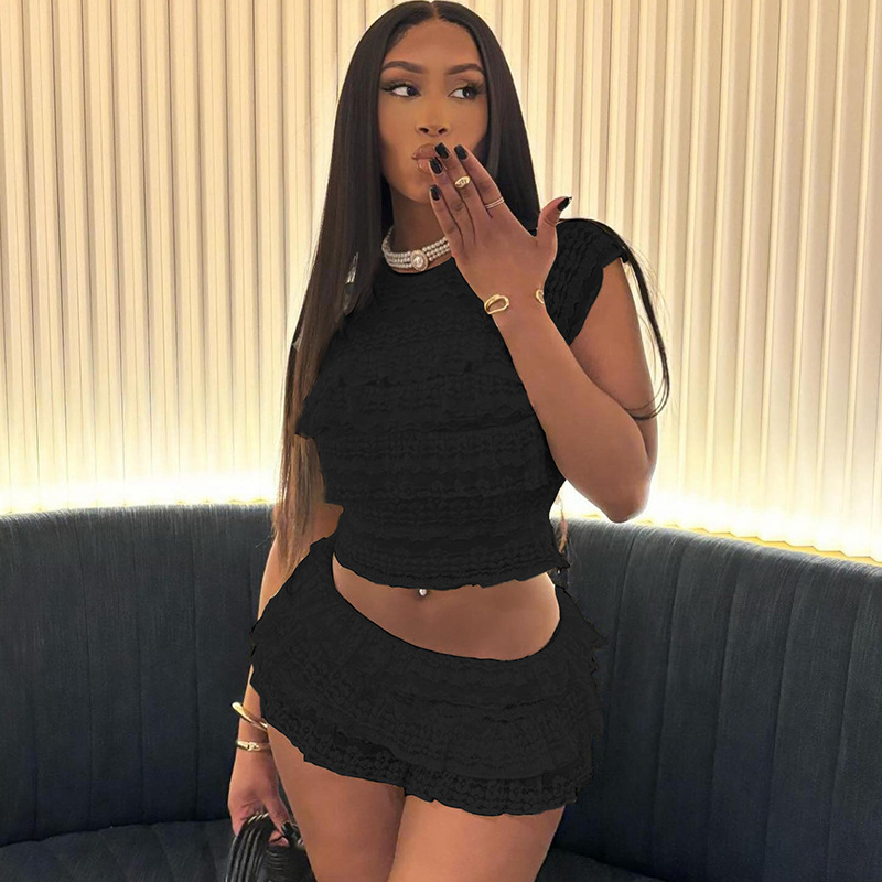 유럽과 미국의 2025년 여름 신상 패션, 달콤하고 섹시한 여성스러운 스타일의 솔리드 컬러 컷아웃 슬림핏 플리츠 반바지 세트