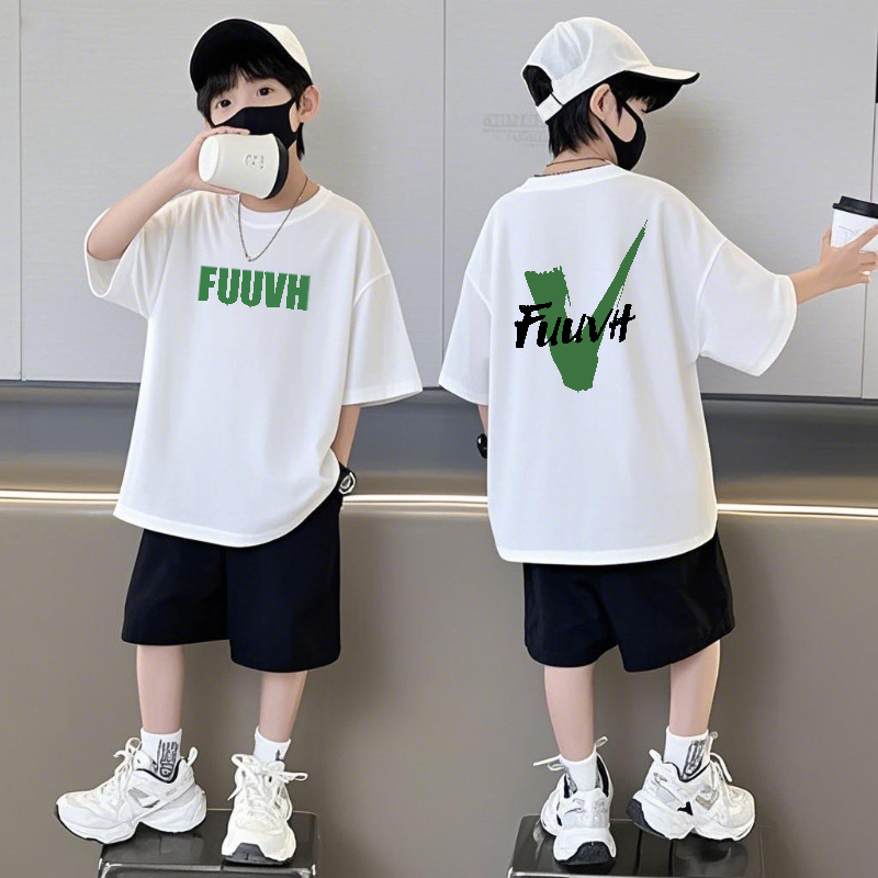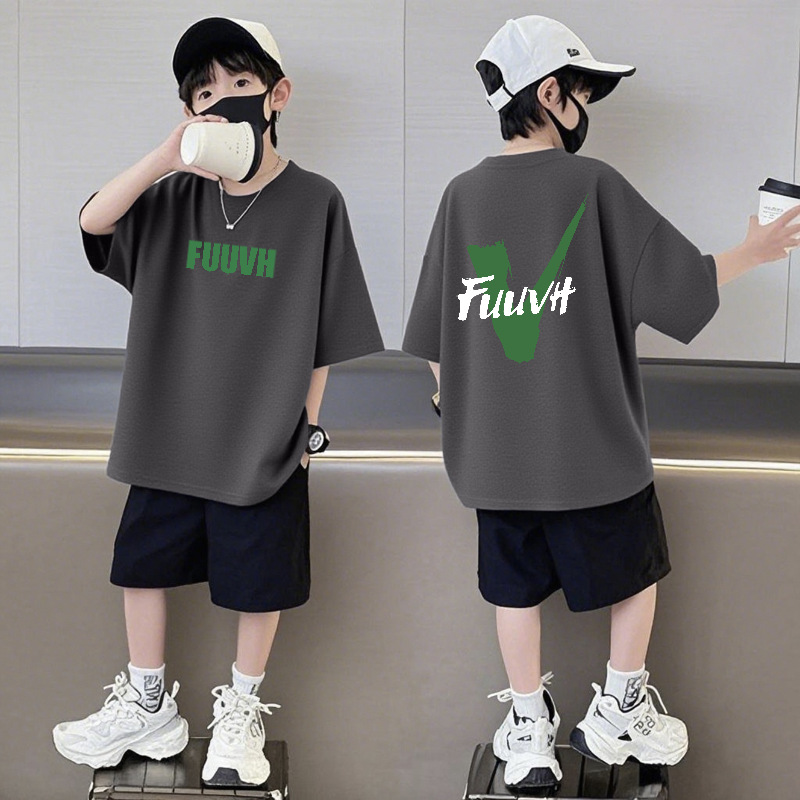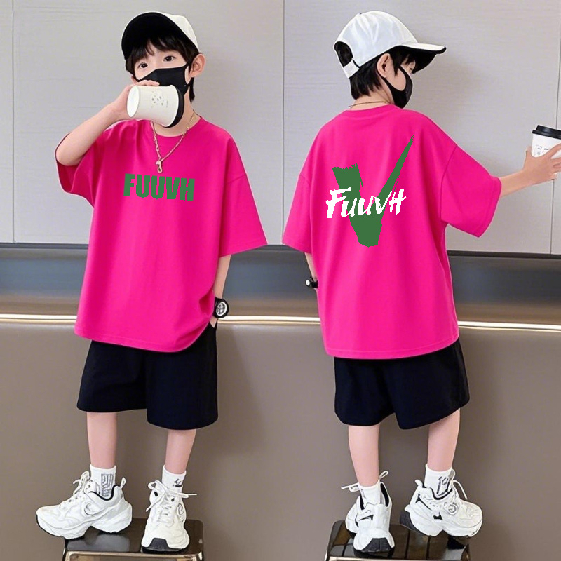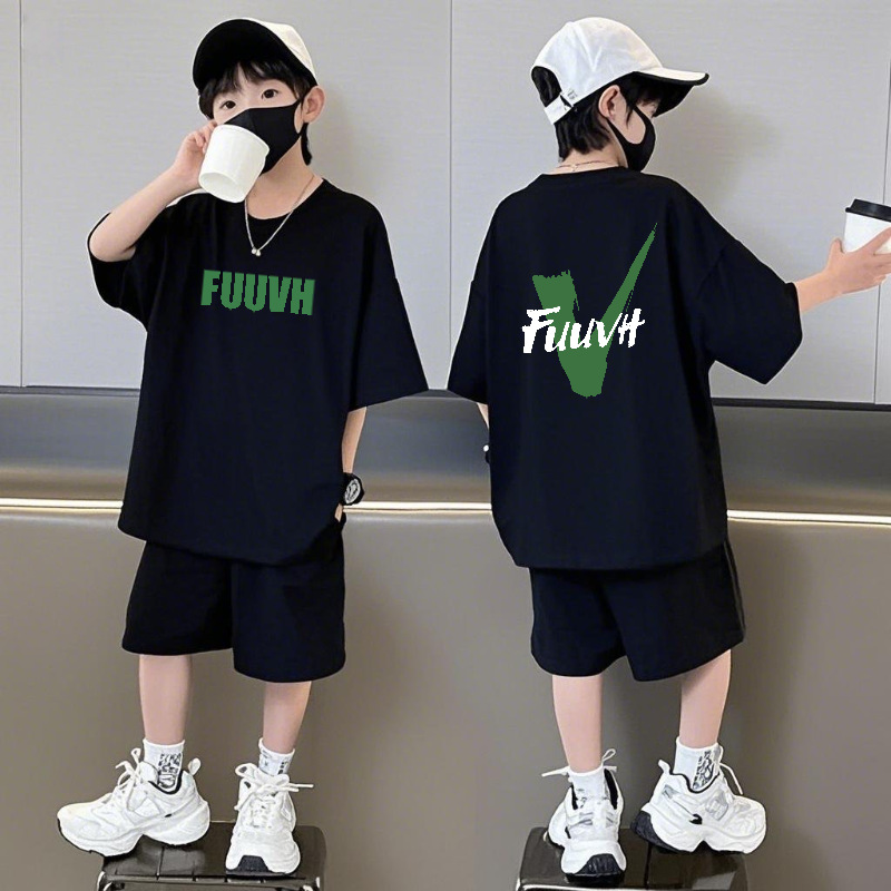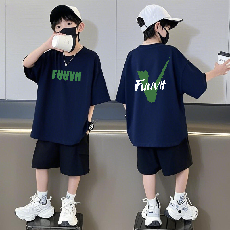 순수 코튼 반팔 반바지 소년 정장 캐주얼 패션 어린이 느슨한 라운드 넥 여름 새로운 중대형 어린이 투피스 세트스토어 가기