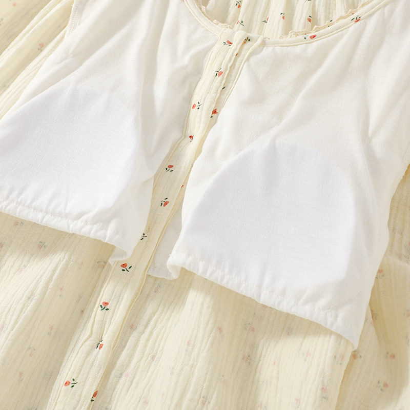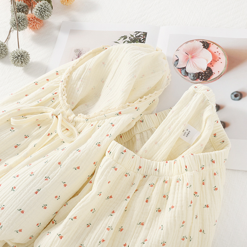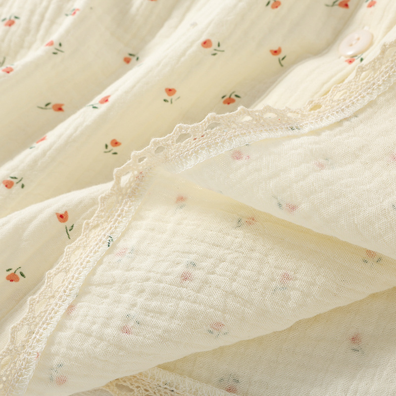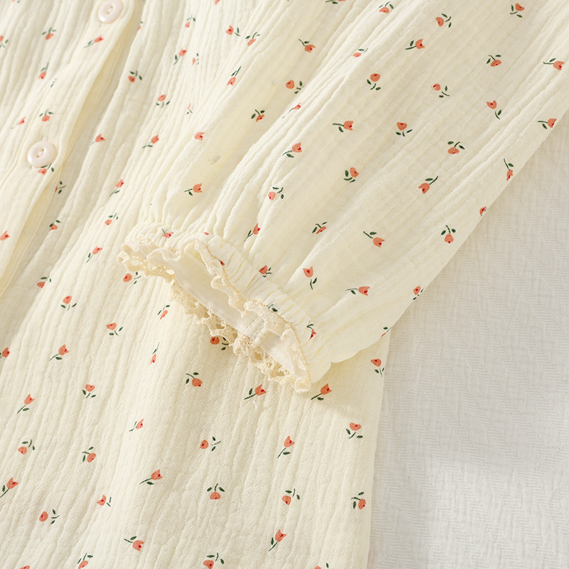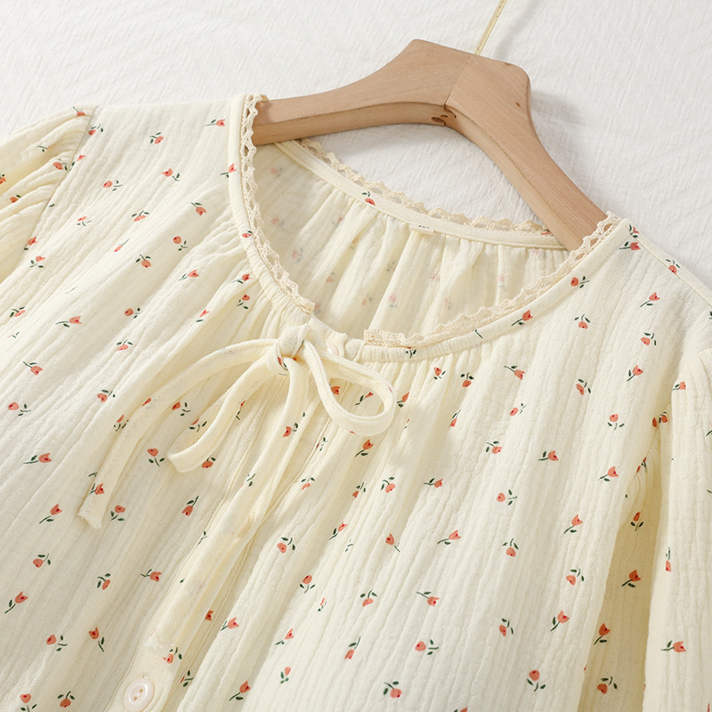 여성용 봄 가을 이중 순면 컵 소형 꽃무늬 크레이프 라운드넥 가디건 부드러운 여성 홈웨어 잠옷