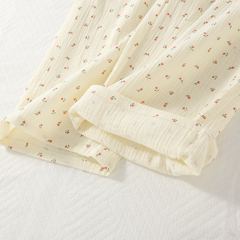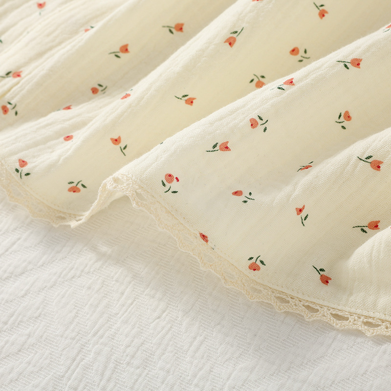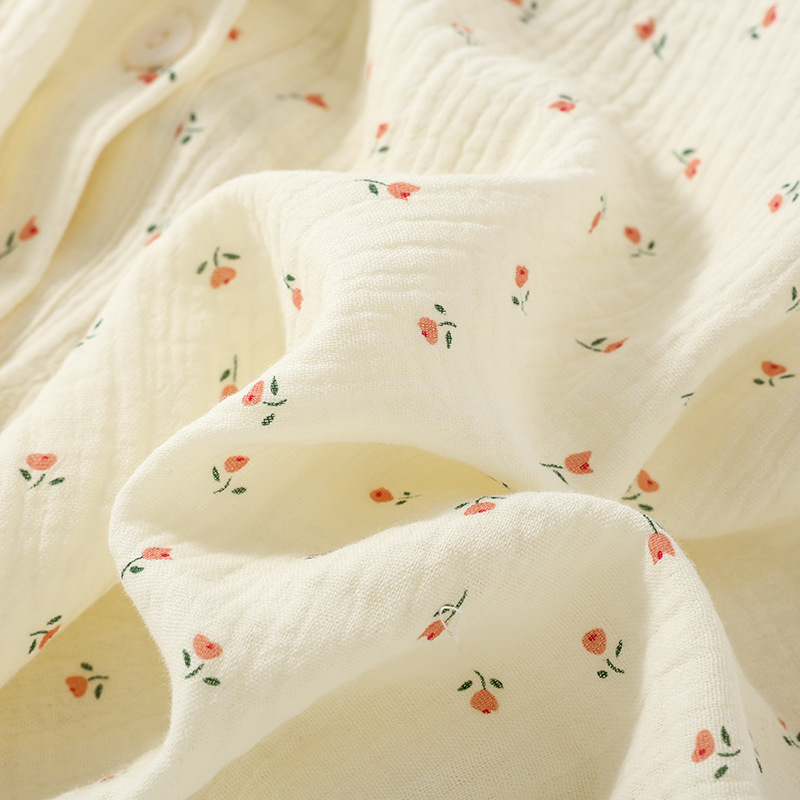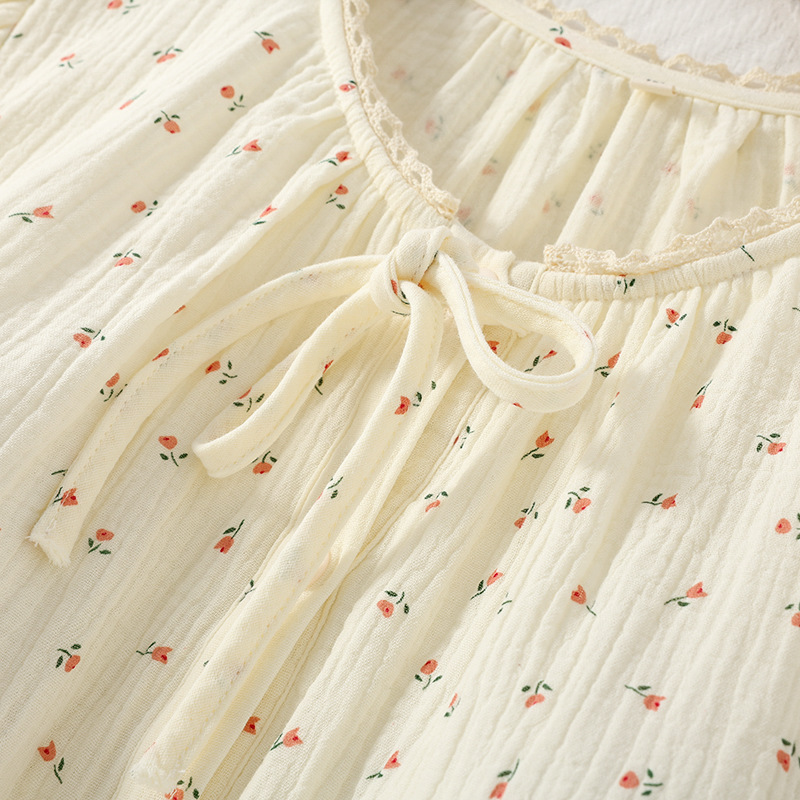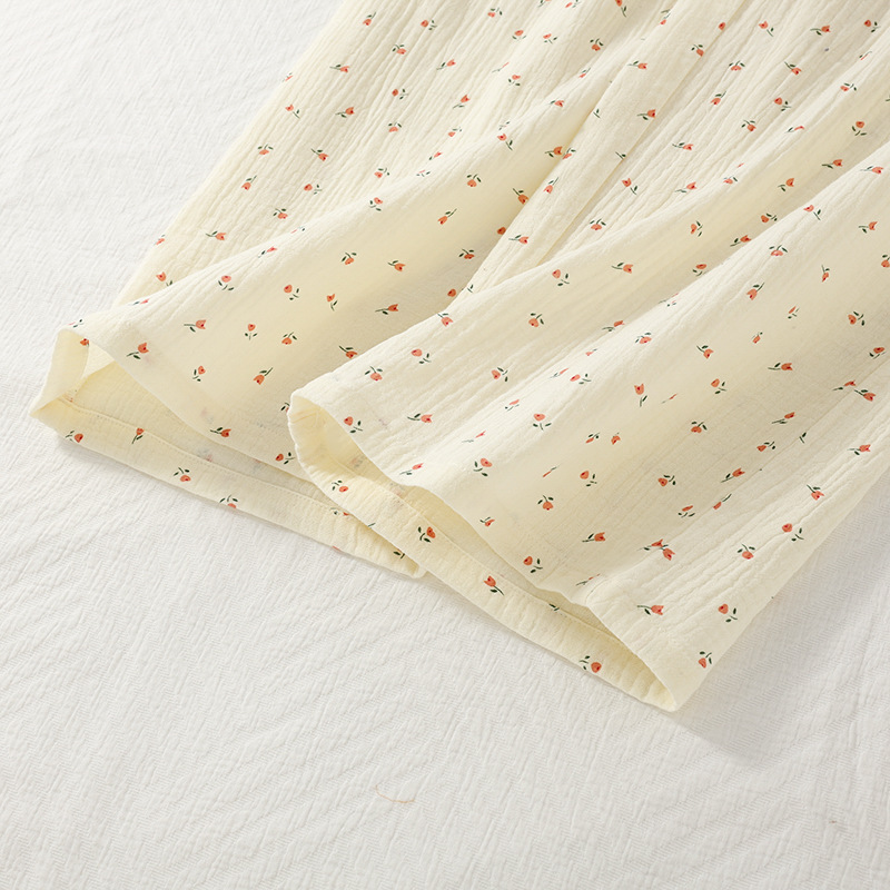여성용 봄 가을 이중 순면 컵 소형 꽃무늬 크레이프 라운드넥 가디건 부드러운 여성 홈웨어 잠옷