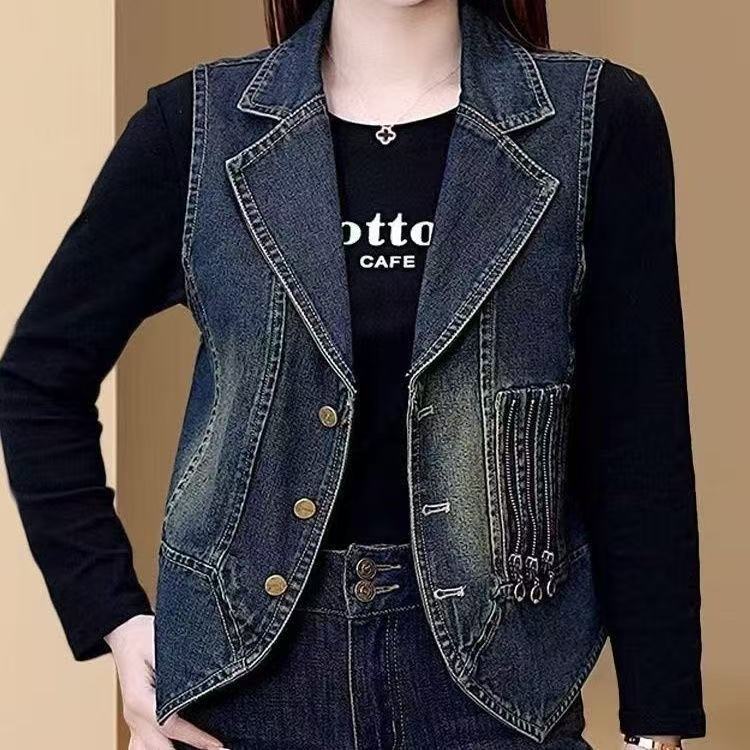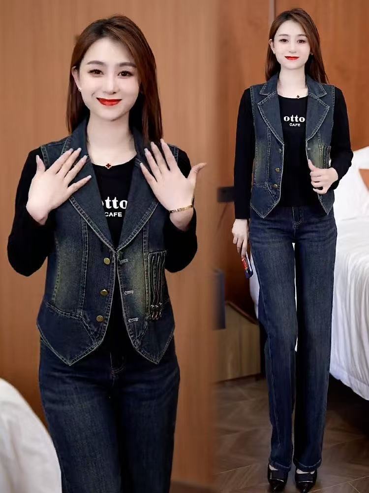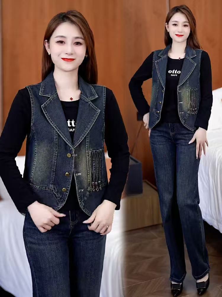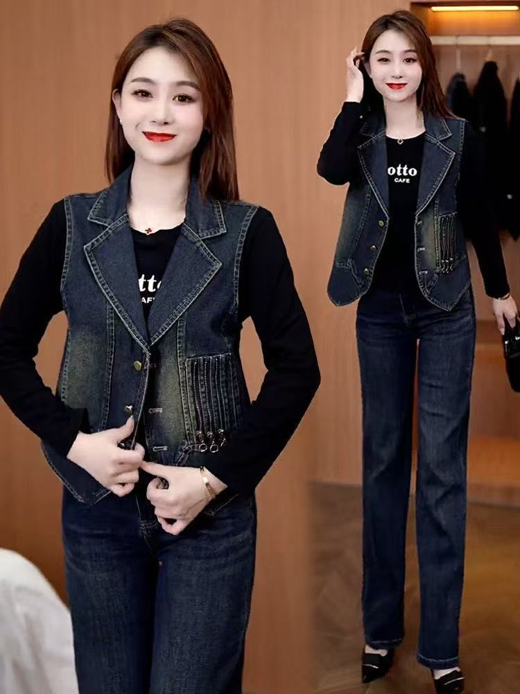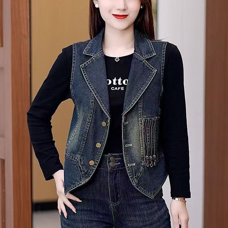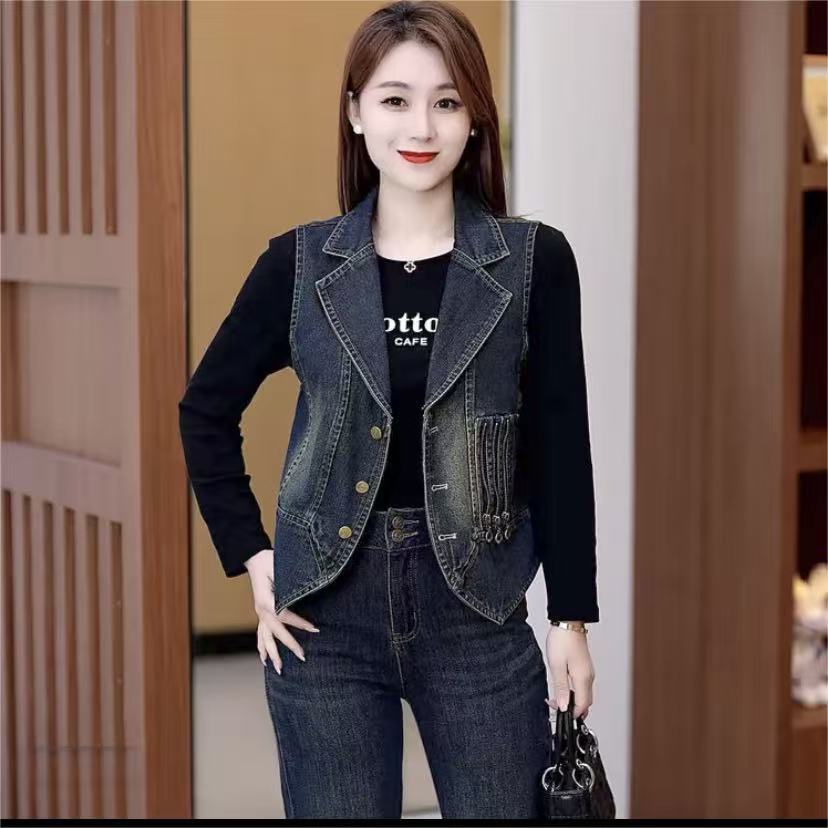 레트로 데님 조끼 여성용 2026 봄 신상 한국 스타일 패셔너블 슬림 디자인 민소매 라펠 데님 조끼스토어 가기