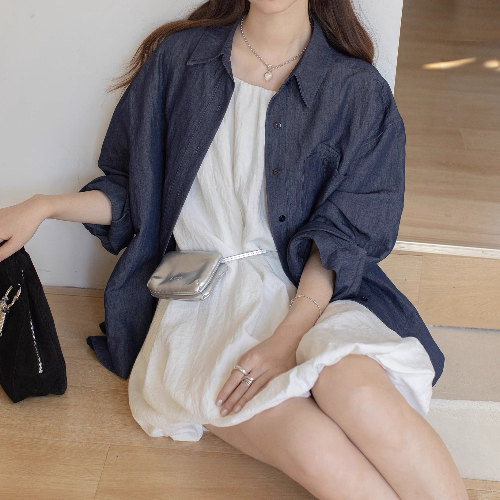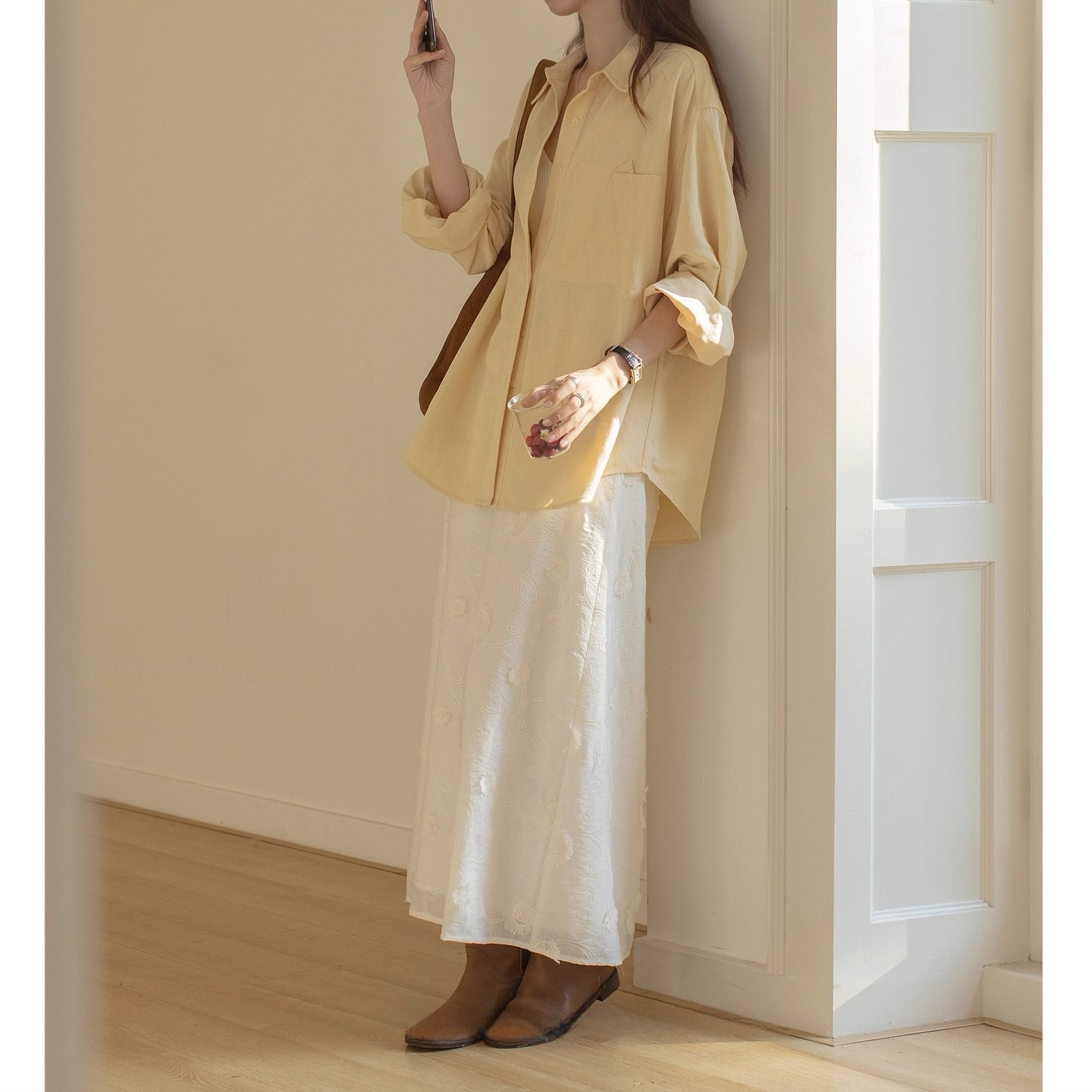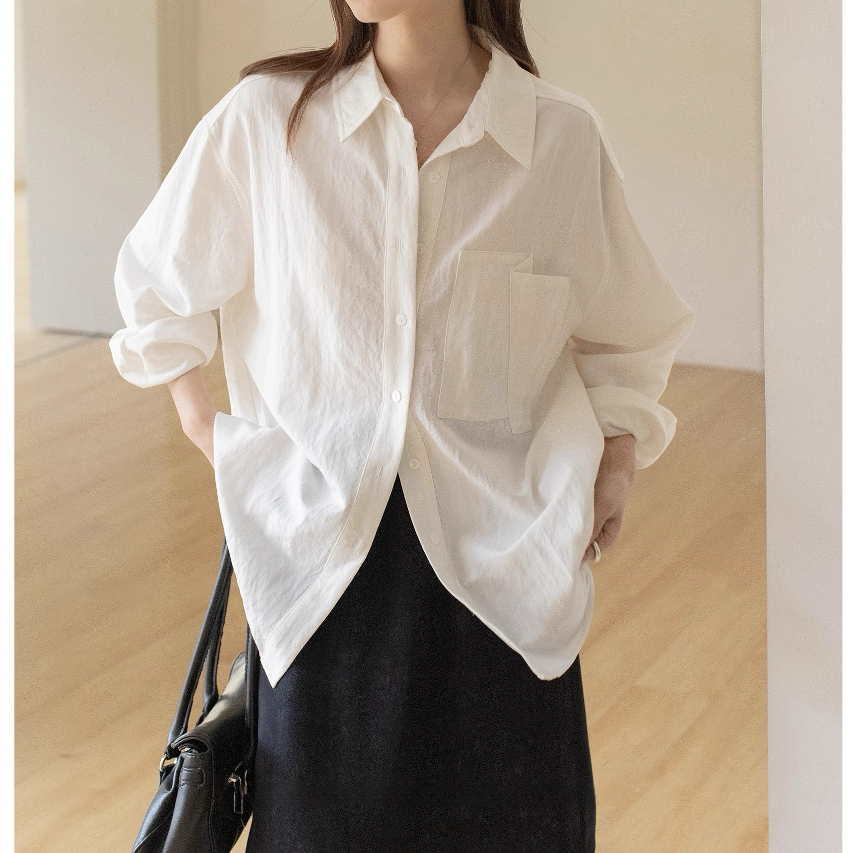 단색 간단한 옷깃 셔츠 여성의 봄과 여름 2025 새로운 캐주얼 대형 포켓 포장 긴 소매 탑스토어 가기