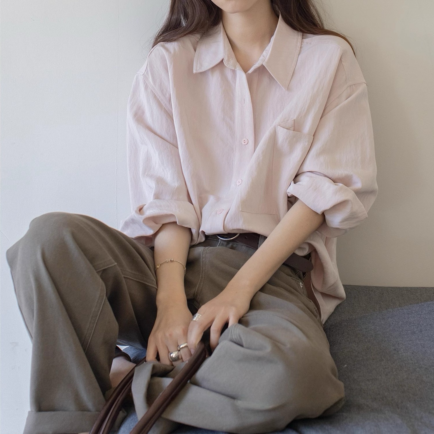 단색 간단한 옷깃 셔츠 여성의 봄과 여름 2025 새로운 캐주얼 대형 포켓 포장 긴 소매 탑