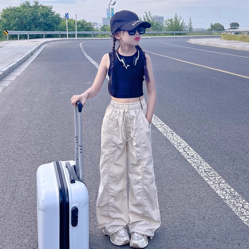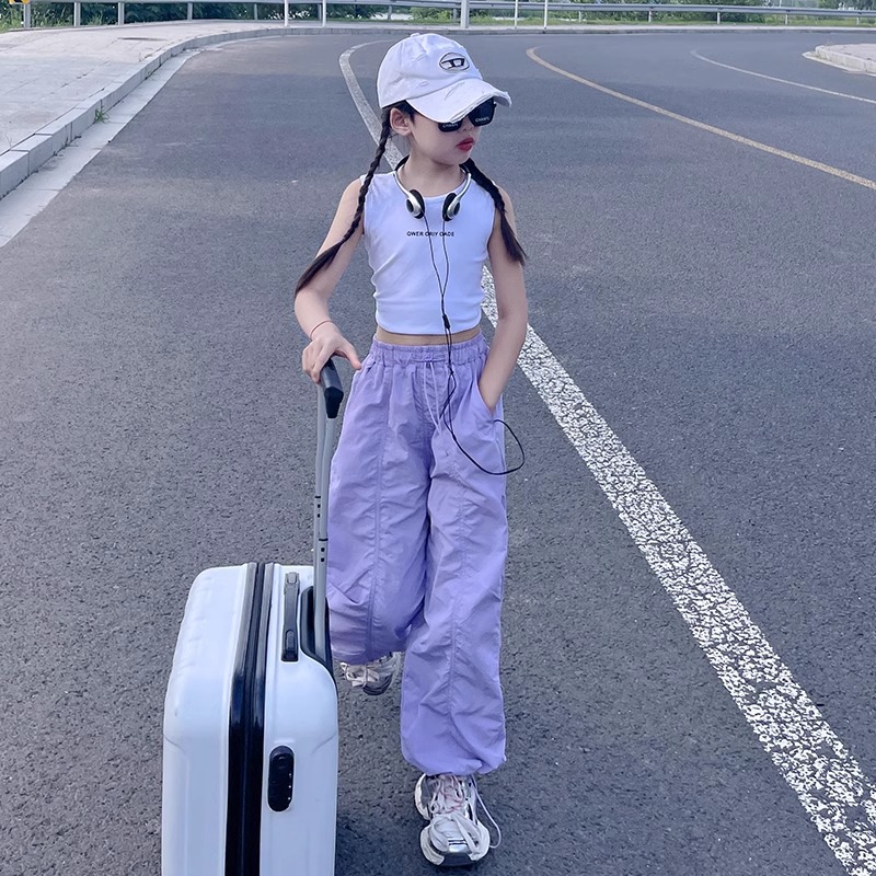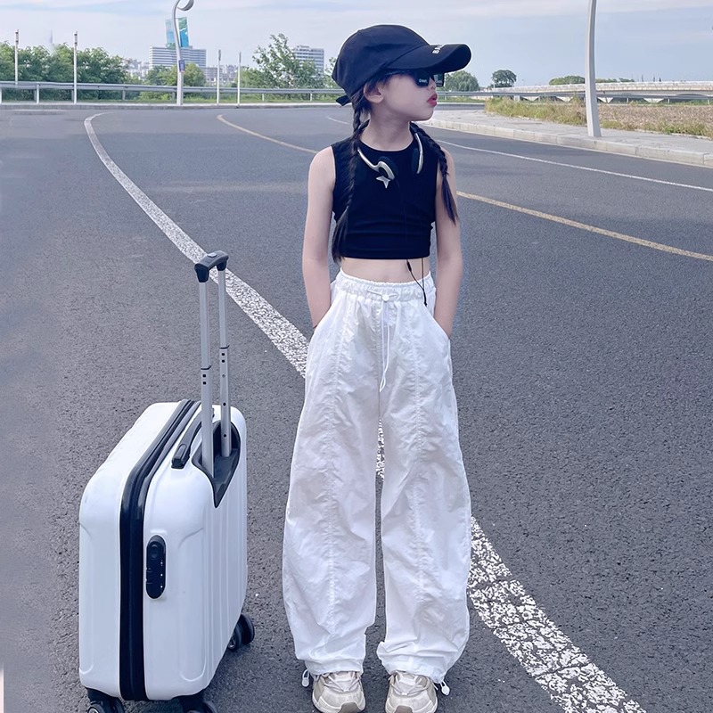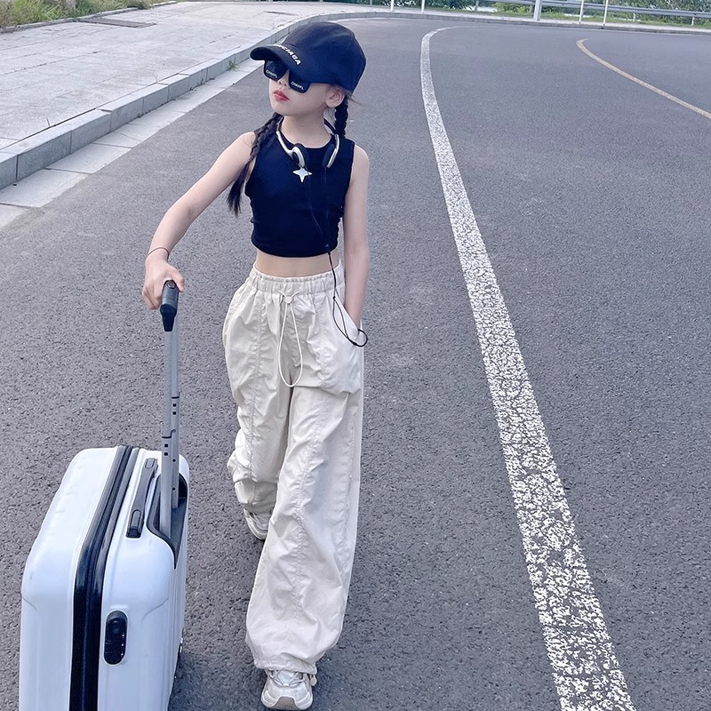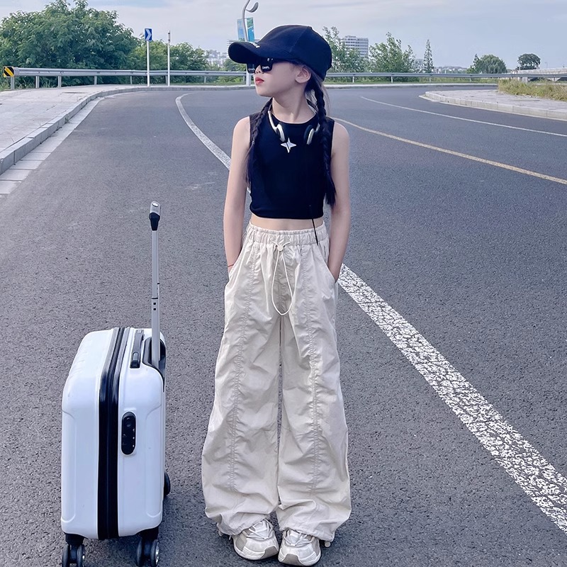 여자 캐주얼 바지 여름 2025 새로운 스타일 어린이 여름 착용 느슨한 스트레이트 튜브 아동복 작업복 긴 바지 아동복
