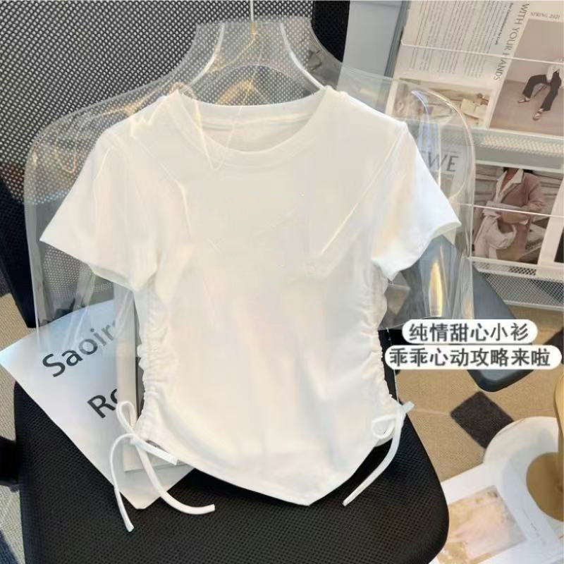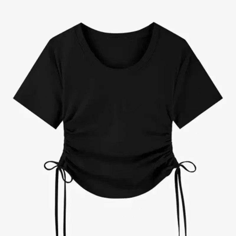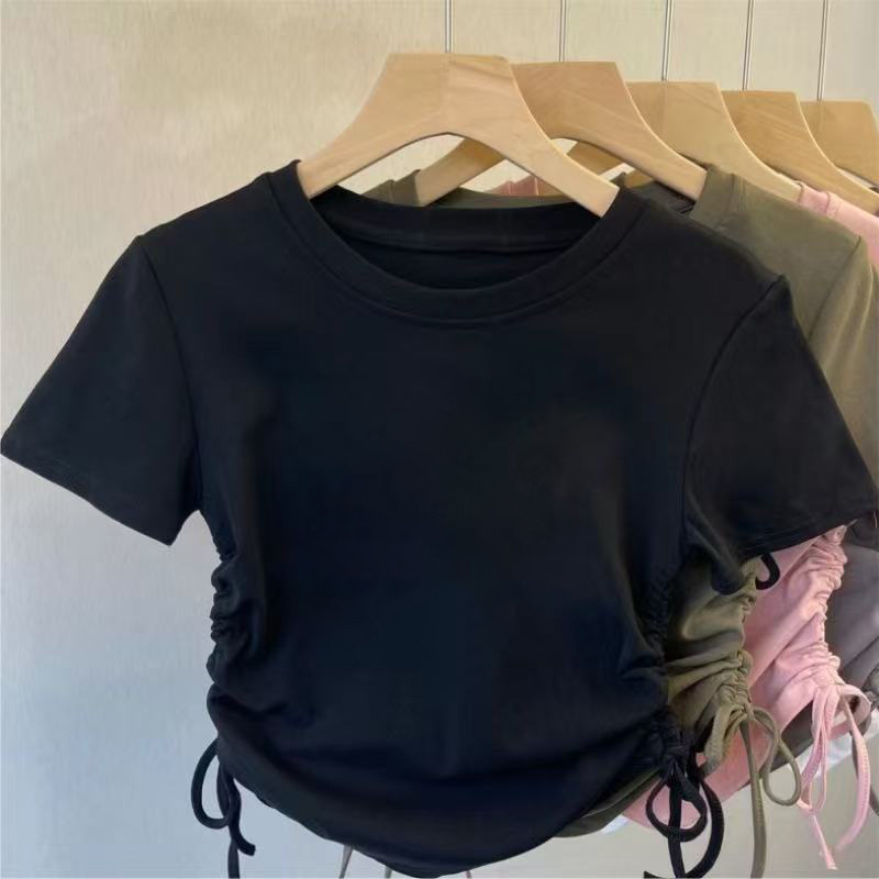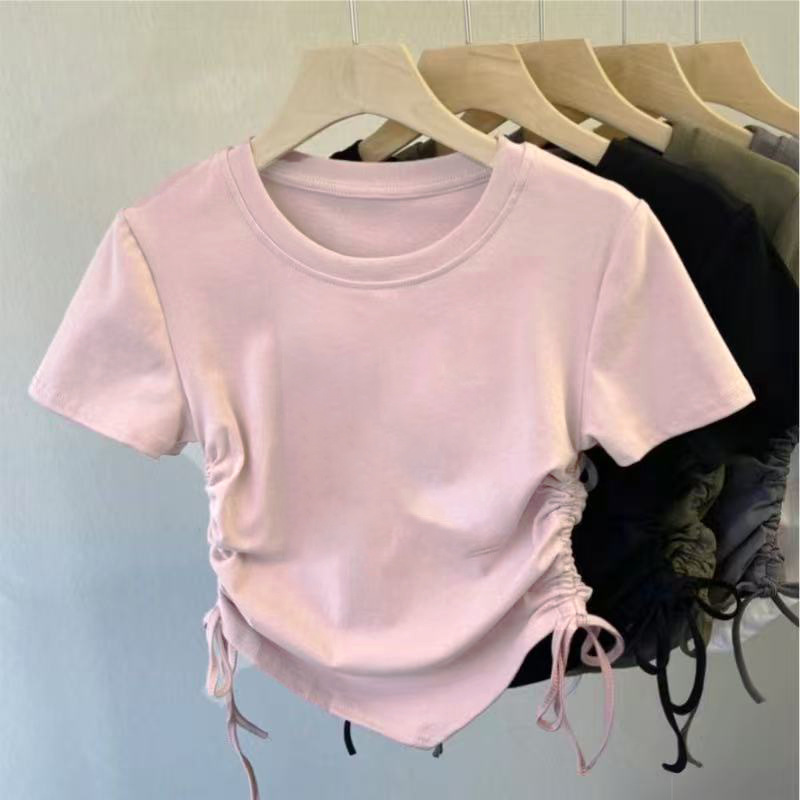 여아 여름 드로스트링 디자인 반팔 티셔츠 한국어 버전 트렌디 심플 쇼트 라운드 넥 솔리드 컬러 탑