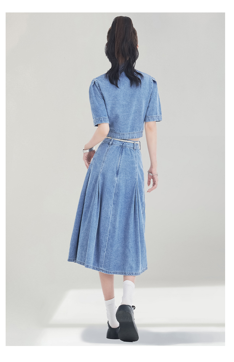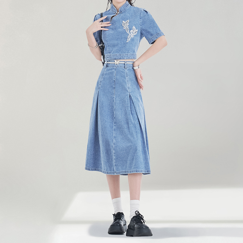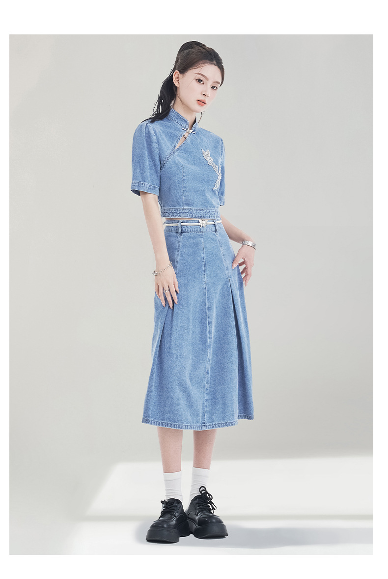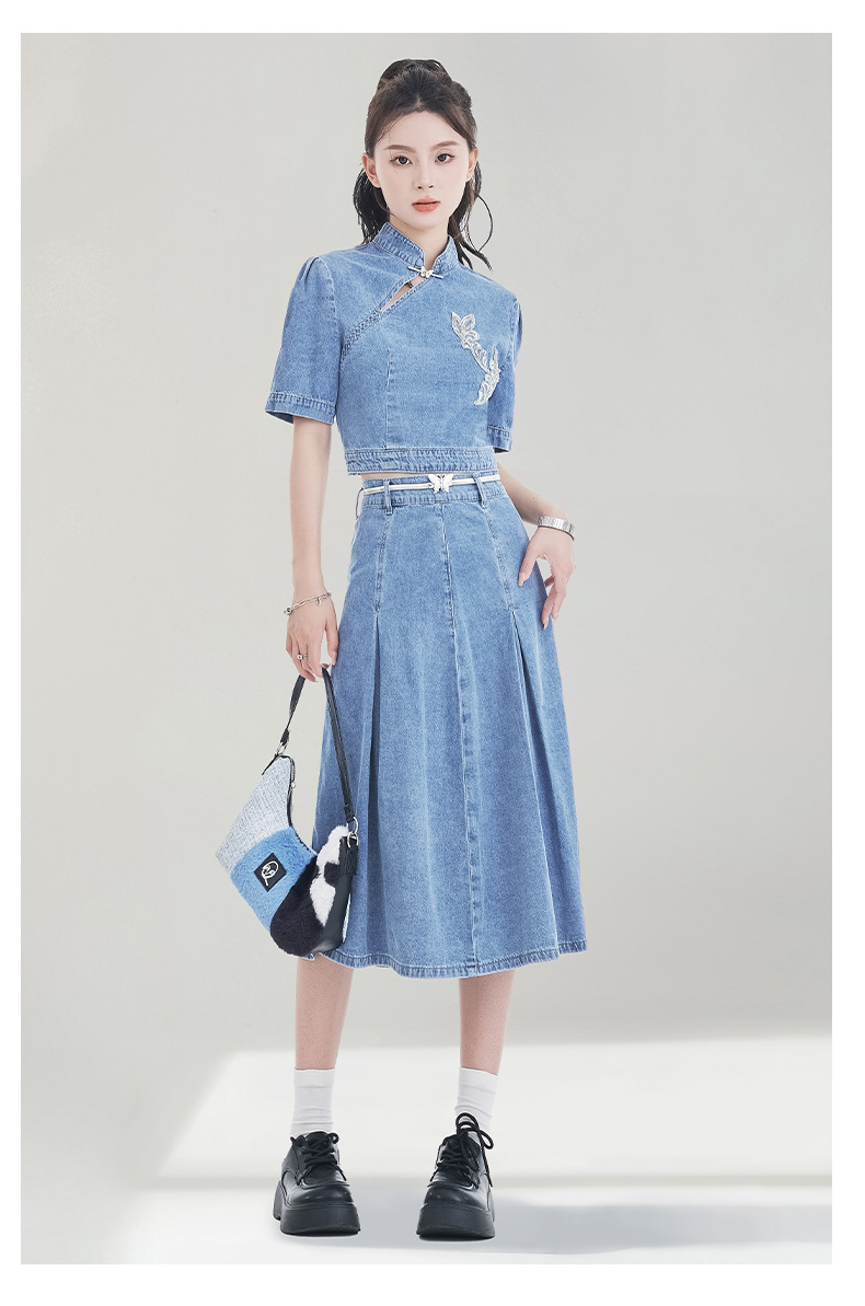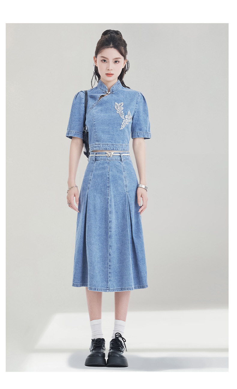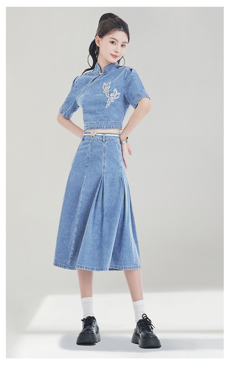 레트로 블루 데님 정장 스커트 여성용 2026년 여름 신상 중국풍 자수 하이웨이스트 플리츠 스커트 다용도 활용 가능