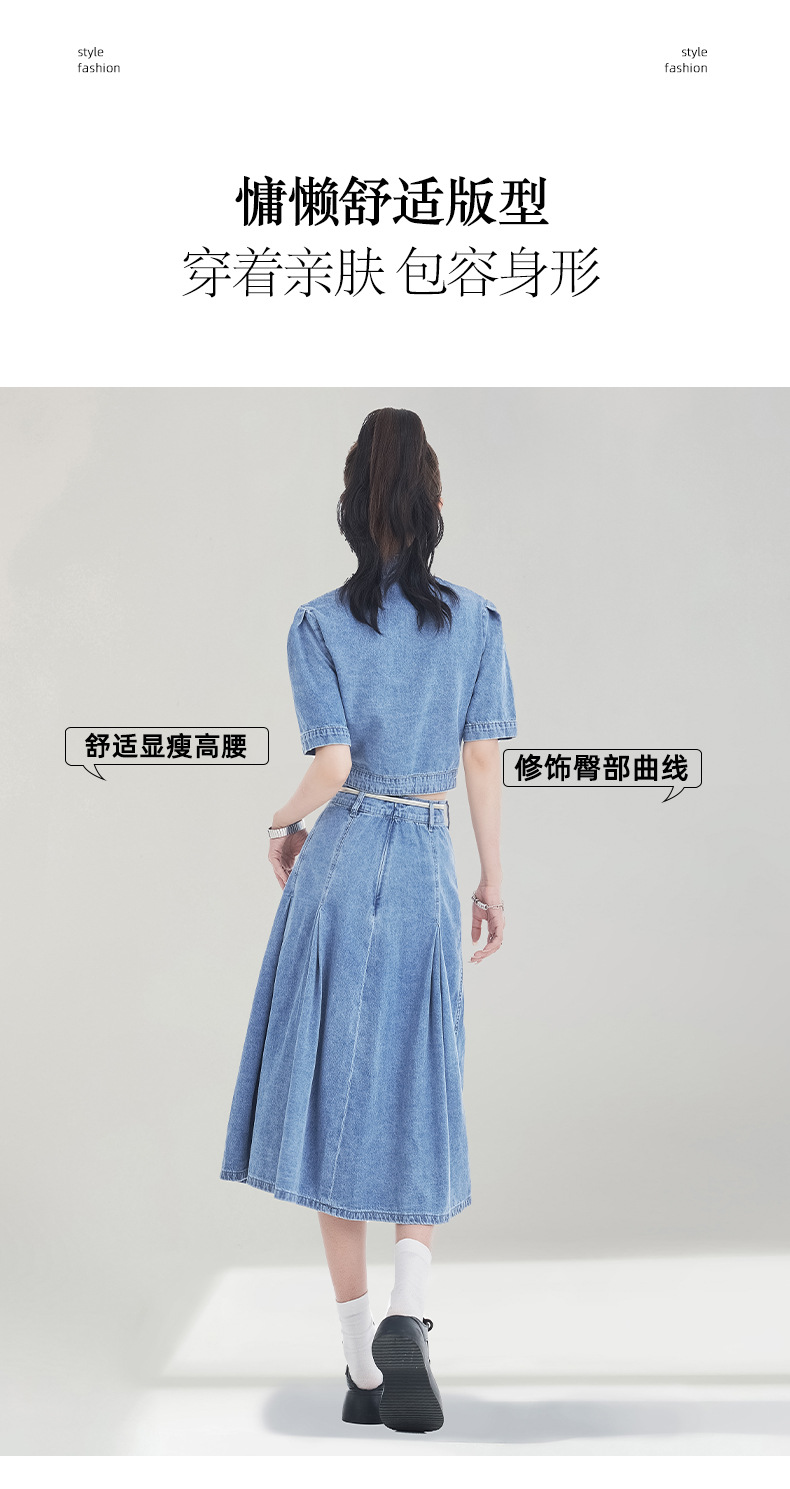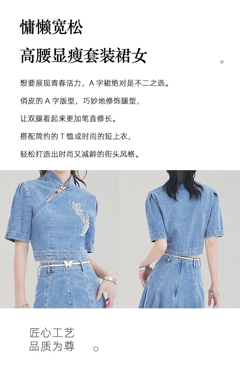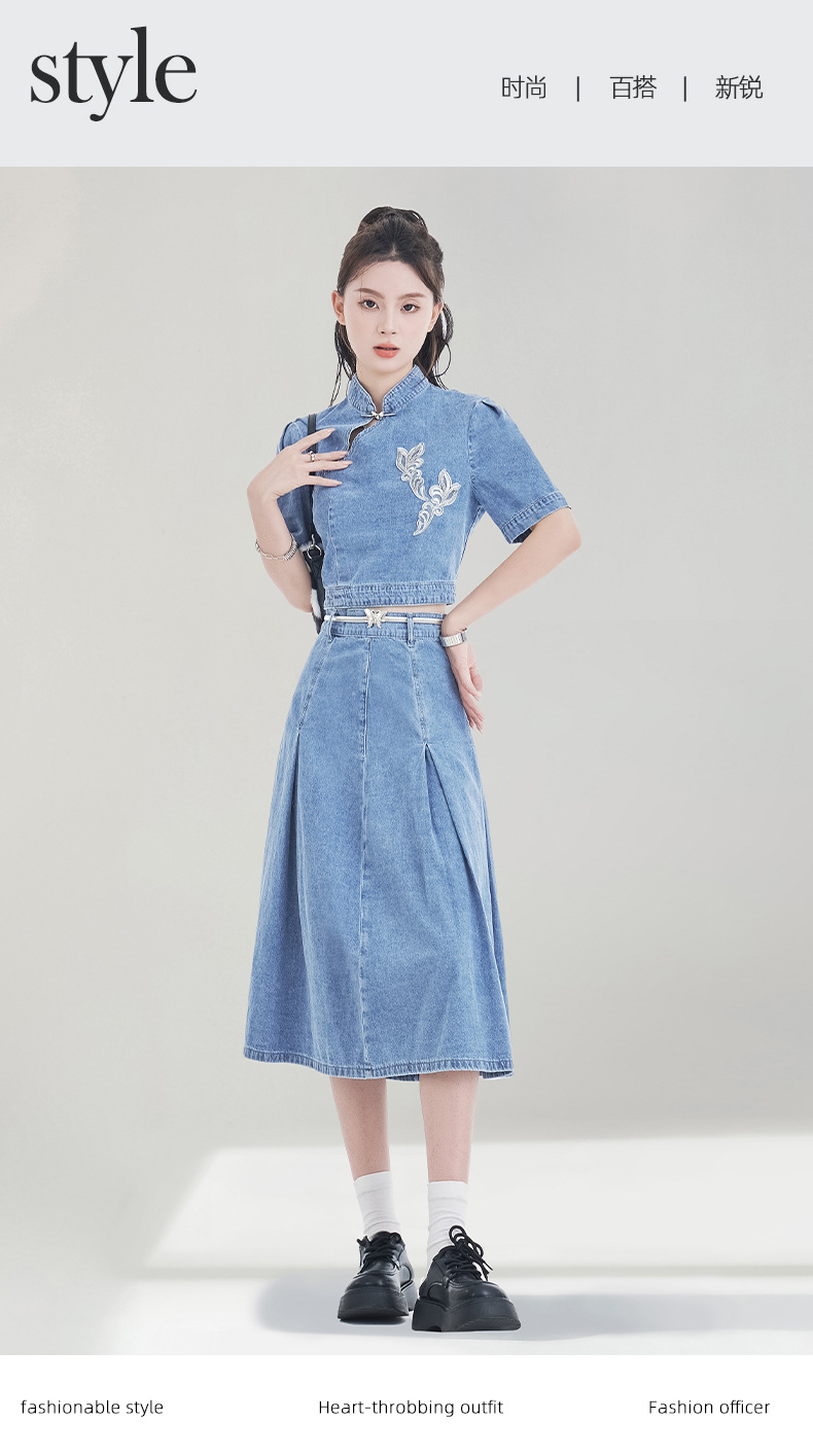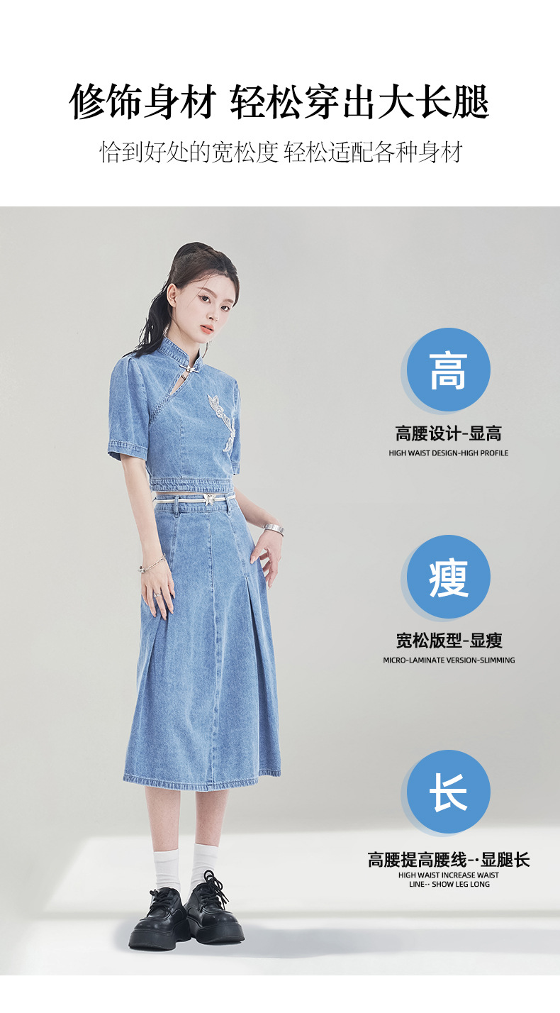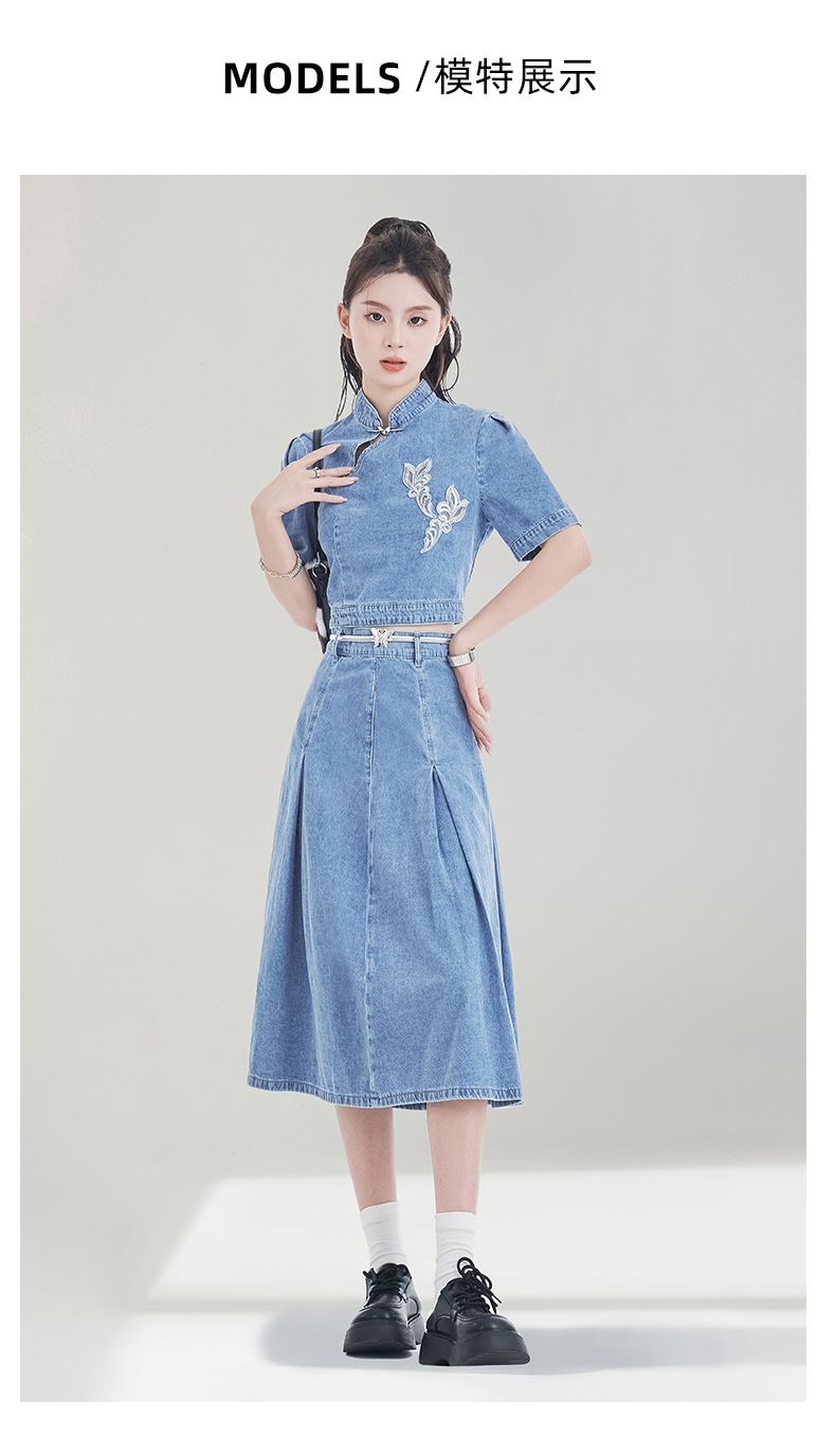 레트로 블루 데님 정장 스커트 여성용 2026년 여름 신상 중국풍 자수 하이웨이스트 플리츠 스커트 다용도 활용 가능스토어 가기